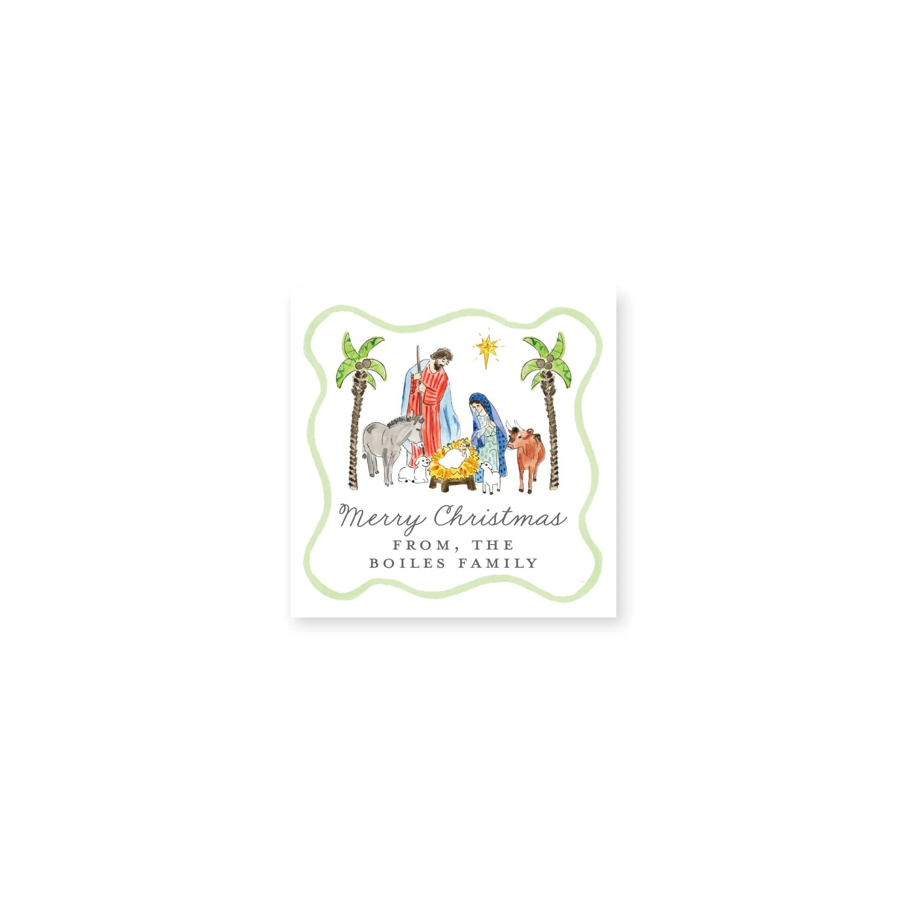Our Holy Family Nativity Christmas Gift Stickers features our watercolor of Jesus in the manger with a few farm animals. It will be beautiful on any package!