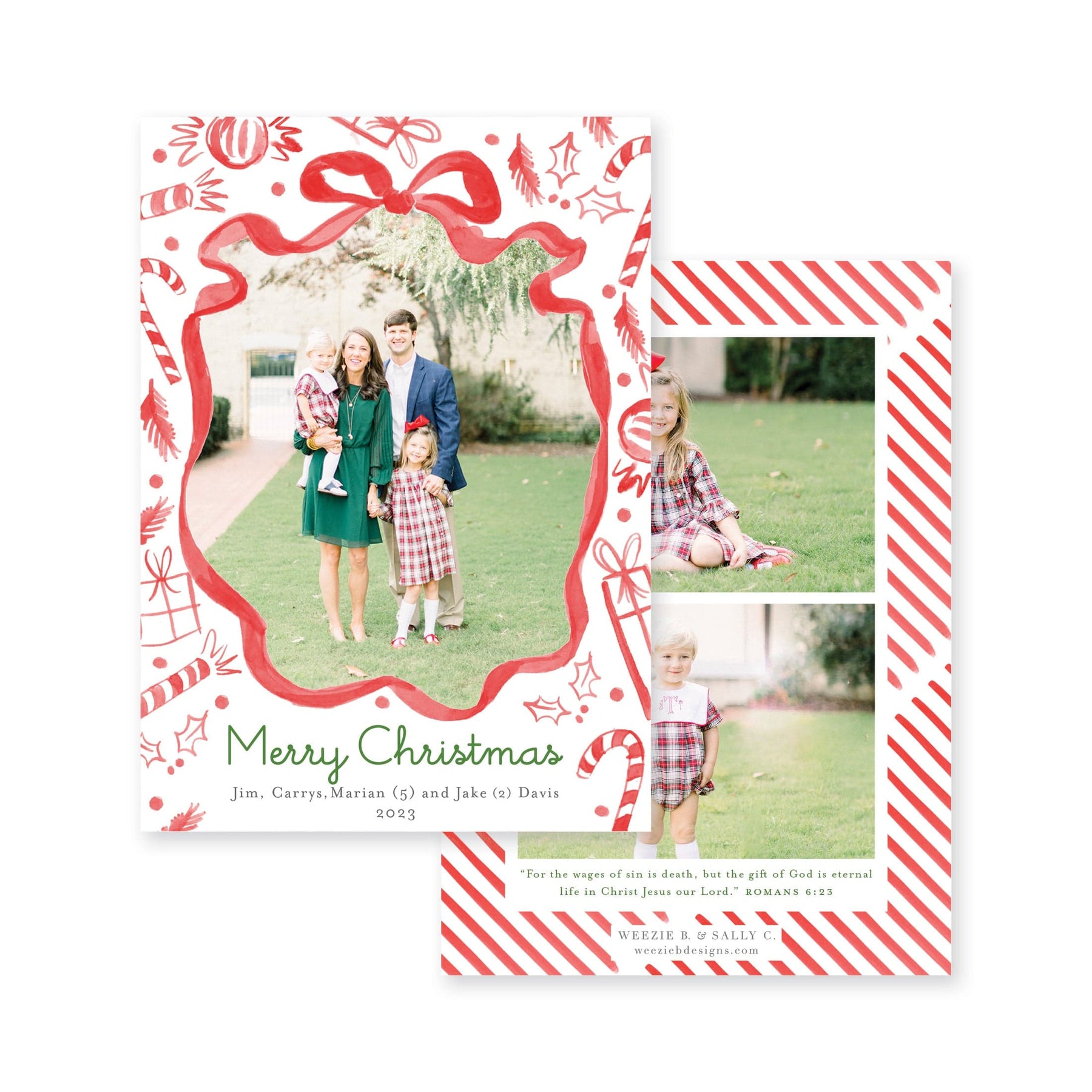 Our Christmas Candy Vertical Christmas Card features our watercolor Christmas candies and other items like gifts and holly with a ribbon frame for your photos. Available in red or green with watercolor stripes on the back with 0-4 photos.
