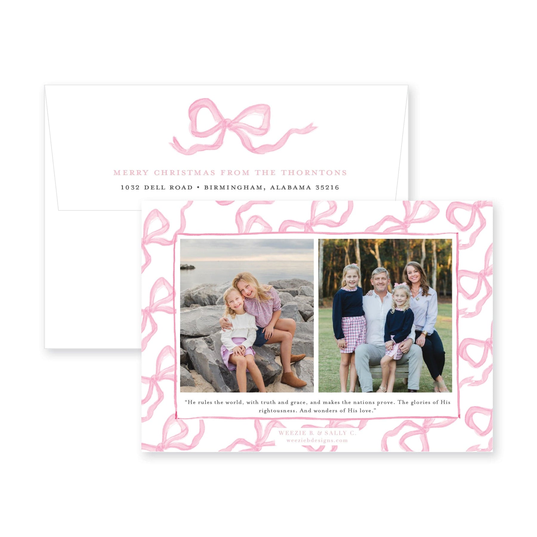Our Bouncing Bows Horizontal Christmas Card features our whimsical watercolor bow with a matching border, with your photo featured in the center. Choose from red, pink or green border and add up to 1-4 photos on the back!