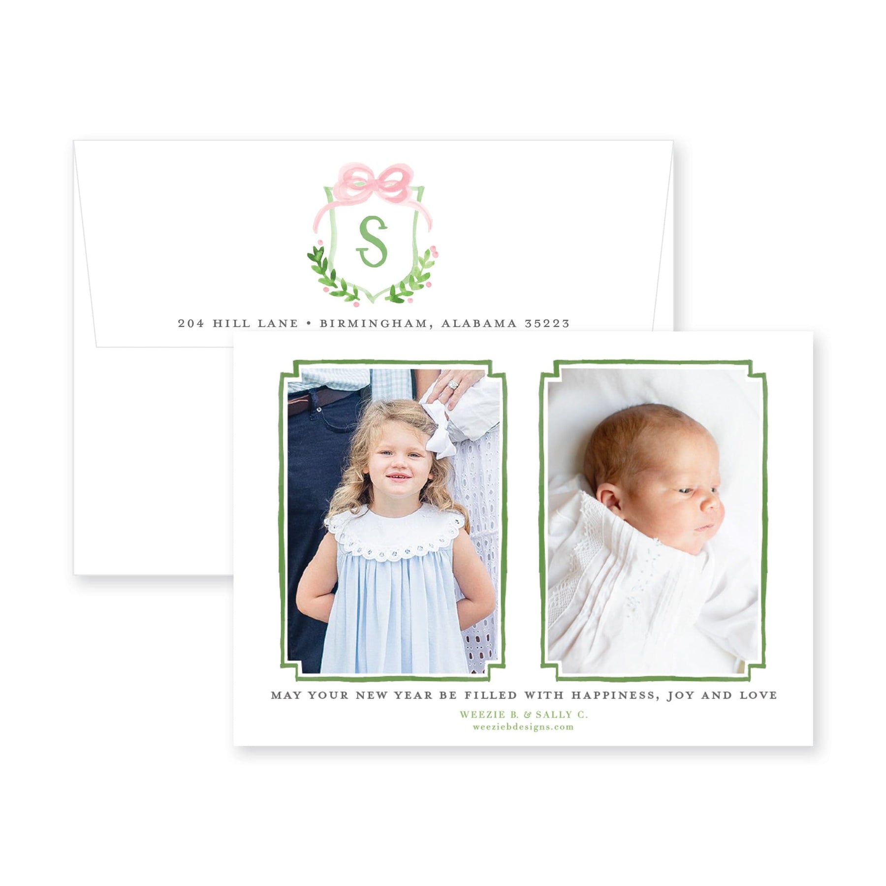 Our Watercolor Crest with Big Bow Horizontal Christmas Card features your photo on the front framed in a watercolor green framed topped with our beautiful crest with a watercolor initial monogram. The back of this card can feature 0-4 images. Bible verse can be added, changed or switched to a phrase.