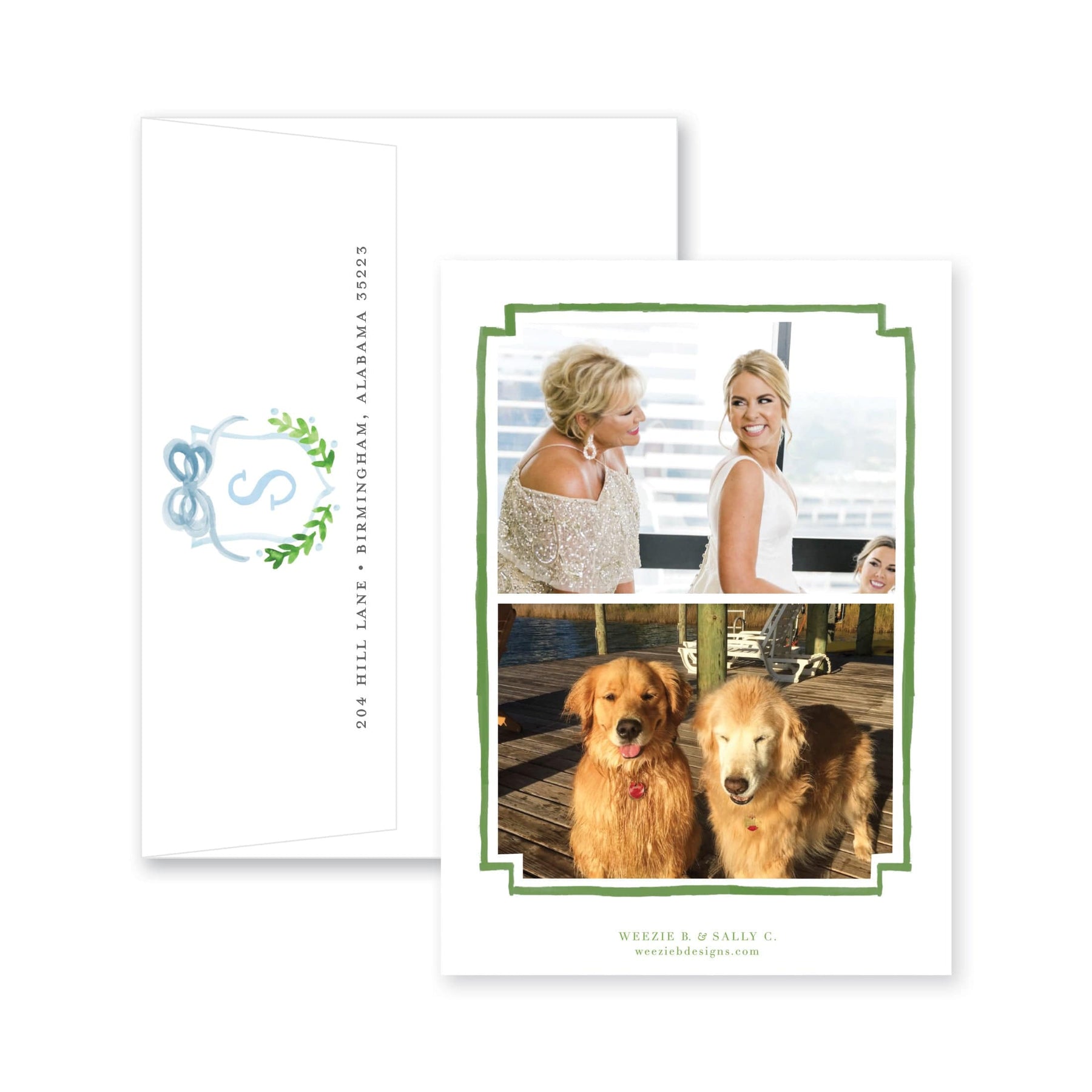 Our Watercolor Crest with Big Bow Vertical Christmas Card features your photo on the front framed in a watercolor green framed topped with our beautiful crest with a watercolor initial monogram. The back of this card can feature 0-4 images. Bible verse can be added, changed or switched to a phrase.