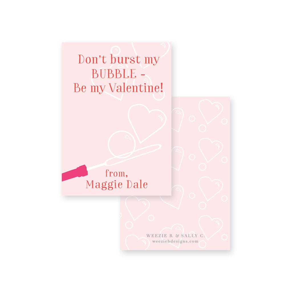 Our Bubbles Valentine's Day cards are a favorite with all children! This design is so fun attached to a small treat or bubble tube. This design comes in two color options, pink and blue!