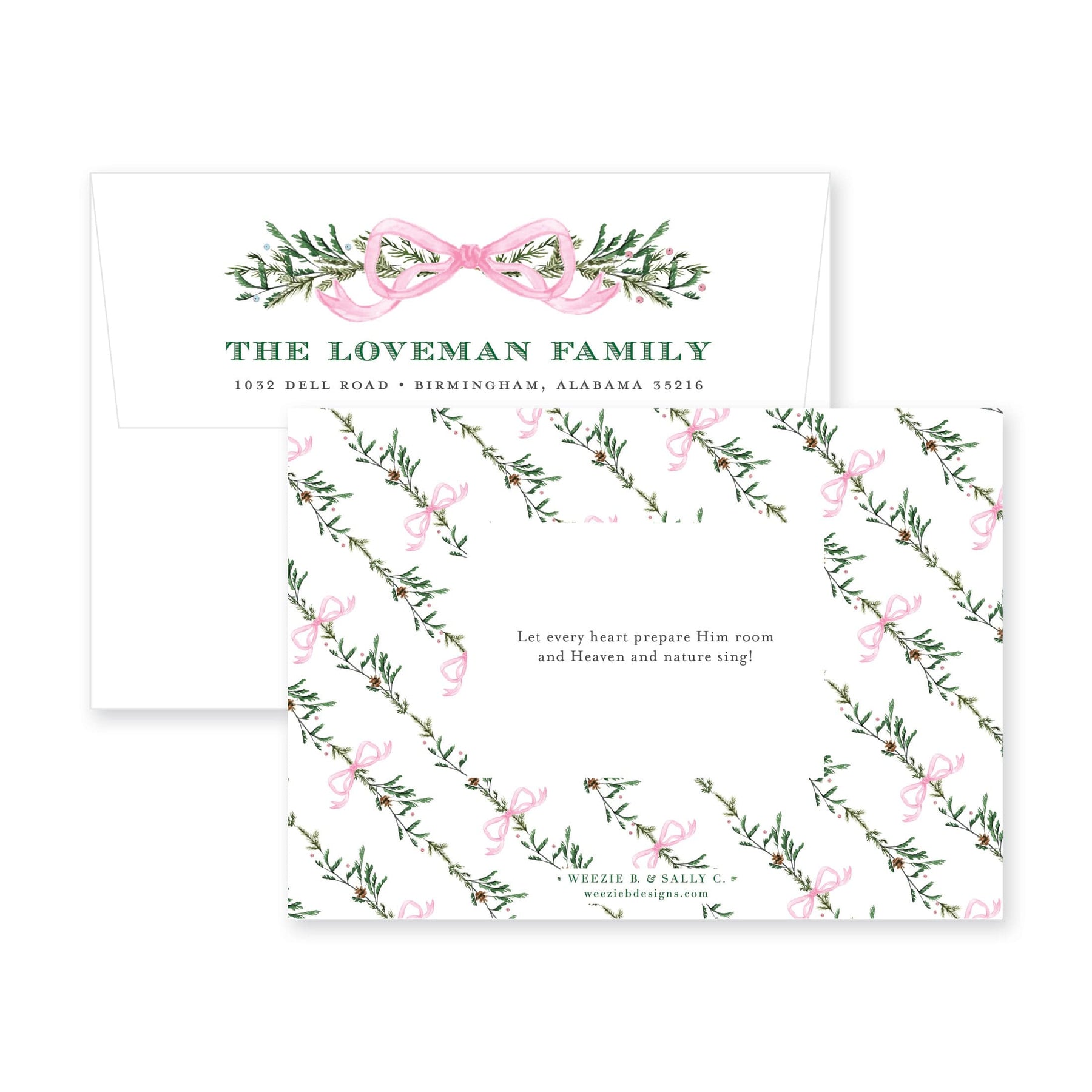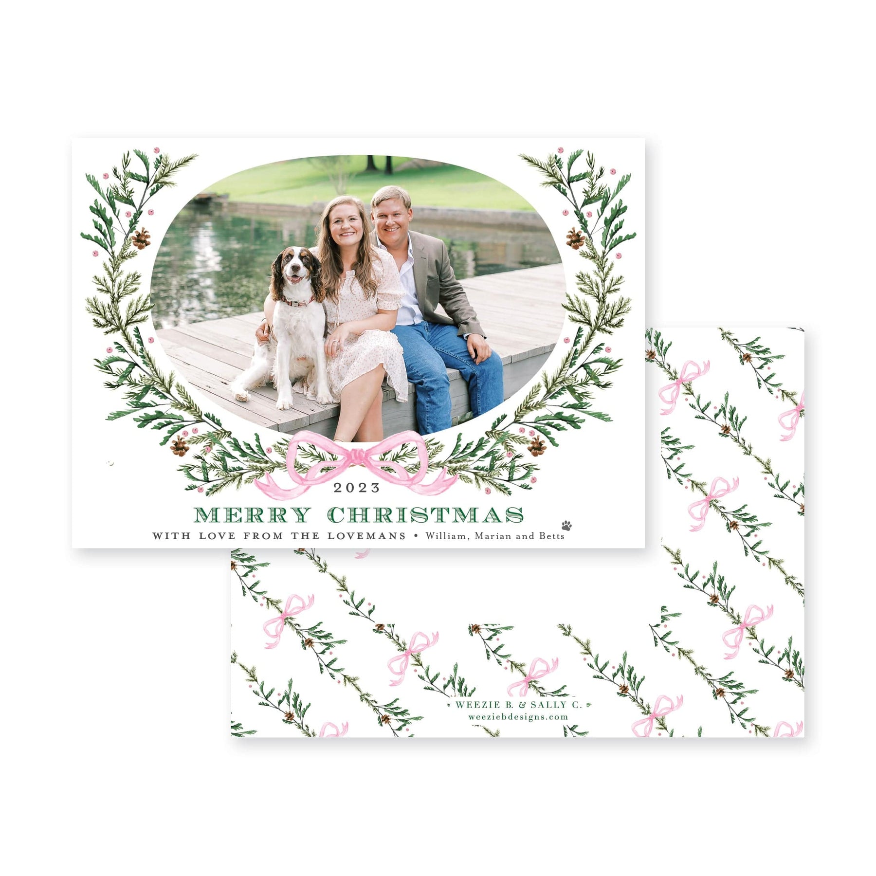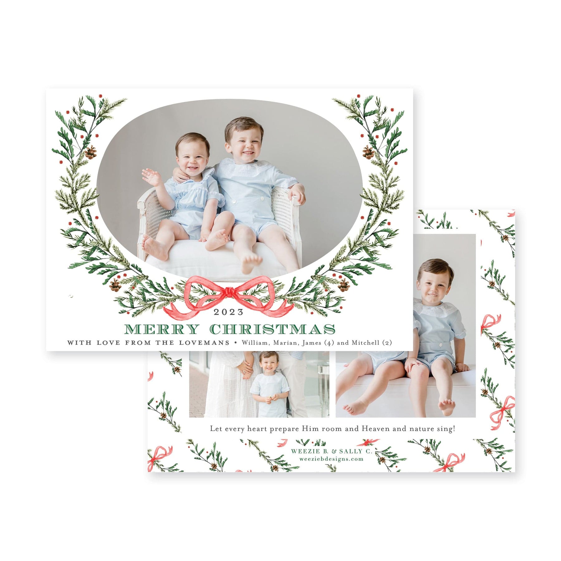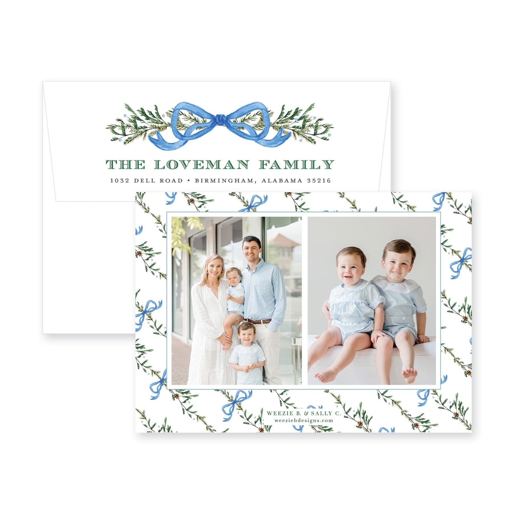 Our Elegant Evergreen Christmas Card features your photo on the front framed in our watercolor evergreen branches, pine cones and berries with a blue, pink, red bow. The back of this card can feature 0-4 images. Bible verse can be added, changed or switched to a phrase.