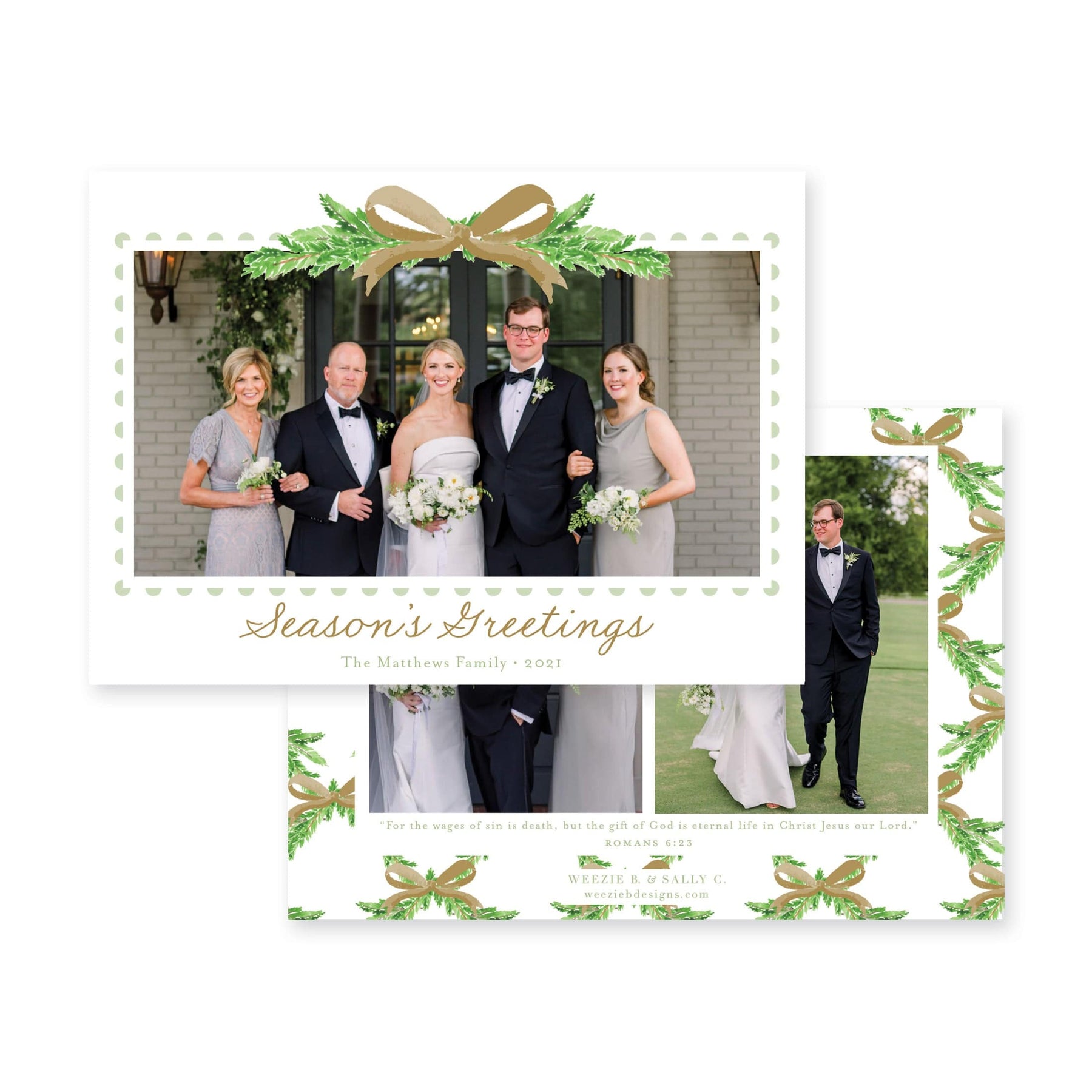 Our Evergreen Branch Horizontal Christmas Card features your photo on the front framed in our watercolor fraser fir evergreen pine branches with a red, light blue, blue, gold or light pink bow.