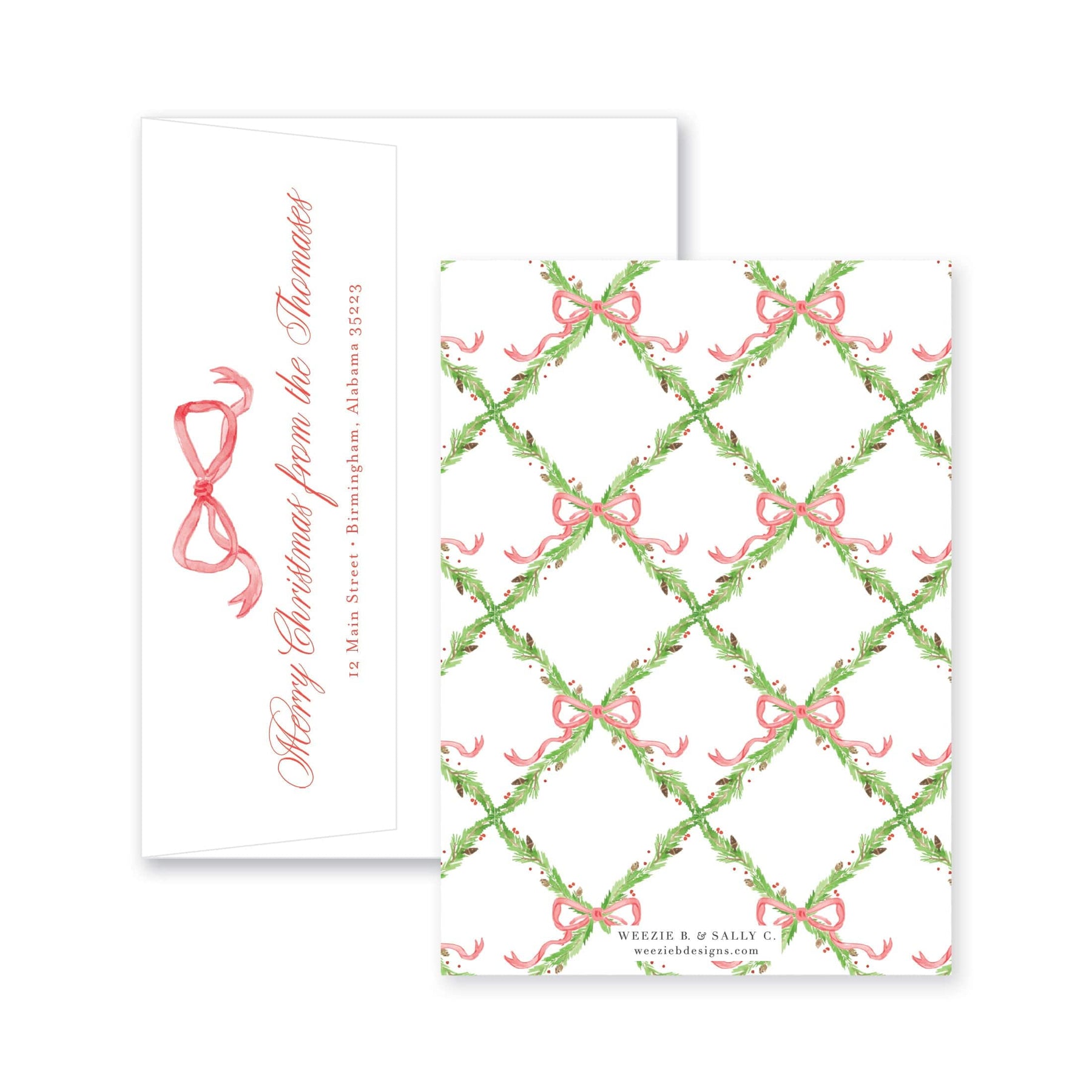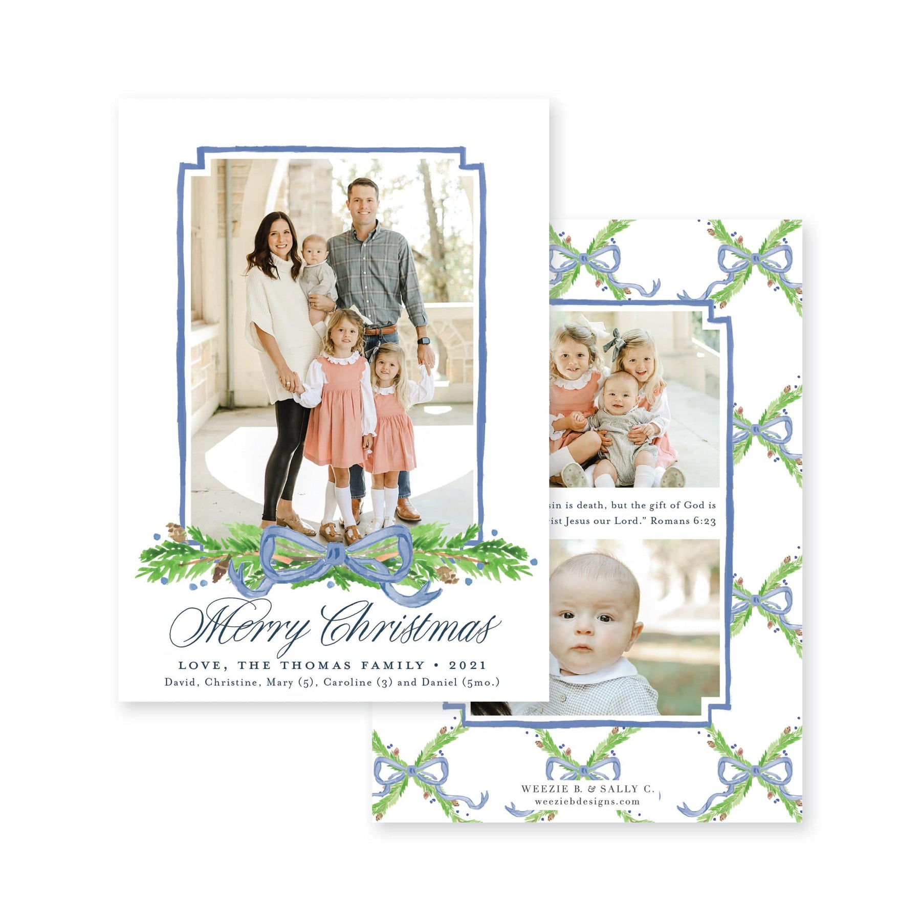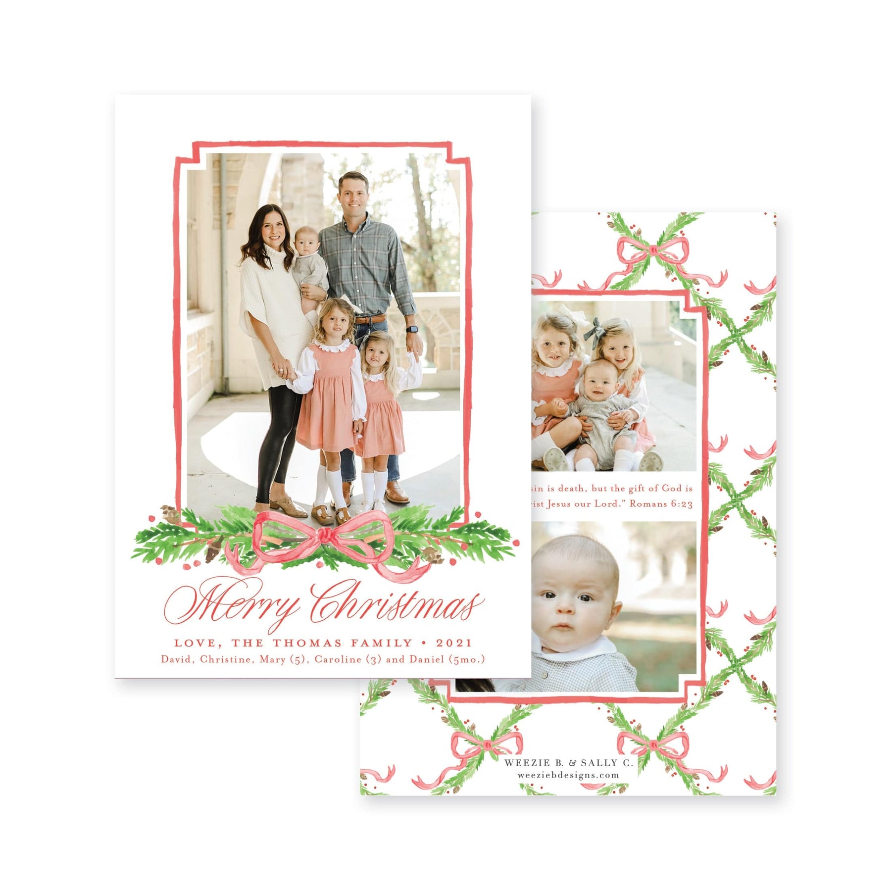 Our Pine Trellis Vertical Christmas Card features your photo on the front in half watercolor pine trellis laurel tied with a bow. The back of this card can feature 1-4 images.