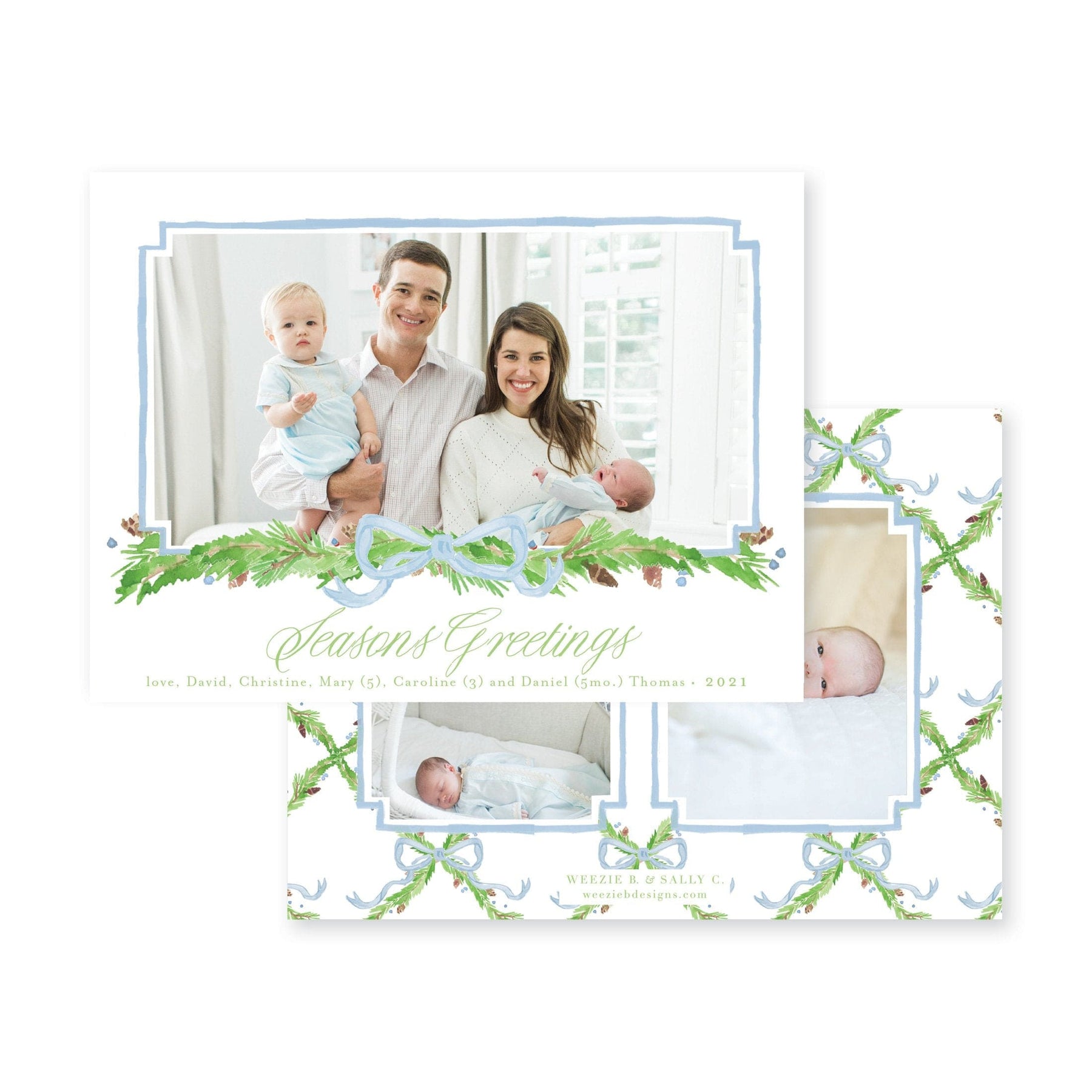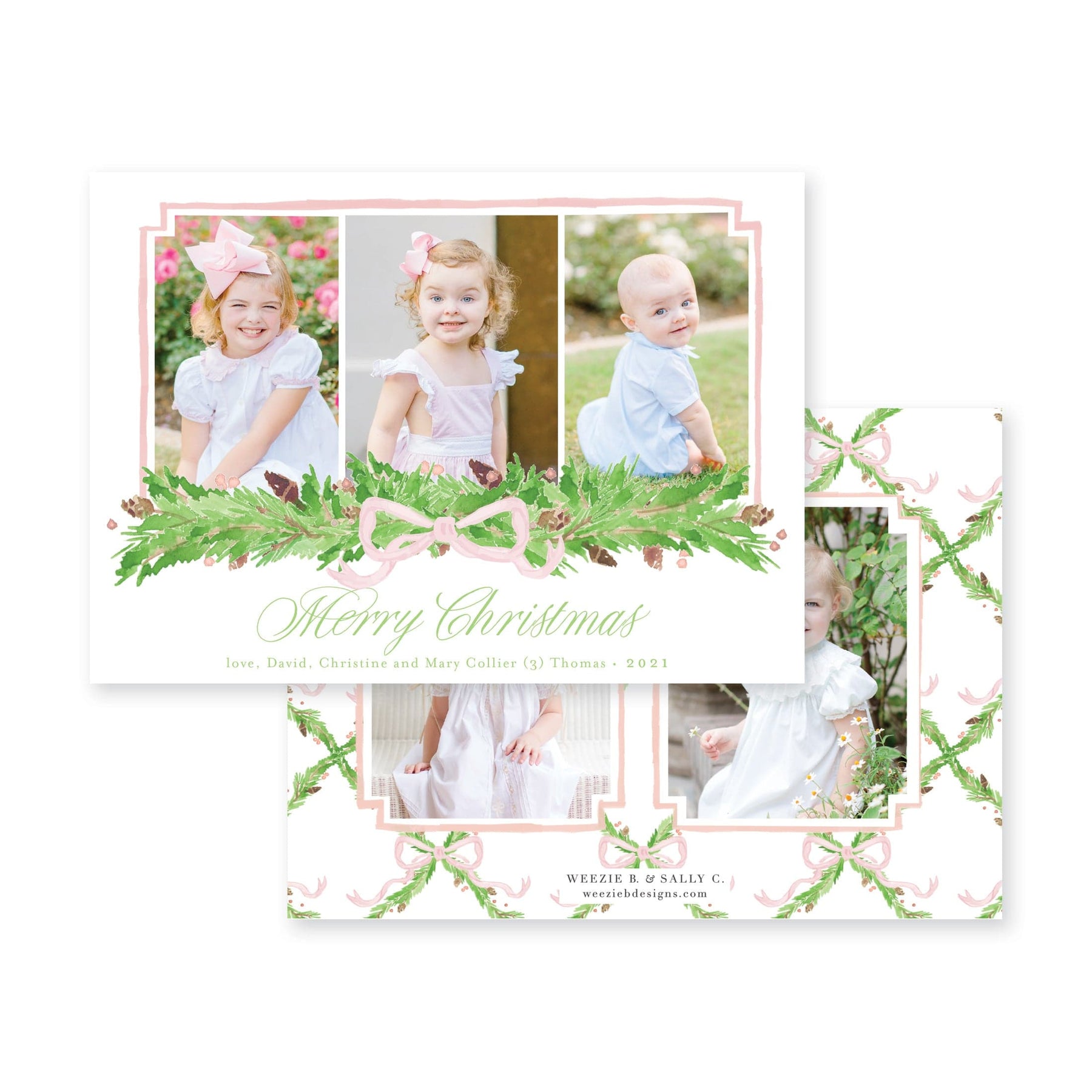 Our Pine Trellis Horizontal Christmas Card features your photo on the front in half watercolor pine trellis laurel tied with a bow. The back of this card can feature 0-4 images.