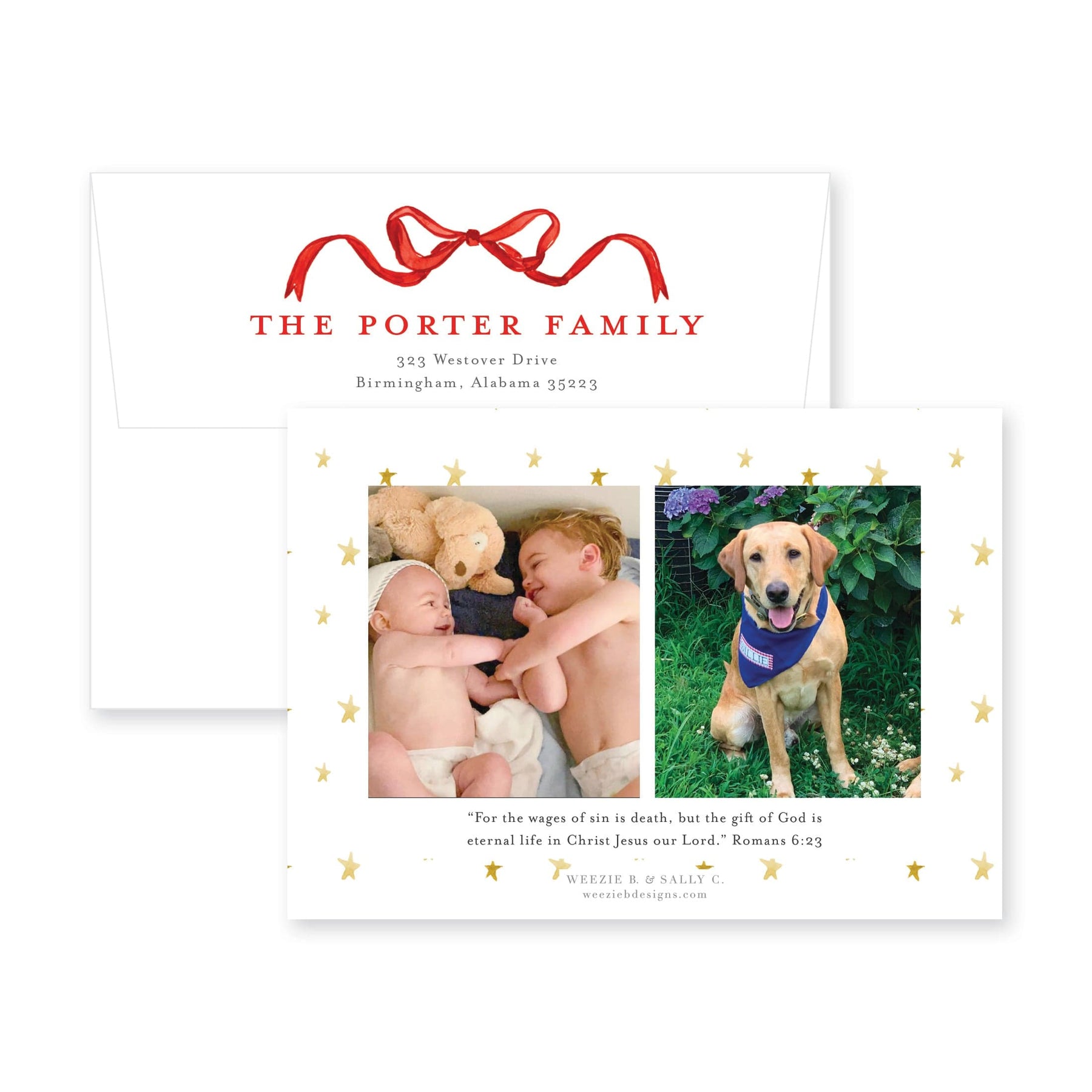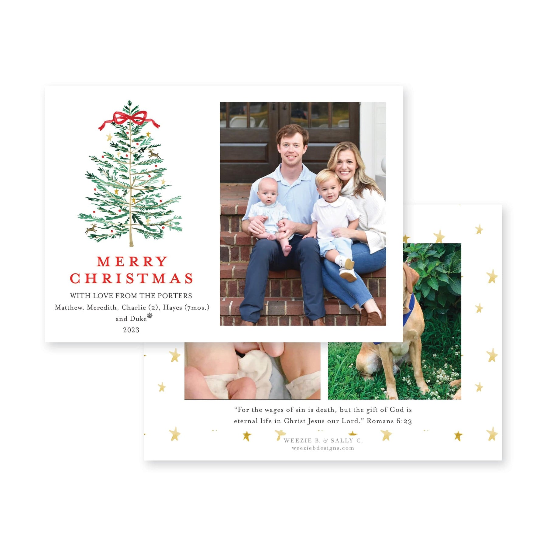 Oh Christmas Tree, oh Christmas Tree, how lovely are your branches! Our Sprightly Christmas Tree Horizontal Christmas Card features an evergreen tree topped with a bow in red, gold or blue, decorated and beautiful next to your photo. Add 0-4 photos to the back of this elegant card.