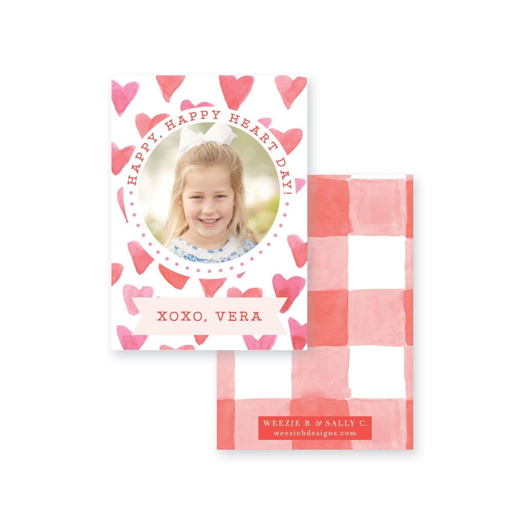 Our Watercolor Gingham Photo Valentine's Day cards feature your little Valetine's photo with watercolor hot pinks and reds and cuteness! This design is so fun attached to a toy or a treat!