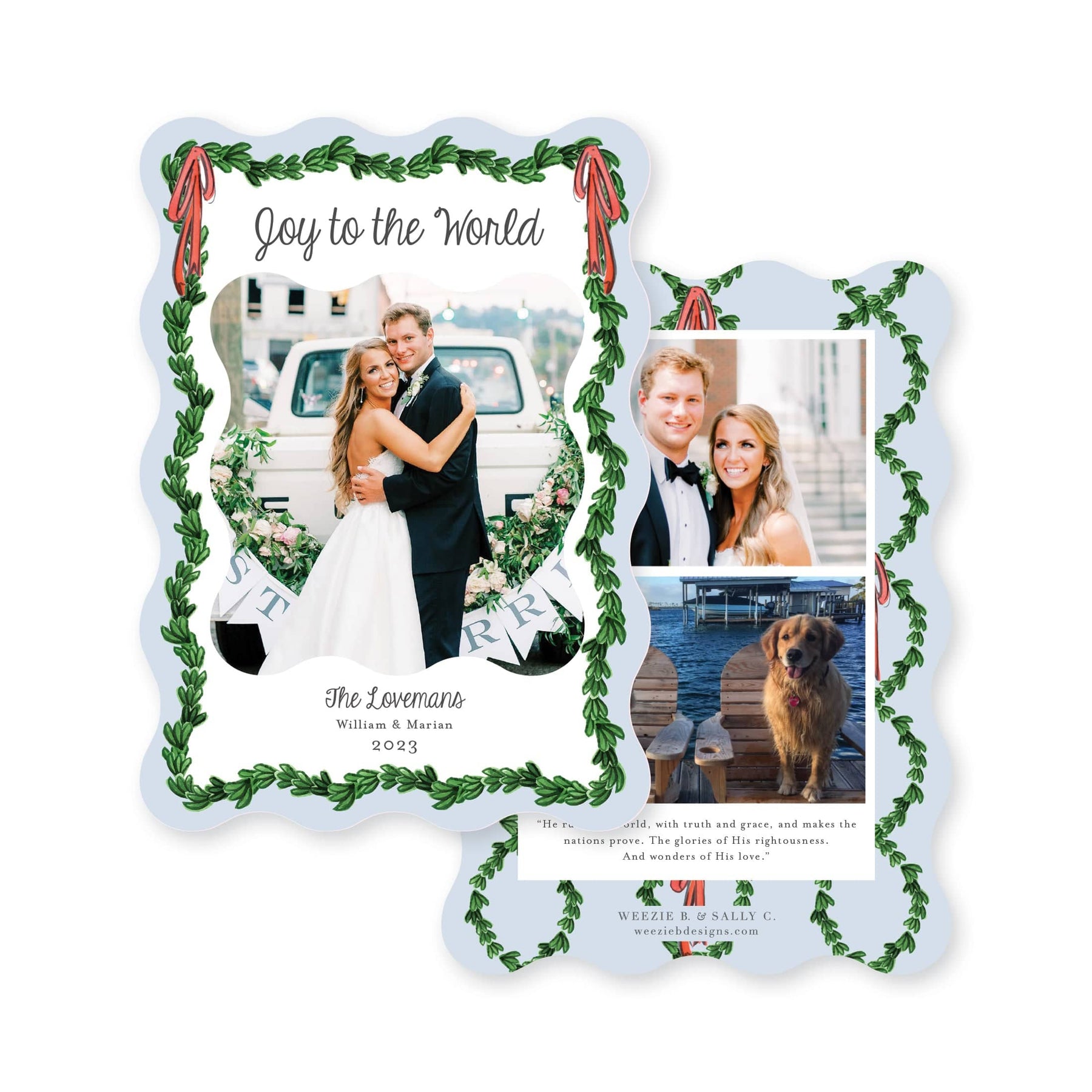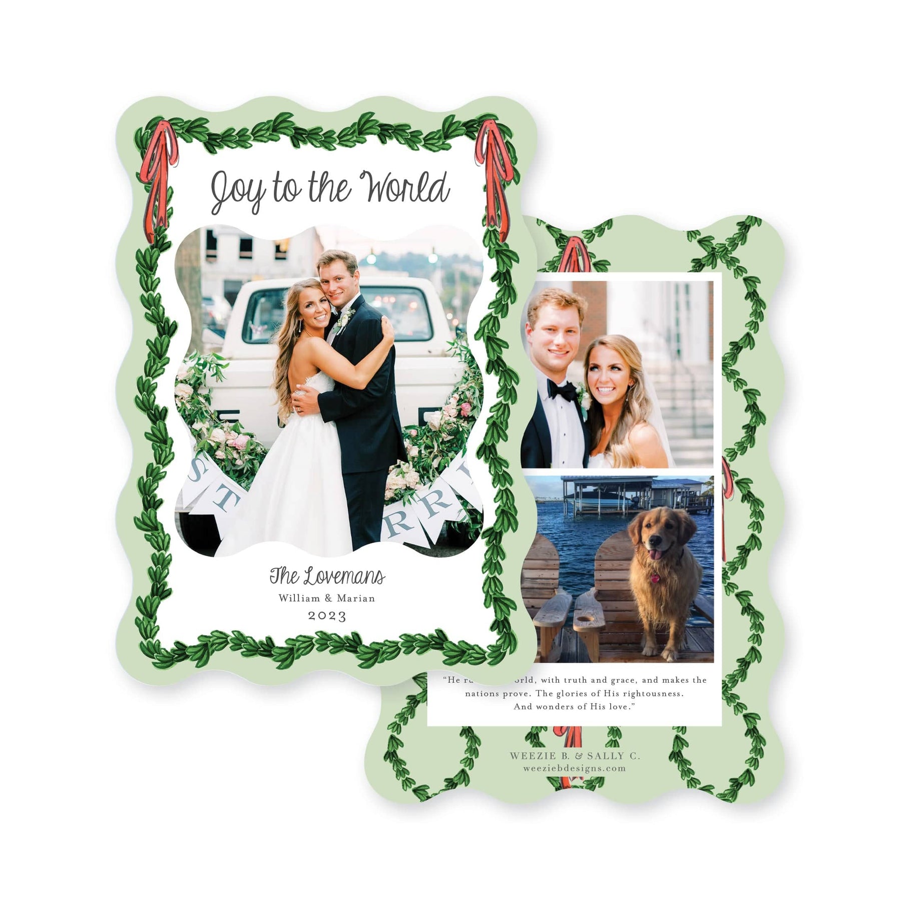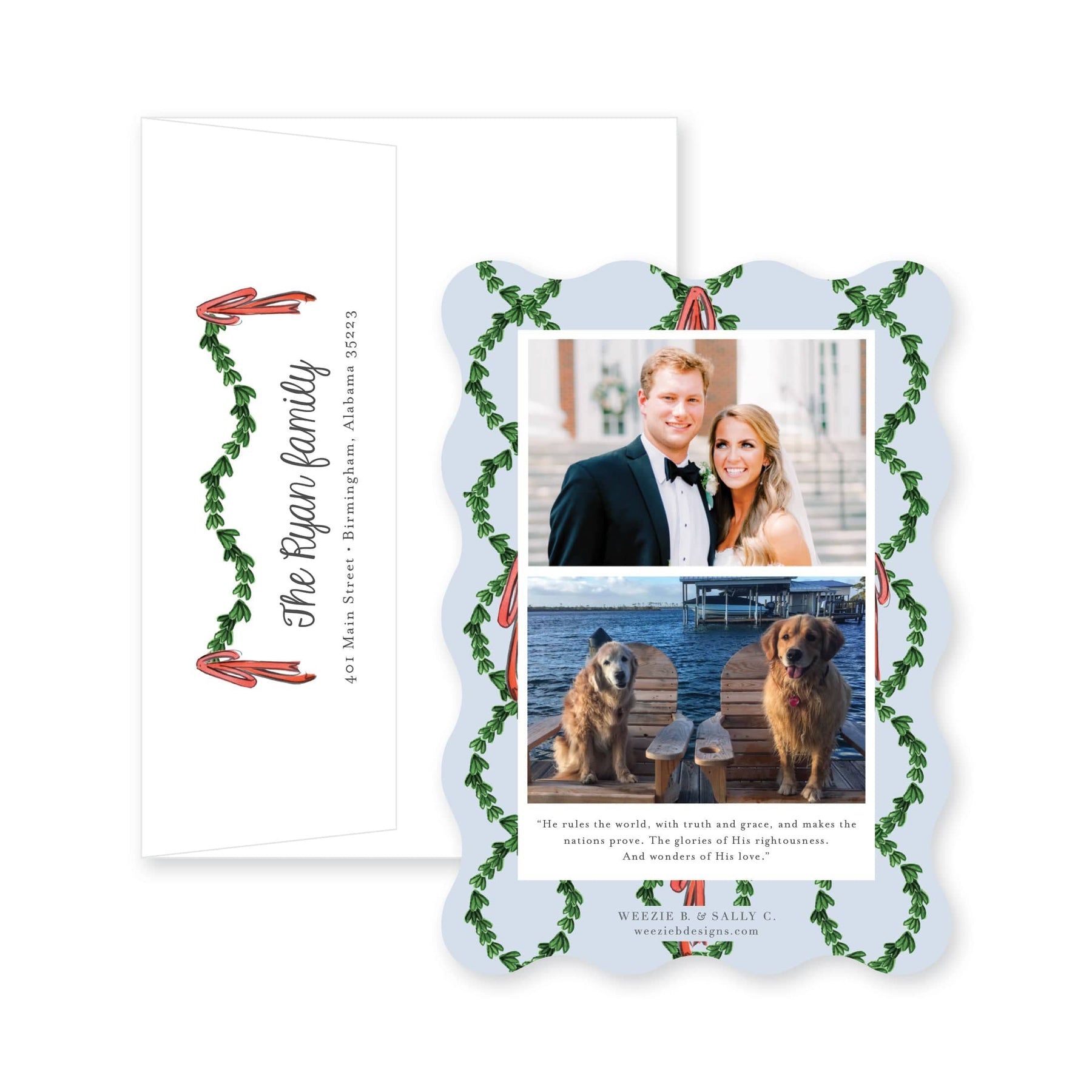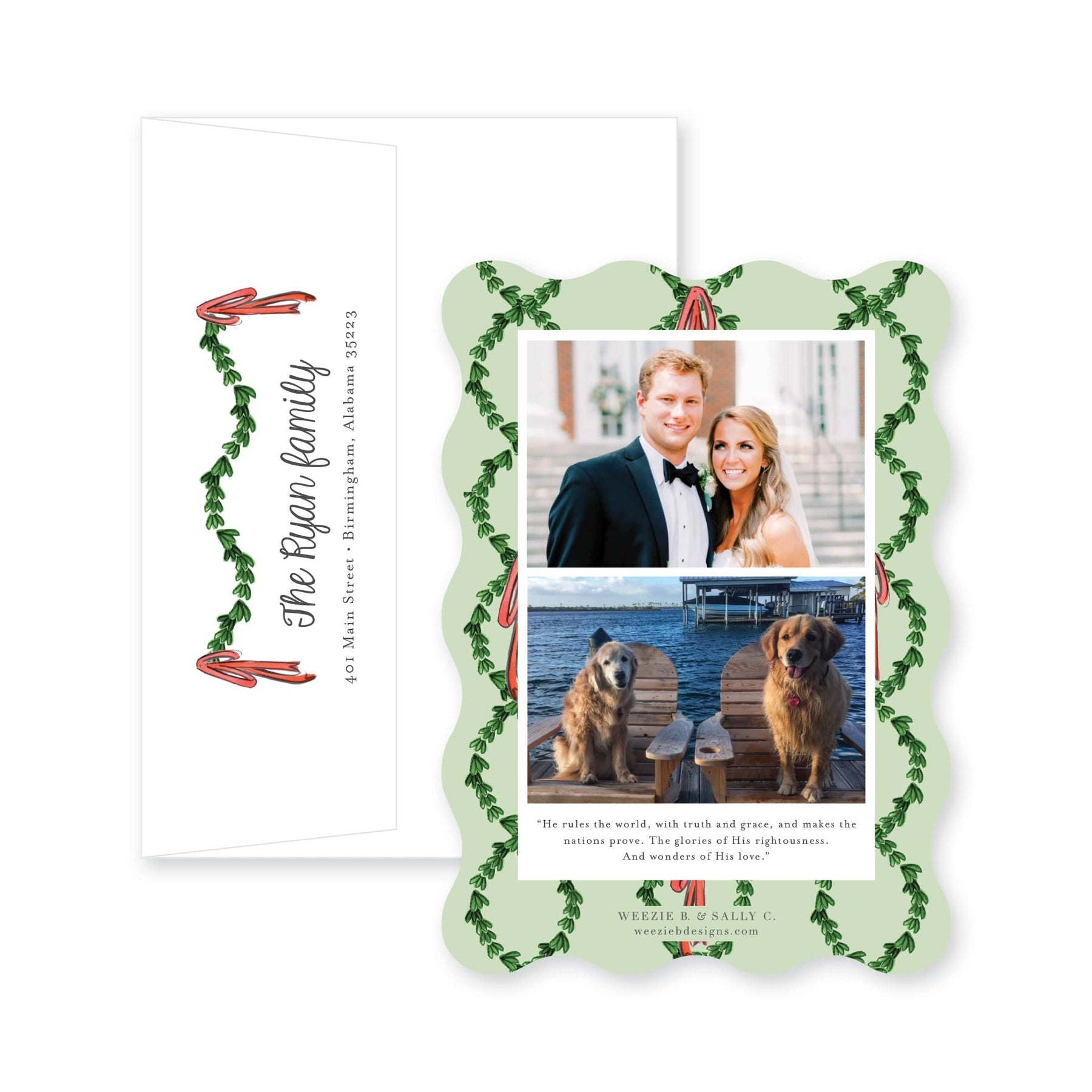 Our Wavy Boxwood with Bows Vertical Christmas Card features a boxwood swag topped with watercolor bows surrounding your beautiful photo. The back of this card will be your greeting to your family and friends. The di-cut wave will make this card extra special.