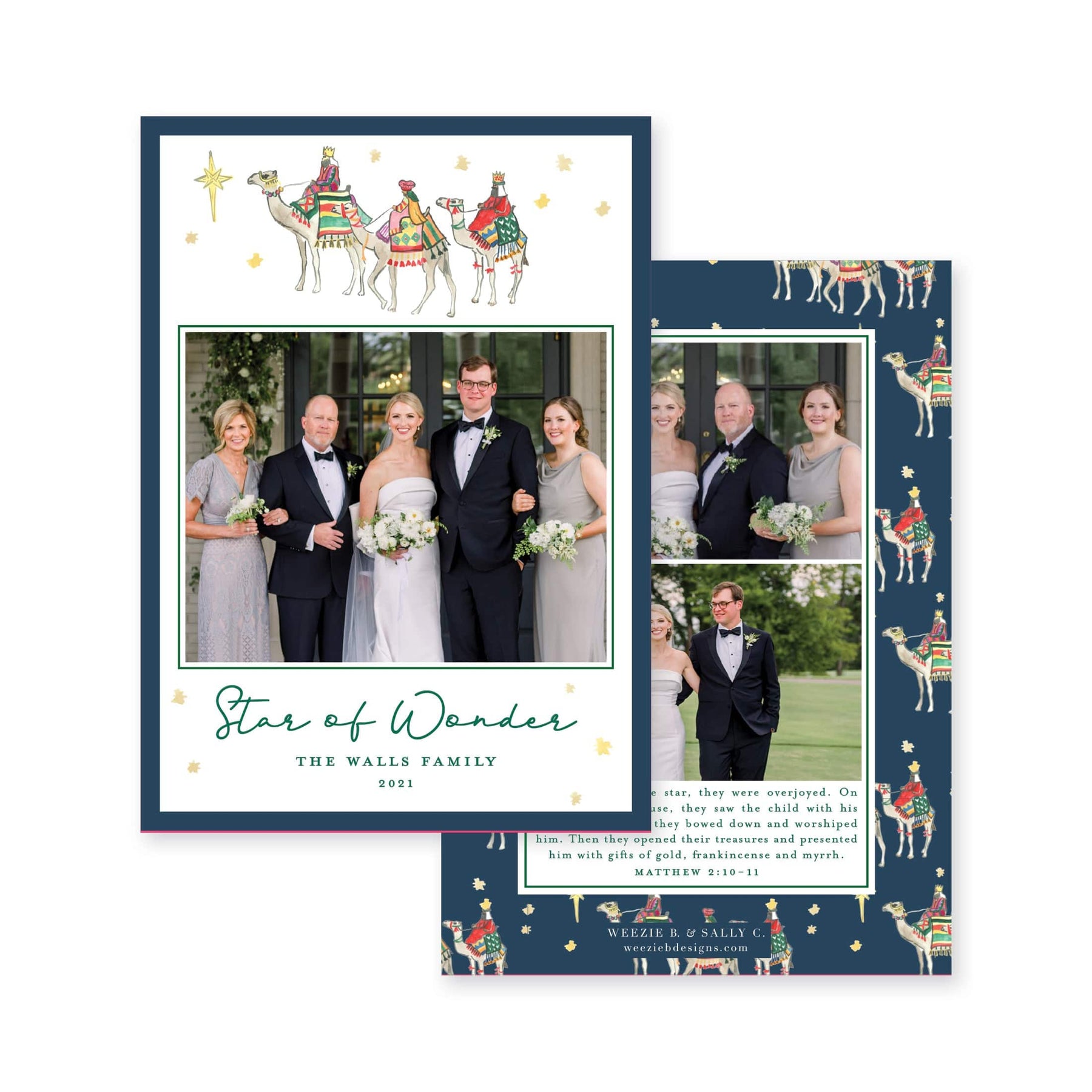 A classic and a favorite! Our We Three Kings Christmas Horizontal card design is the classic but fun twist you've been looking for, featuring our watercolor of the 3 magi or 3 wise men from the Bible Christmas Story. With four different colors to choose from, you cannot go wrong with this design!