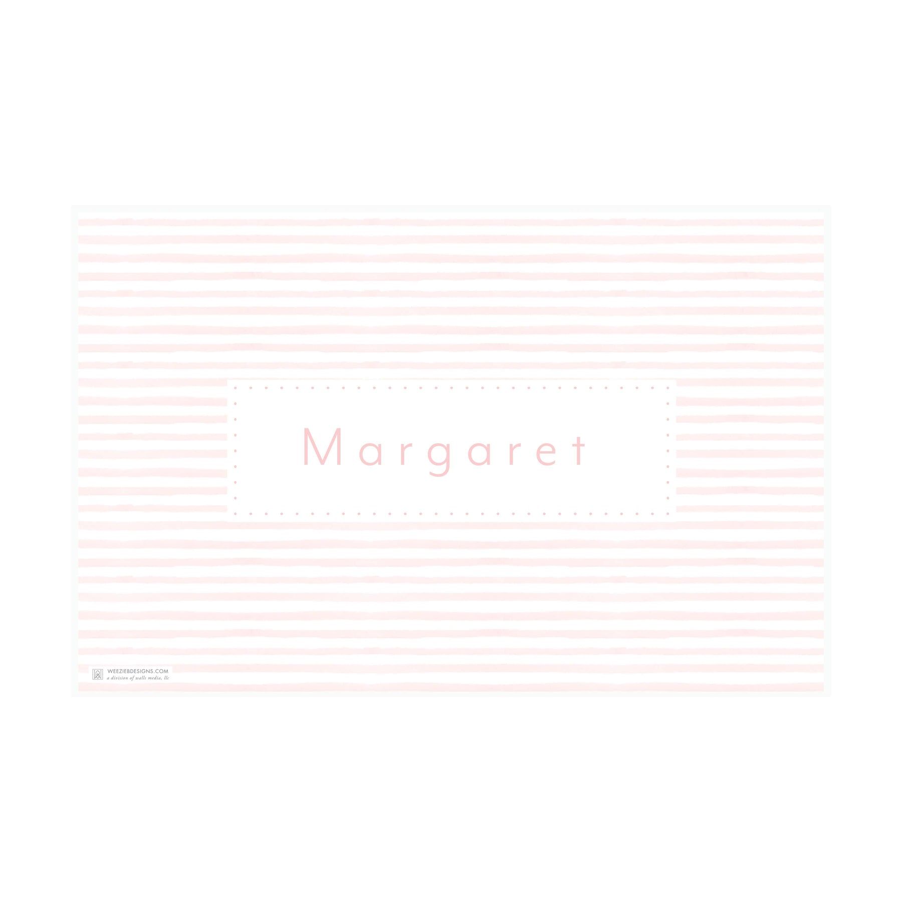 Our Watercolor Bows Laminated Placemat makes a sweet addition to your table. Your little bow loving baby will love stripes and bow pattern- and you'll be happy to keep your table a little less messy. The other side features simple stripes with your little ones name in a box in the middle. These Placemats are laminated so you can wipe and reuse. These personalized placemats make a great and usable gift for any occasion!