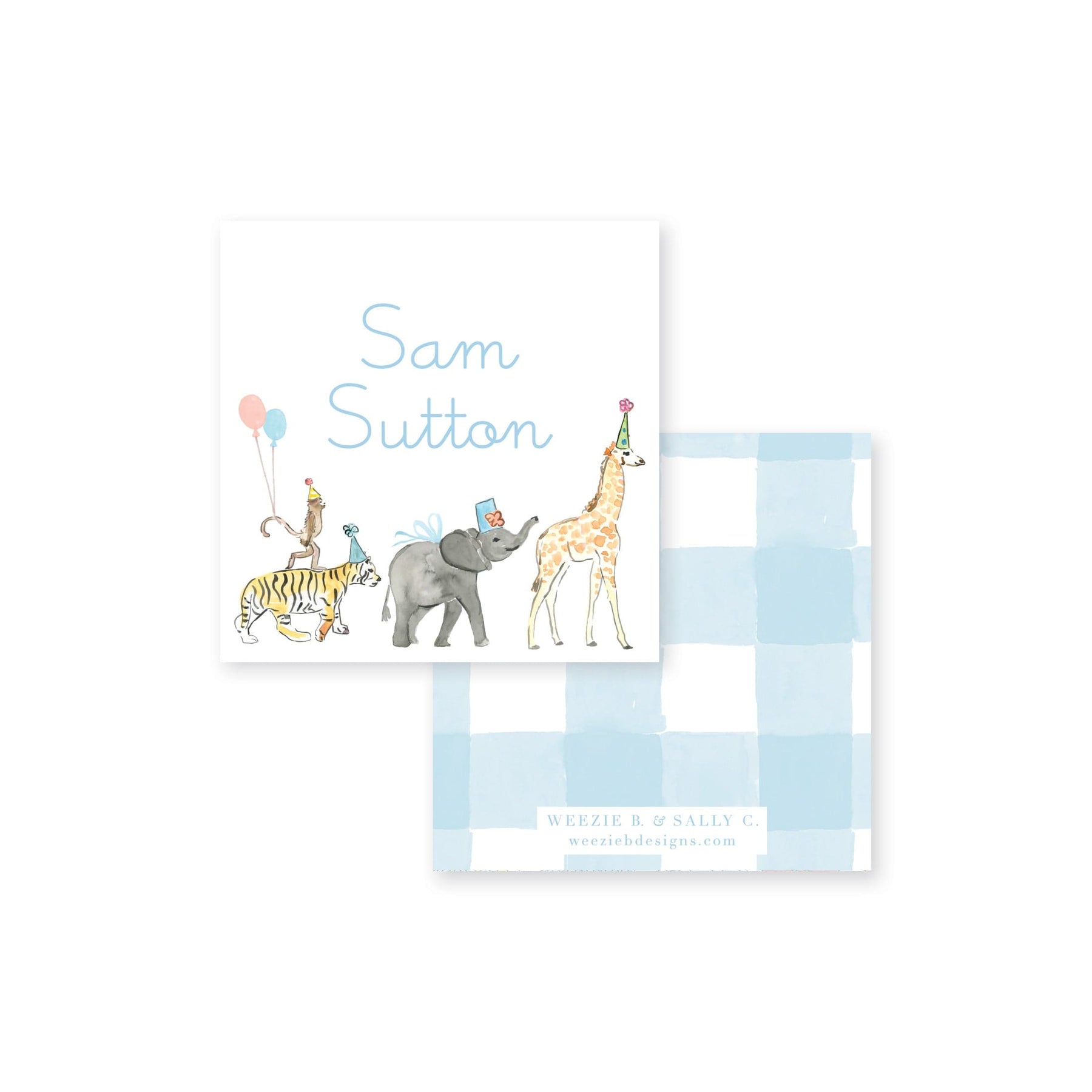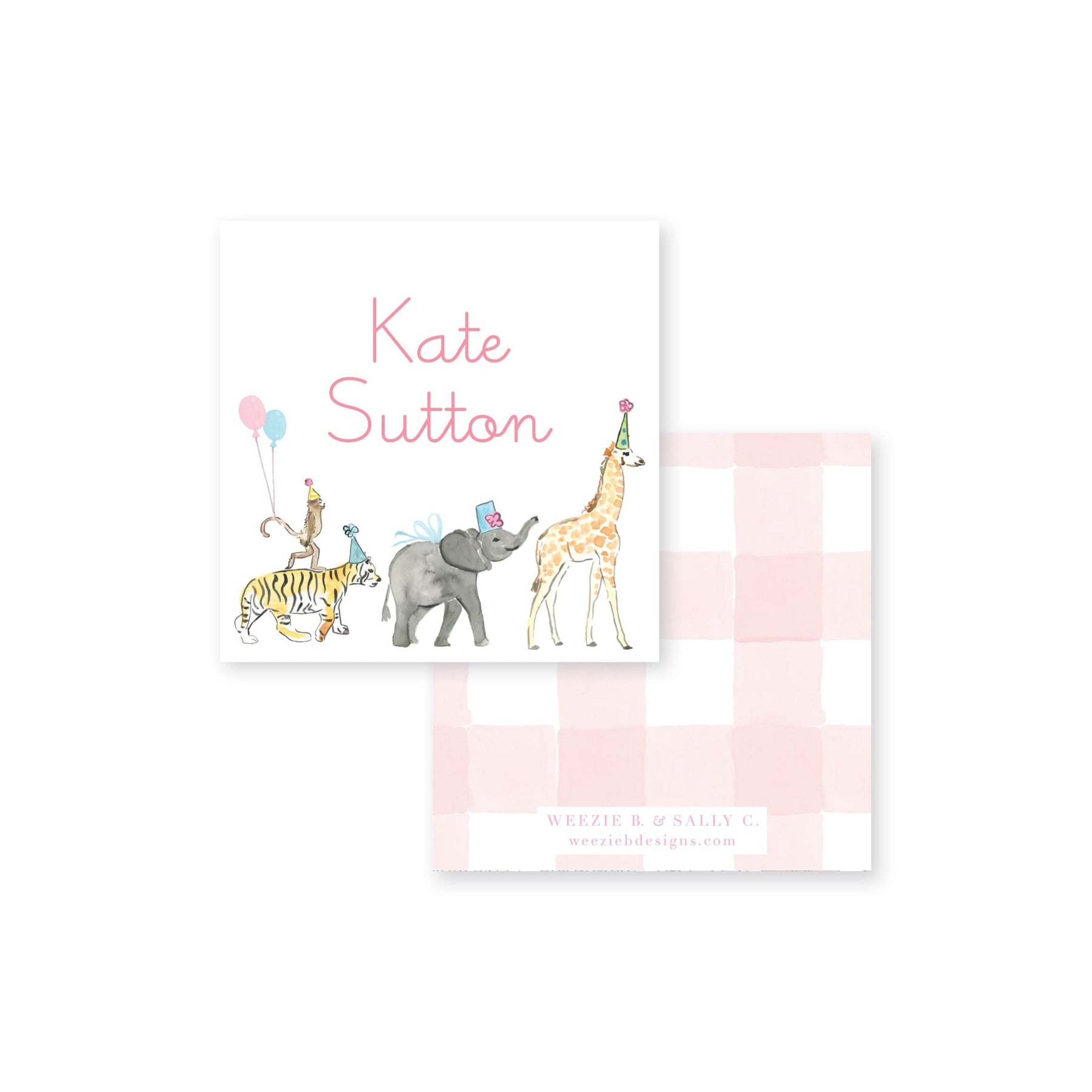 Our Wild About Zoo Calling Card features a parade of watercolor animals holding balloons and wearing party hats and is personalized with your name or monogram.