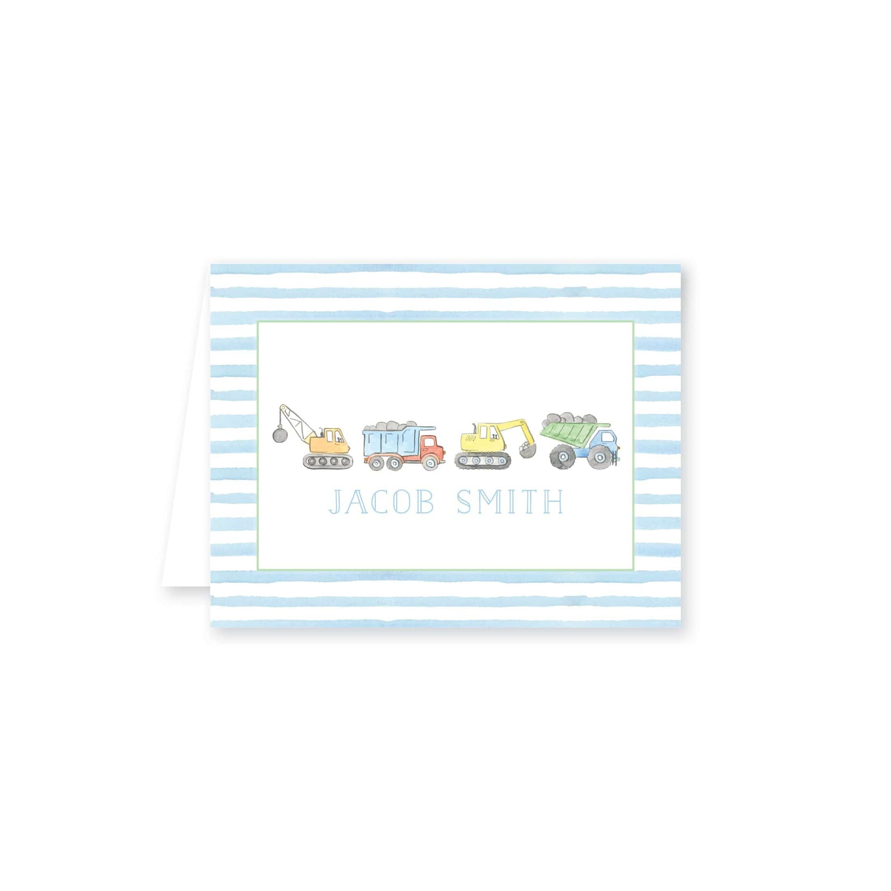 Construction Truck Watercolor Personalized Folded Note Cards feature our trucks with blue stipres and is personalized with your name! You can use these for thank you notes or just a card for any type of note!