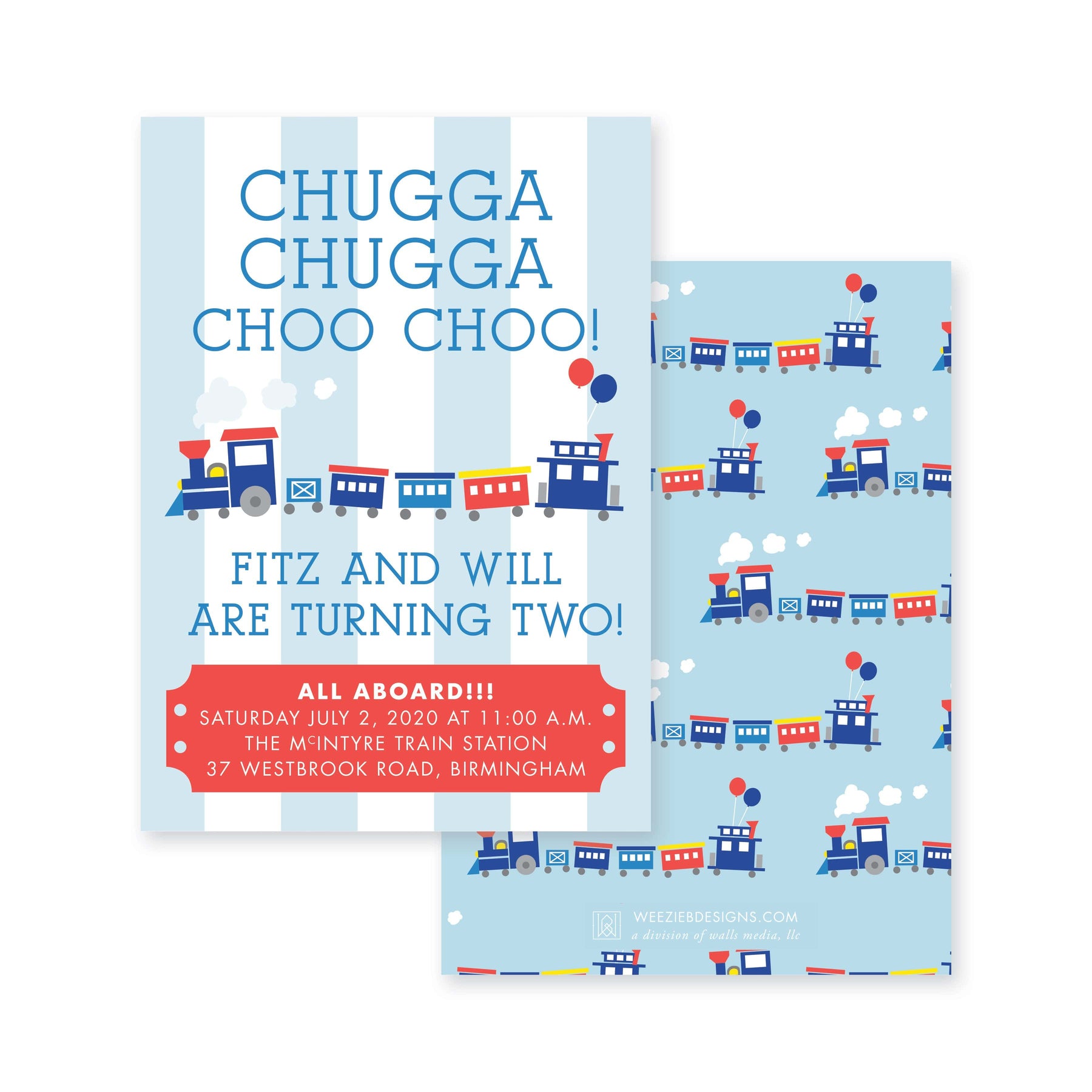 Chugga, Chugga, Choo, Choo! All aboard for your little ones Chugga Chugga Train Birthday Party! This Choo Choo Train invitation is perfect for your little conductor or multiple conductors!