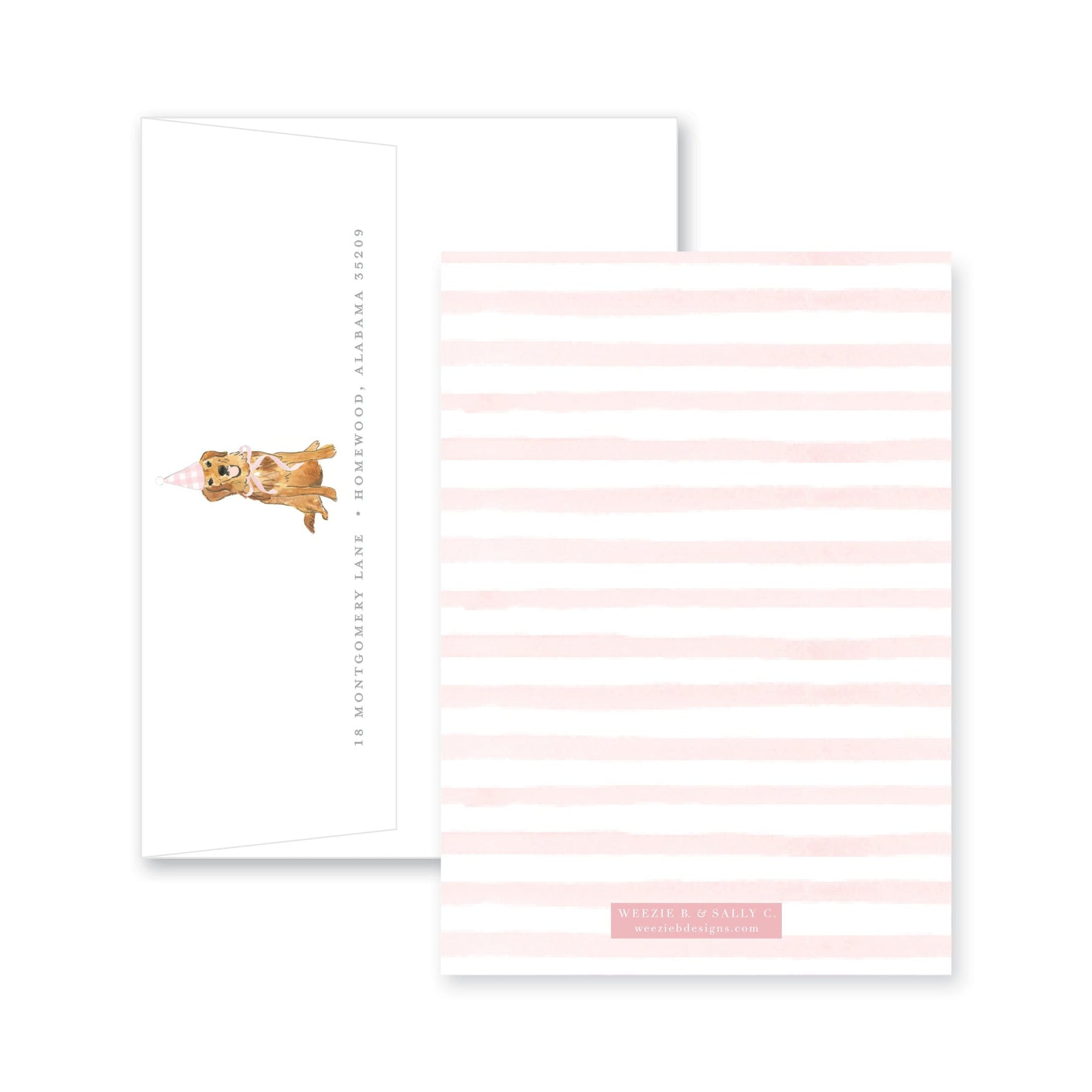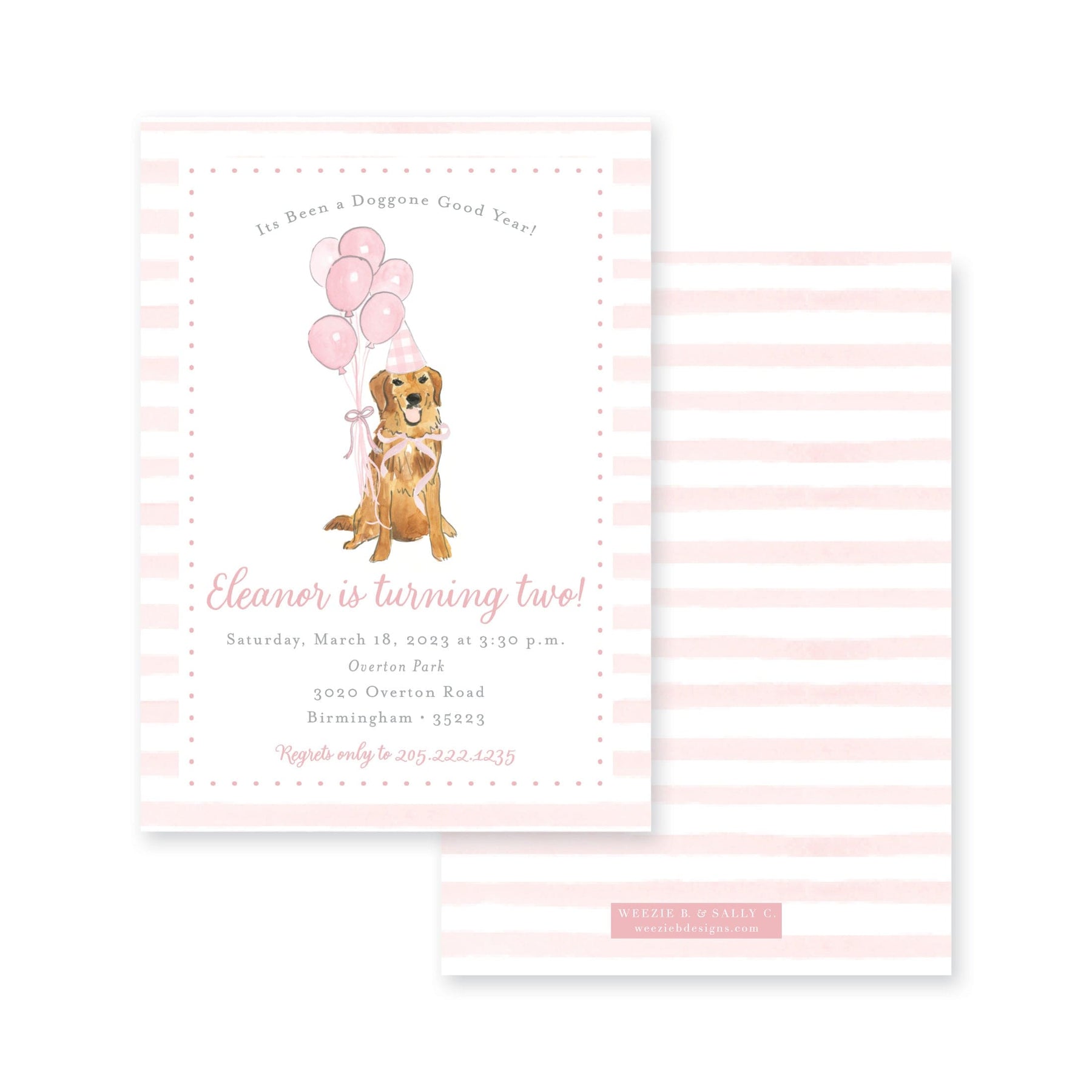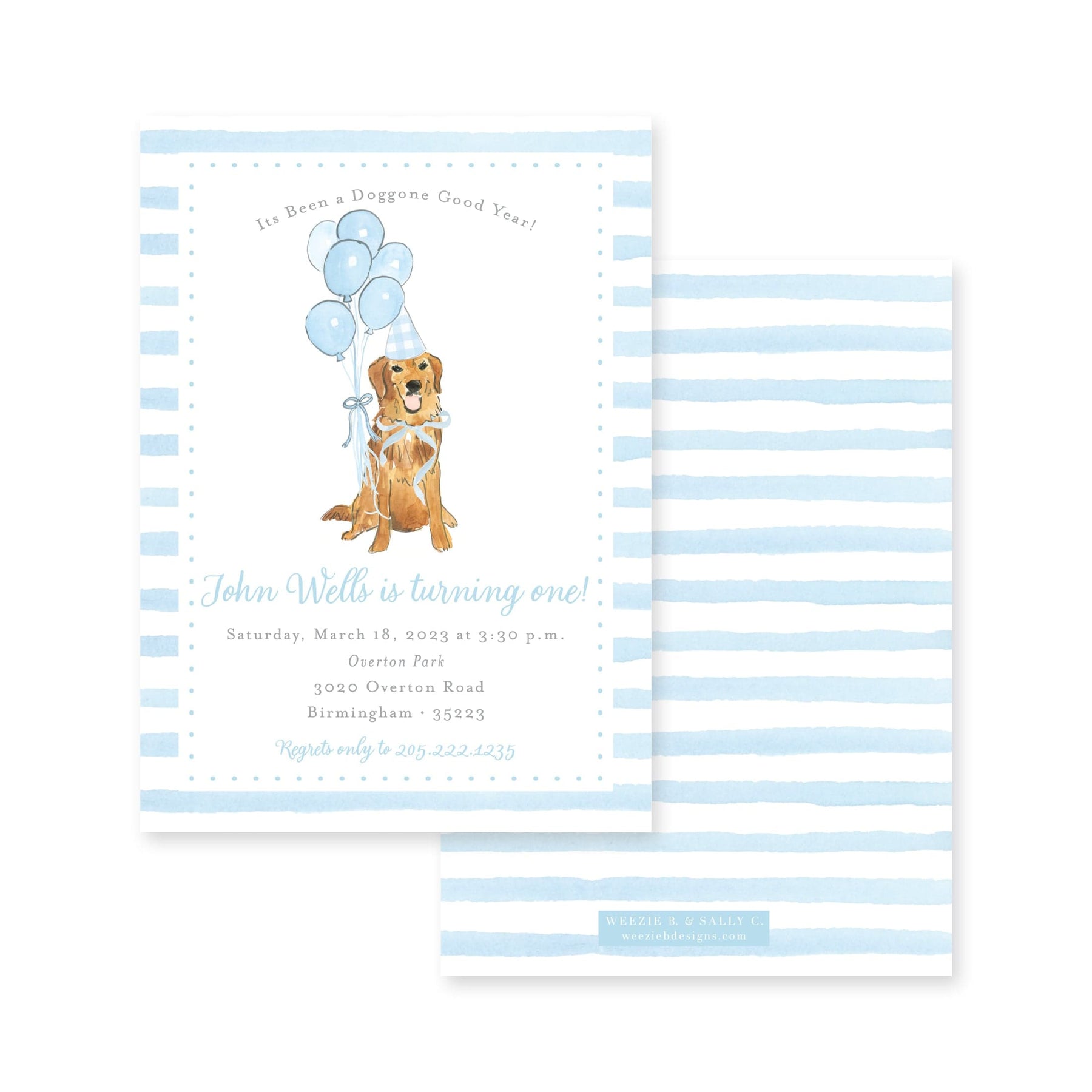 Golden Retrievers and little ones make the best of friends. Our dog invitations are a simple and sweet way to celebrate your little one's birthday! Want your family pet watercolored for the design, we can do so for $75. Just add your image when you're filling out our form. You will receive a proof.