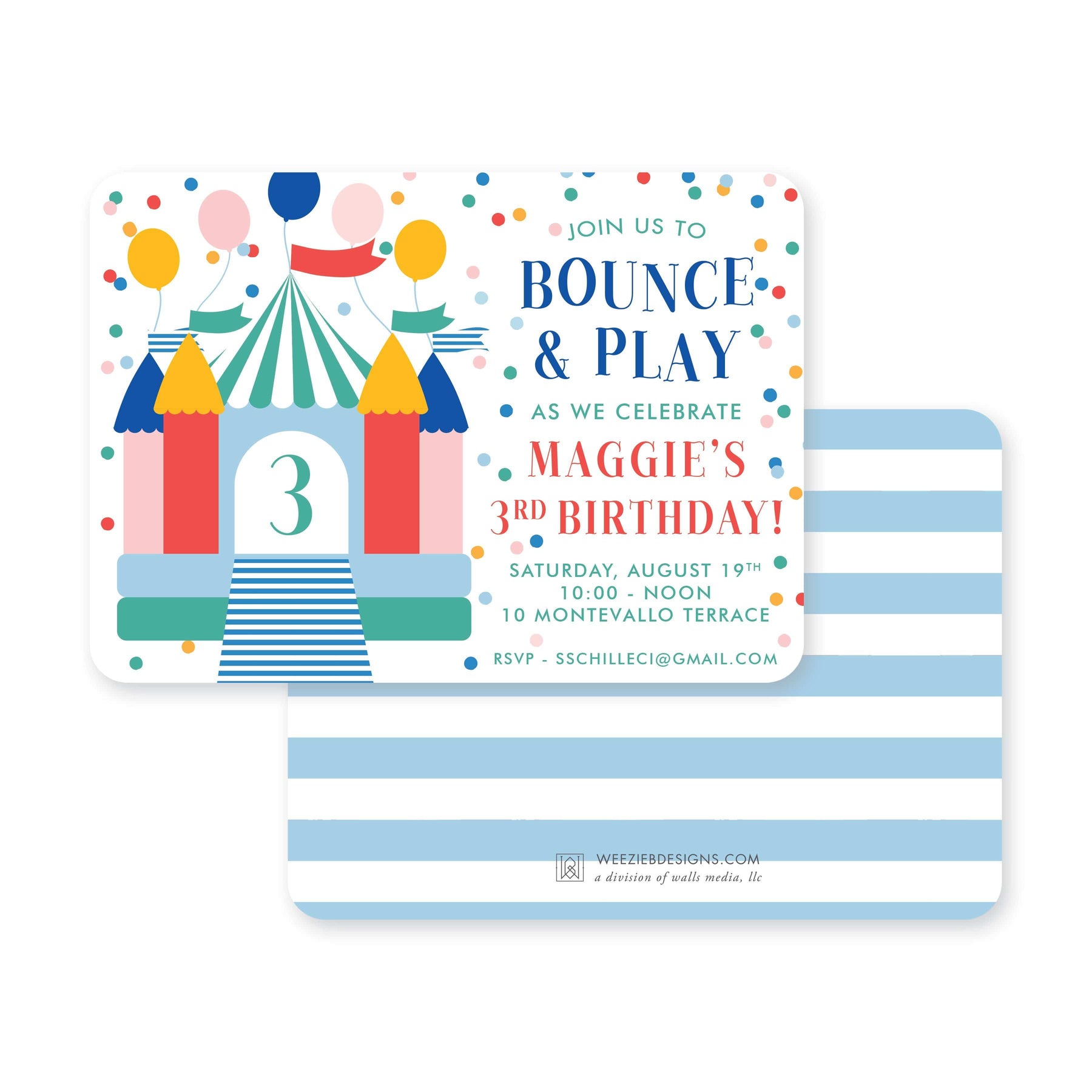 Do your child love to bounce and play? This Bounce & Play Birthday Invitation is perfect for bounce house parties! The bright colors work for boys or girls- or both as you can see with the version for twins! The confetti adds a fun, party touch!