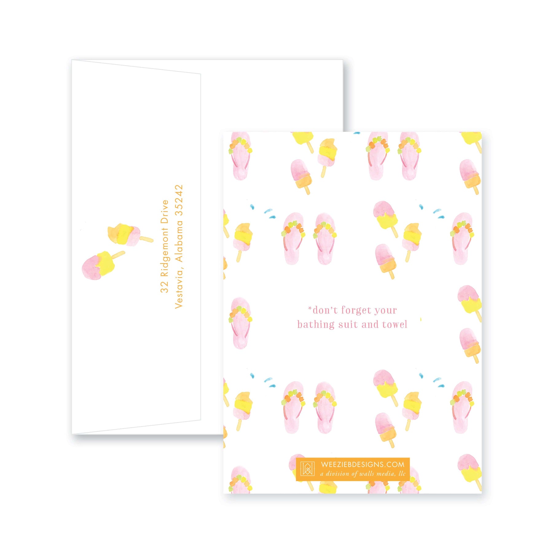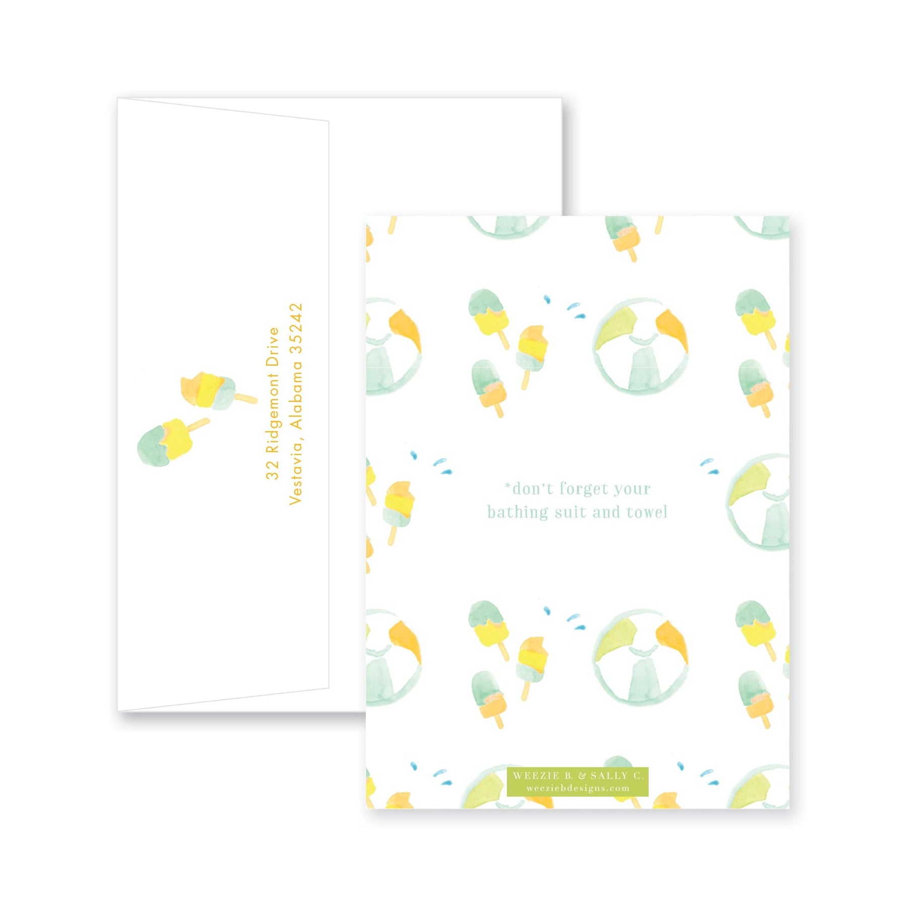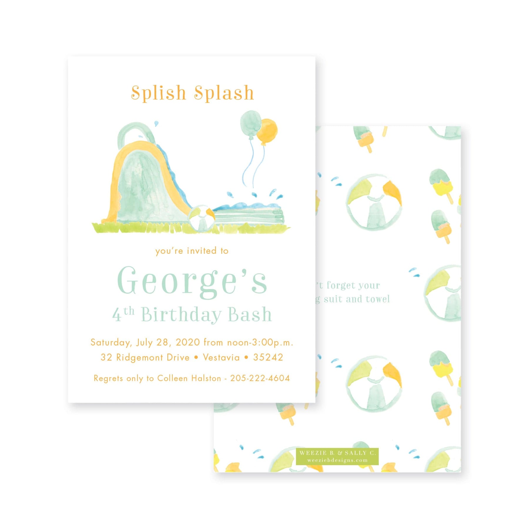Splish Splash! This watercolor and bright invitation is the perfect way to invite your friends to this summer, water bash! Don't forget your bathing suit and towel!