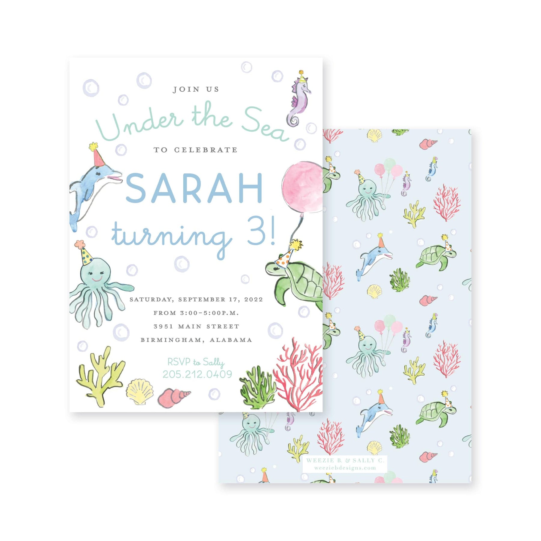 Under the Sea is the cutest Birthday Invitation for baby or child! These sweet, watercolor sea animals are all ready to celebrate your precious little one! Your little one will love the turtle, dolphin, octopus and sea horses in their party hats!