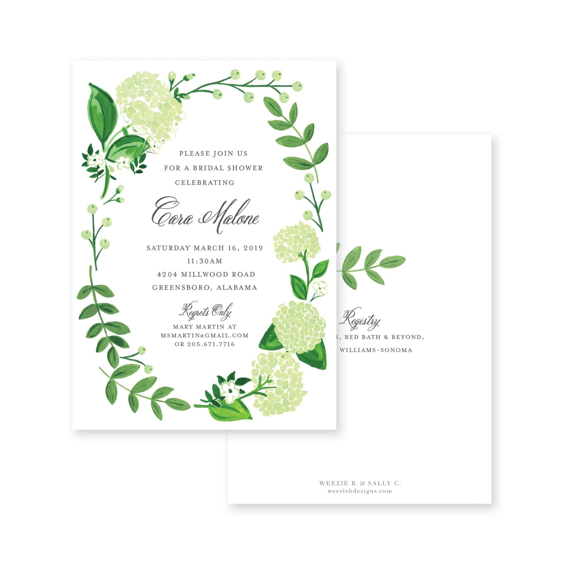 Hydrangea Garden Florals Bridal Shower Invitation is a beautiful shower invitation. Hydrangea, garden berries, and small white flowers in the green and white are classic and elegant.