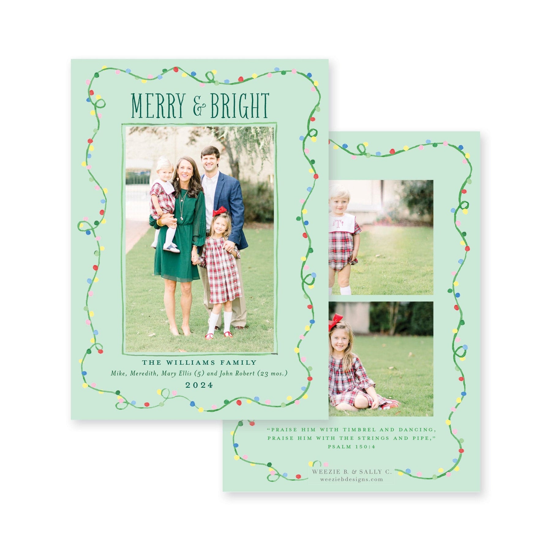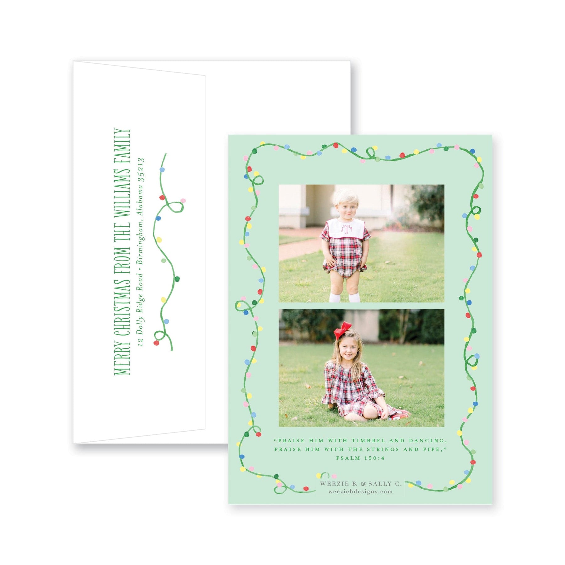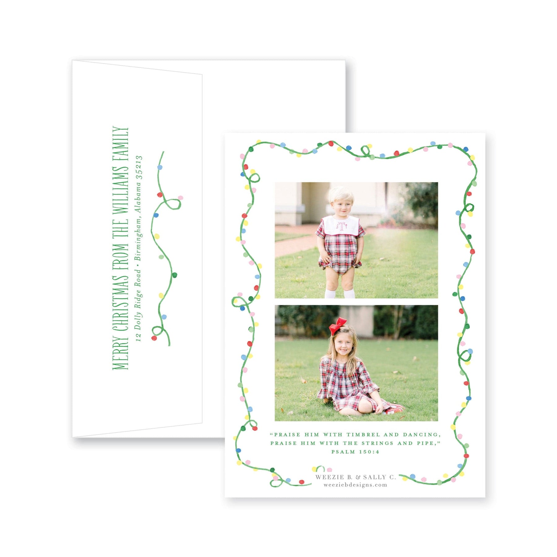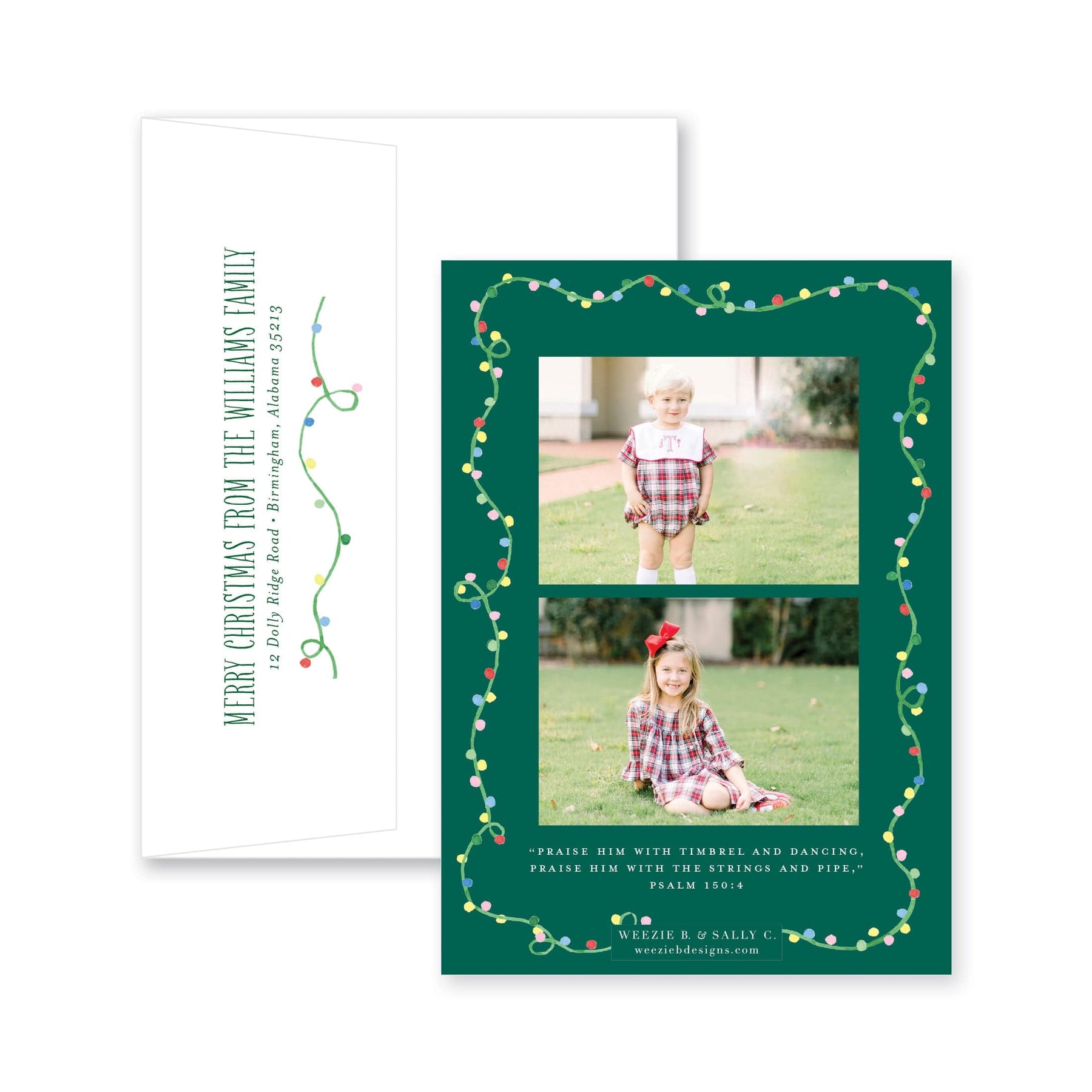 Our Cheery Christmas Lights Vertical Christmas Card features a border of our watercolor Christmas lights in bright, cheery colors. The back has a place for your photos or verse. Available in white, dark green, light green and light blue.