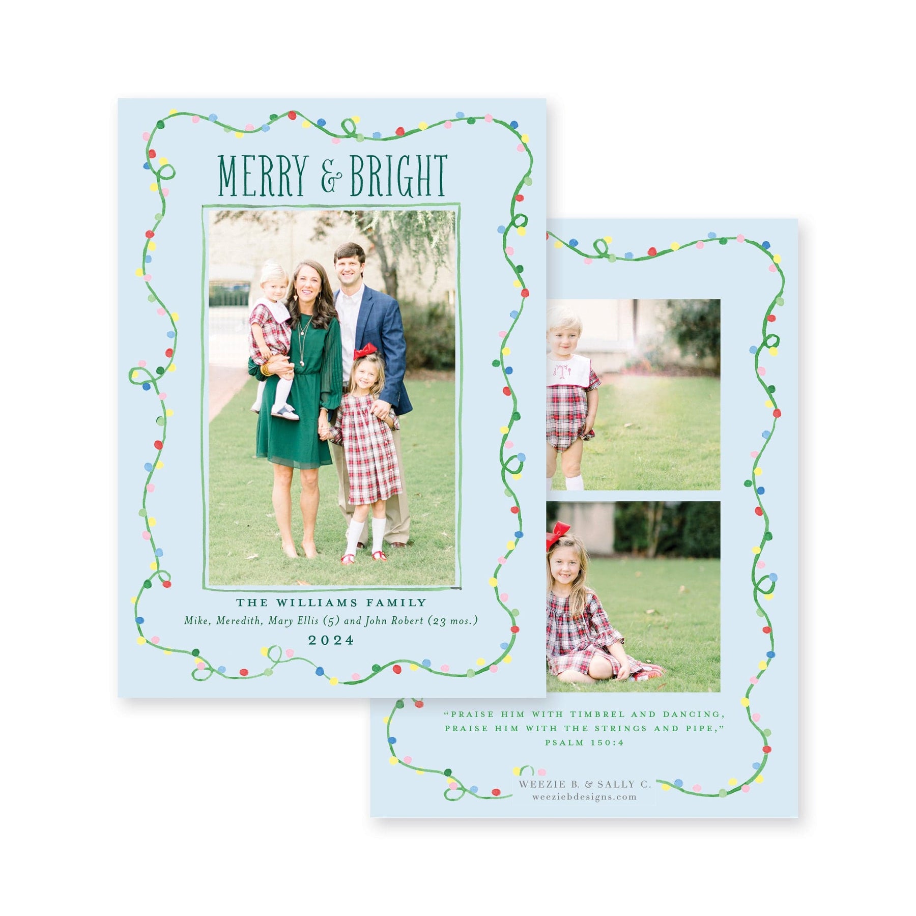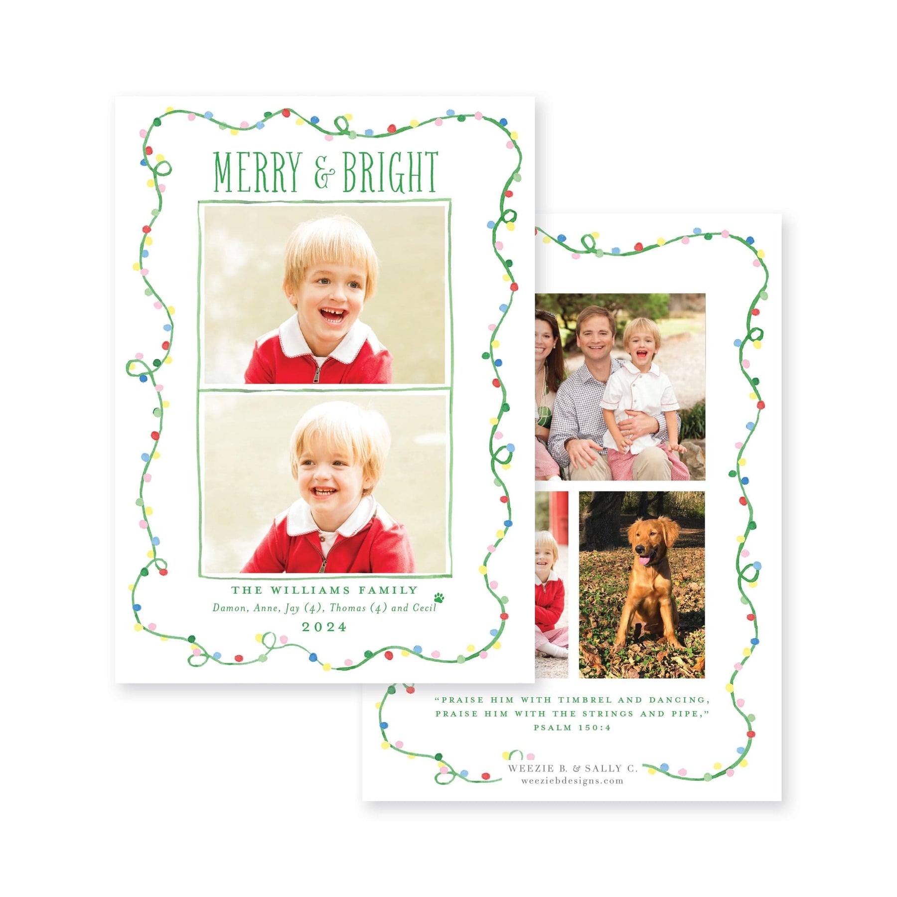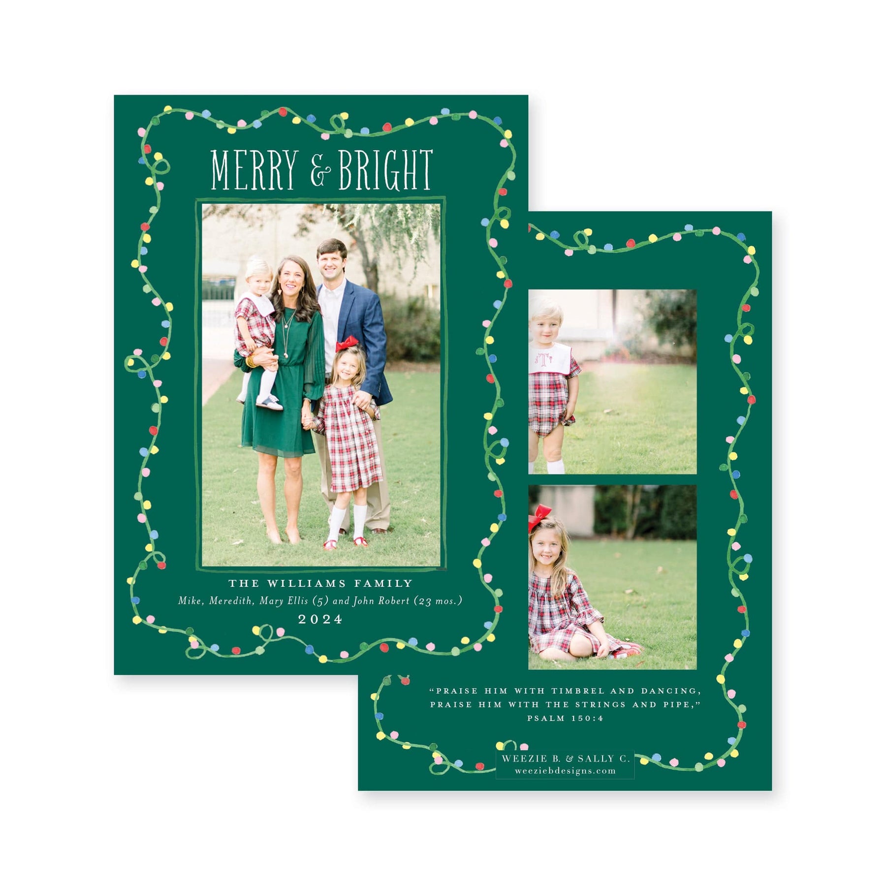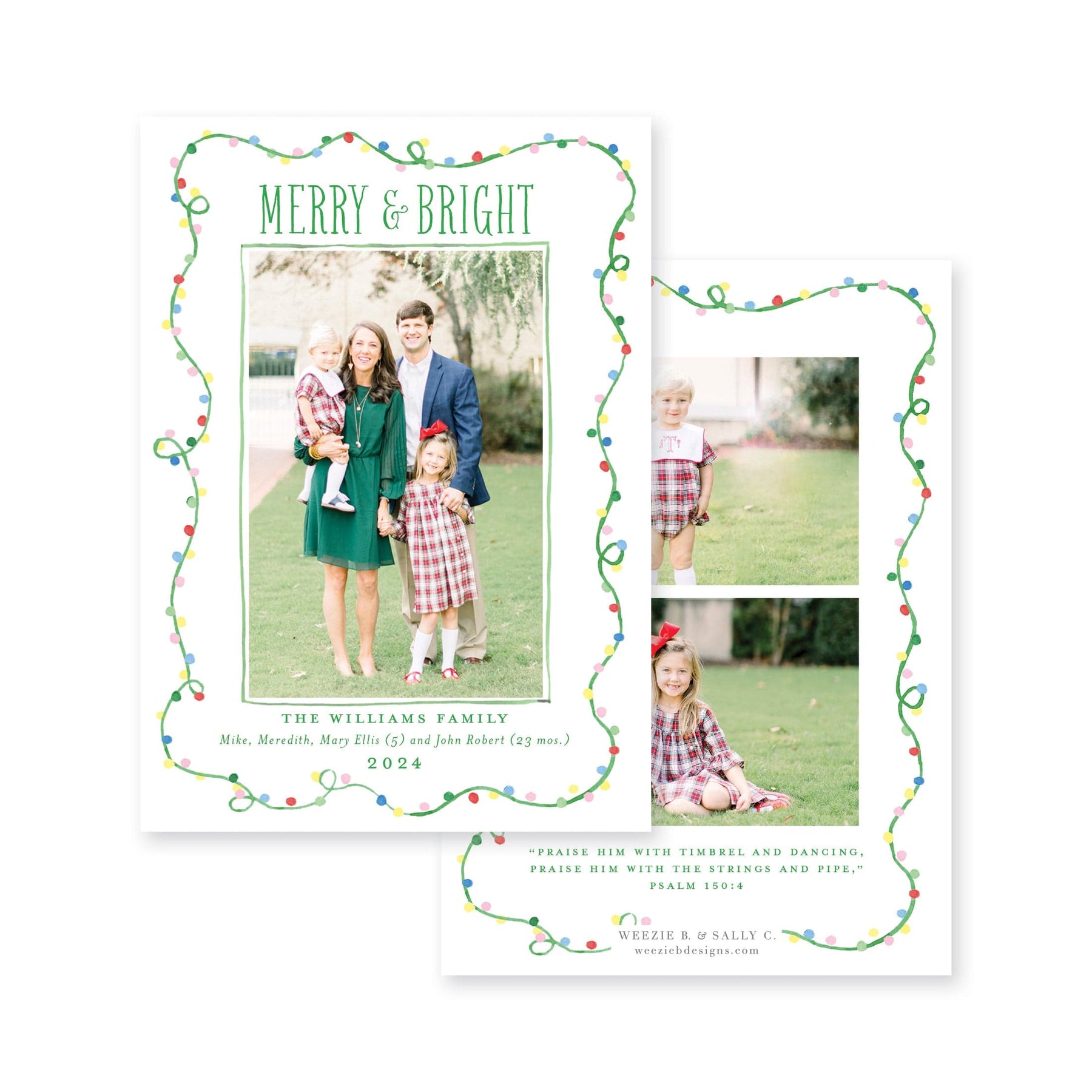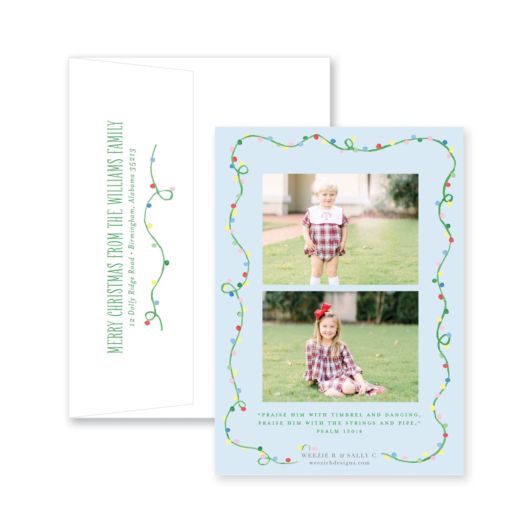 Our Cheery Christmas Lights Vertical Christmas Card features a border of our watercolor Christmas lights in bright, cheery colors. The back has a place for your photos or verse. Available in white, dark green, light green and light blue.