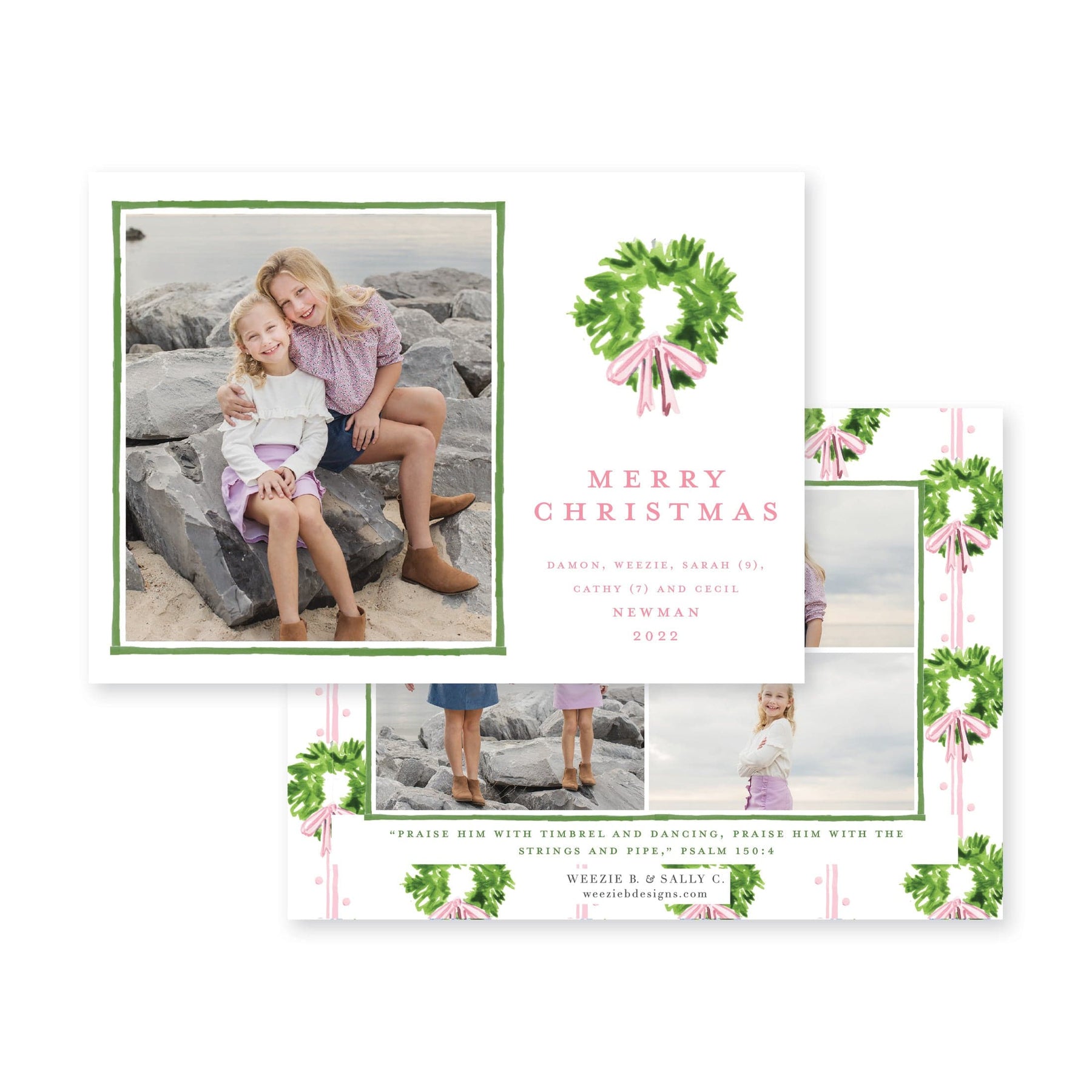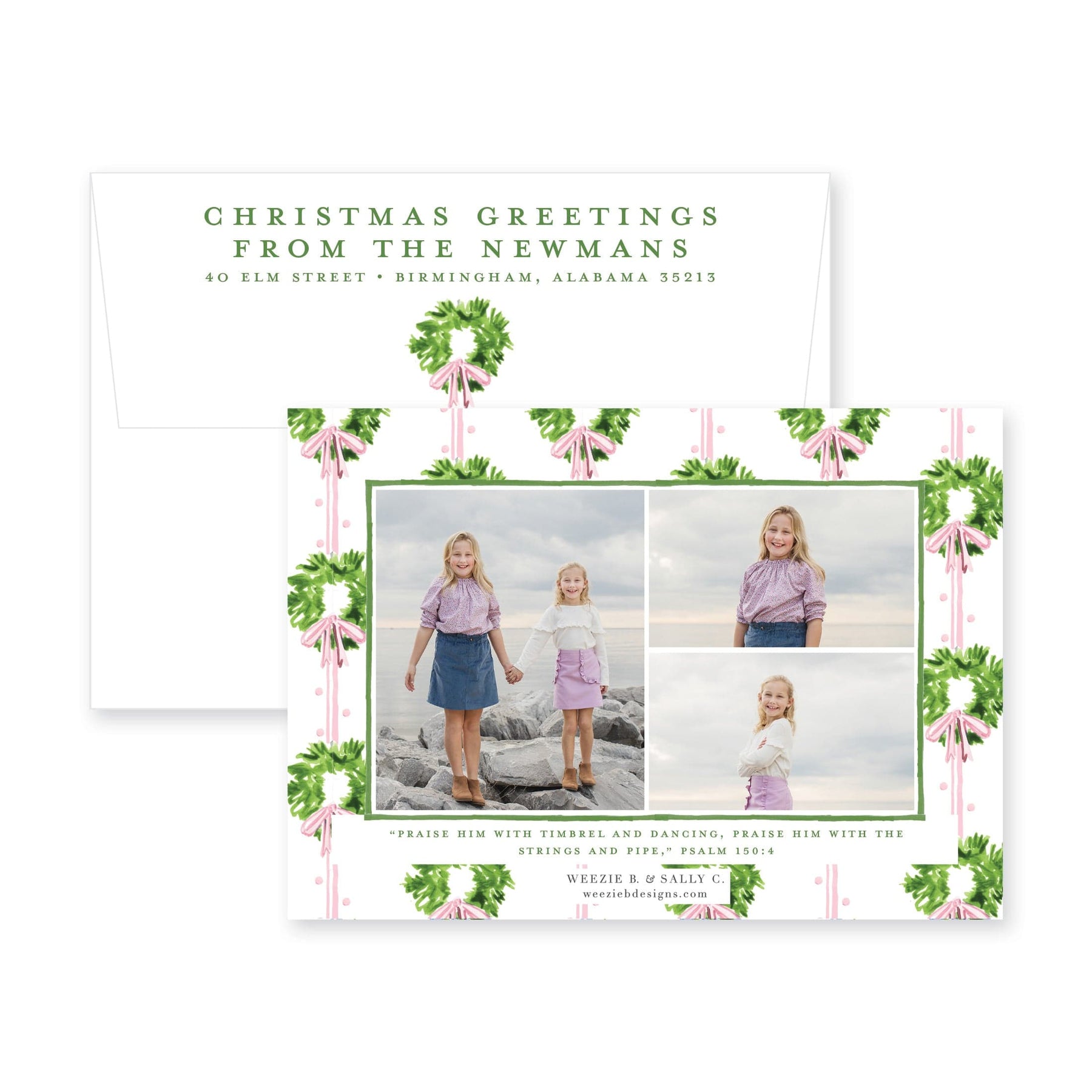 Our Chic Wreath Christmas Card features our watercolor wreath with a bow in 4 different color options. The background pattern is beautiful on its own or with 1-4 of your photos.