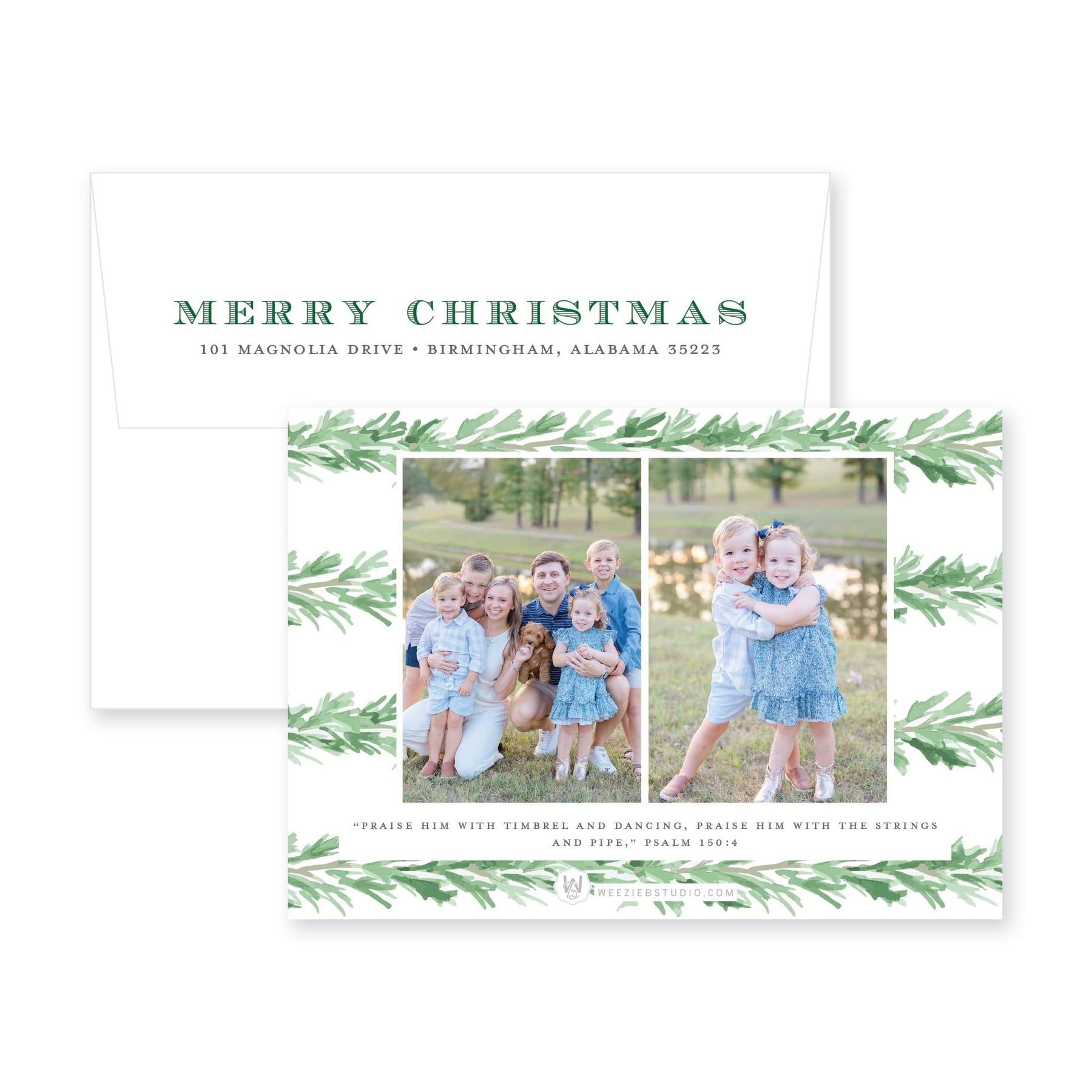 Our Evergreen Garland Bow Horizontal Christmas Card- AA classic Christmas garland with festive bows, timeless and traditional. The back of this card can feature 0-4 images. Bible verse can be added, changed or switched to a phrase. Available in multiple color options