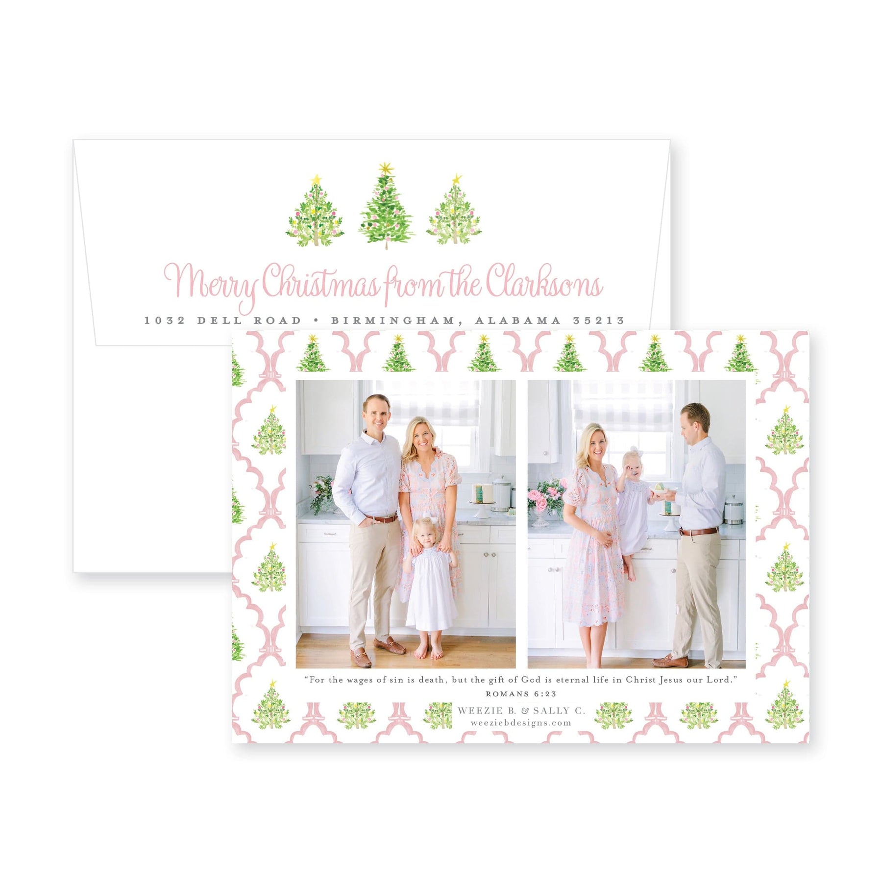 Our Oh Christmas Tree Horizontal Christmas Card features our watercolor Christmas trees with ornaments a star on top of each one. The back has a beautiful pattern with the trees on repeat with your photos or verse on top. Choose in pink, light blue or light green and add up to 1-4 photos on the back!