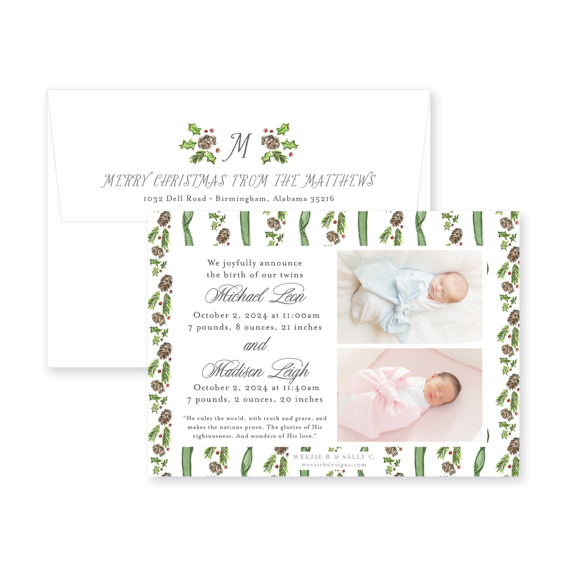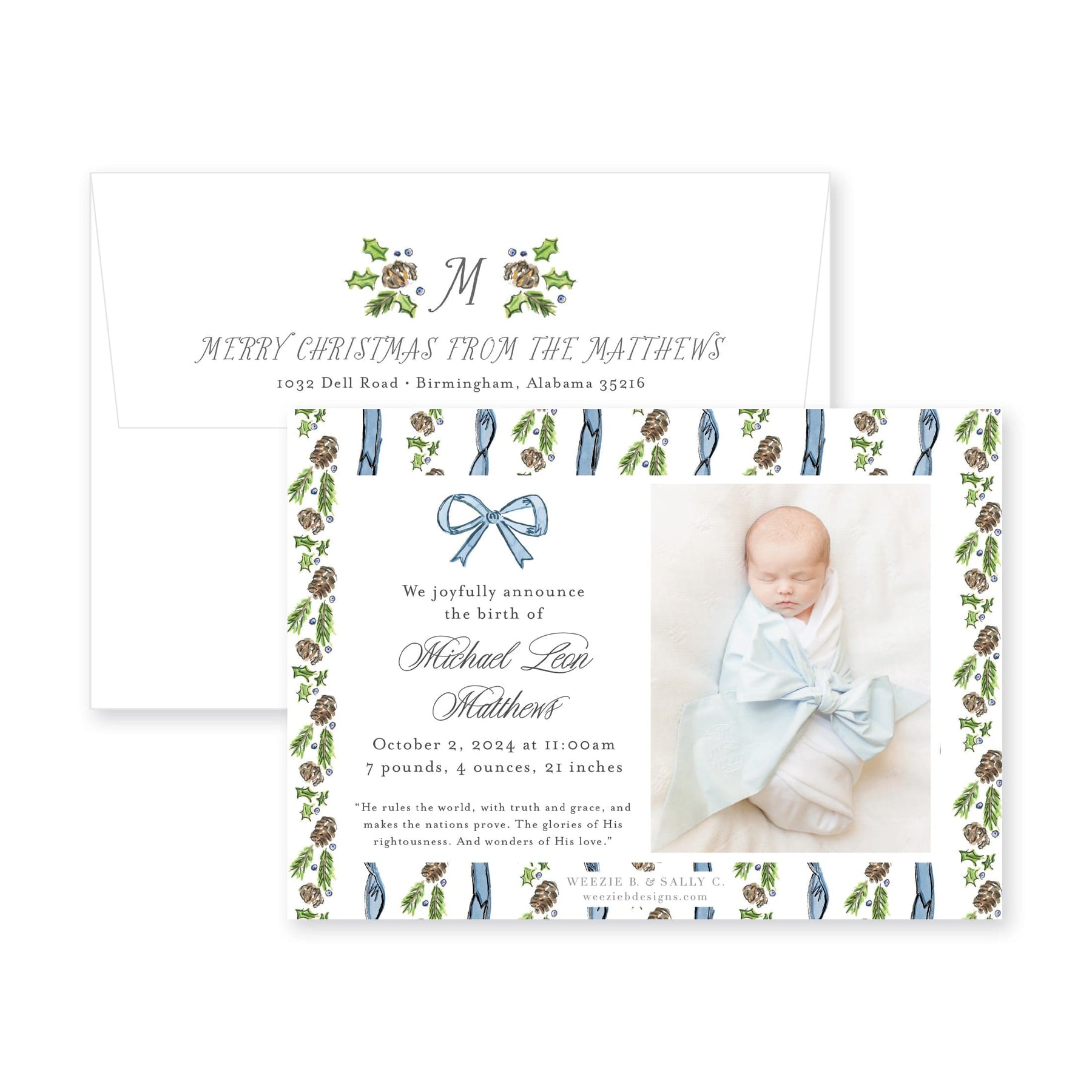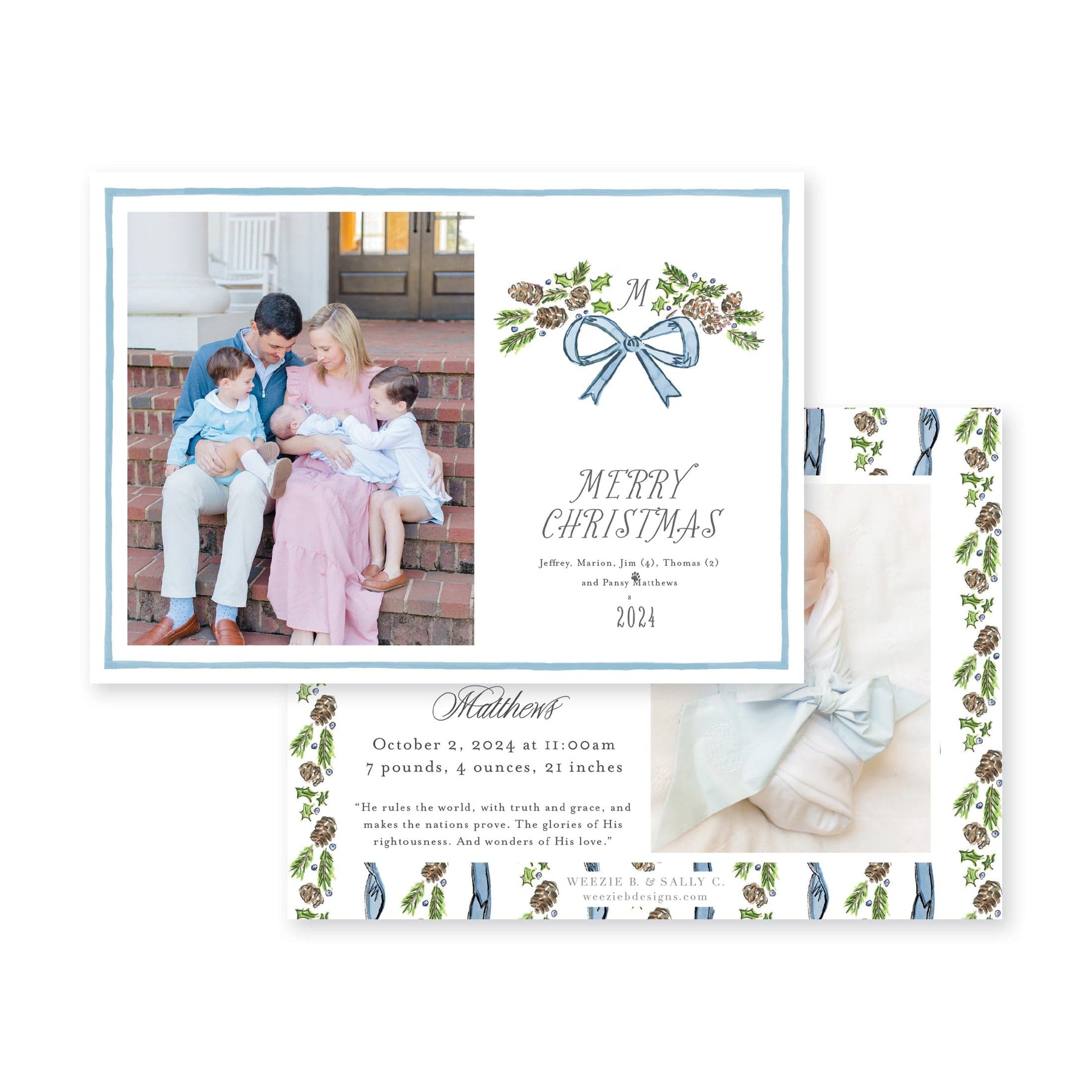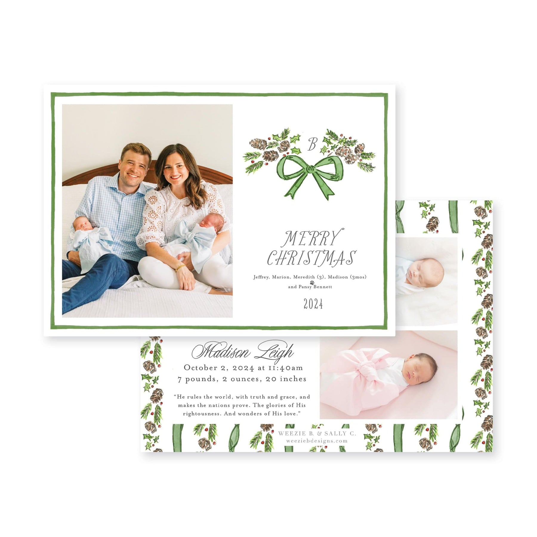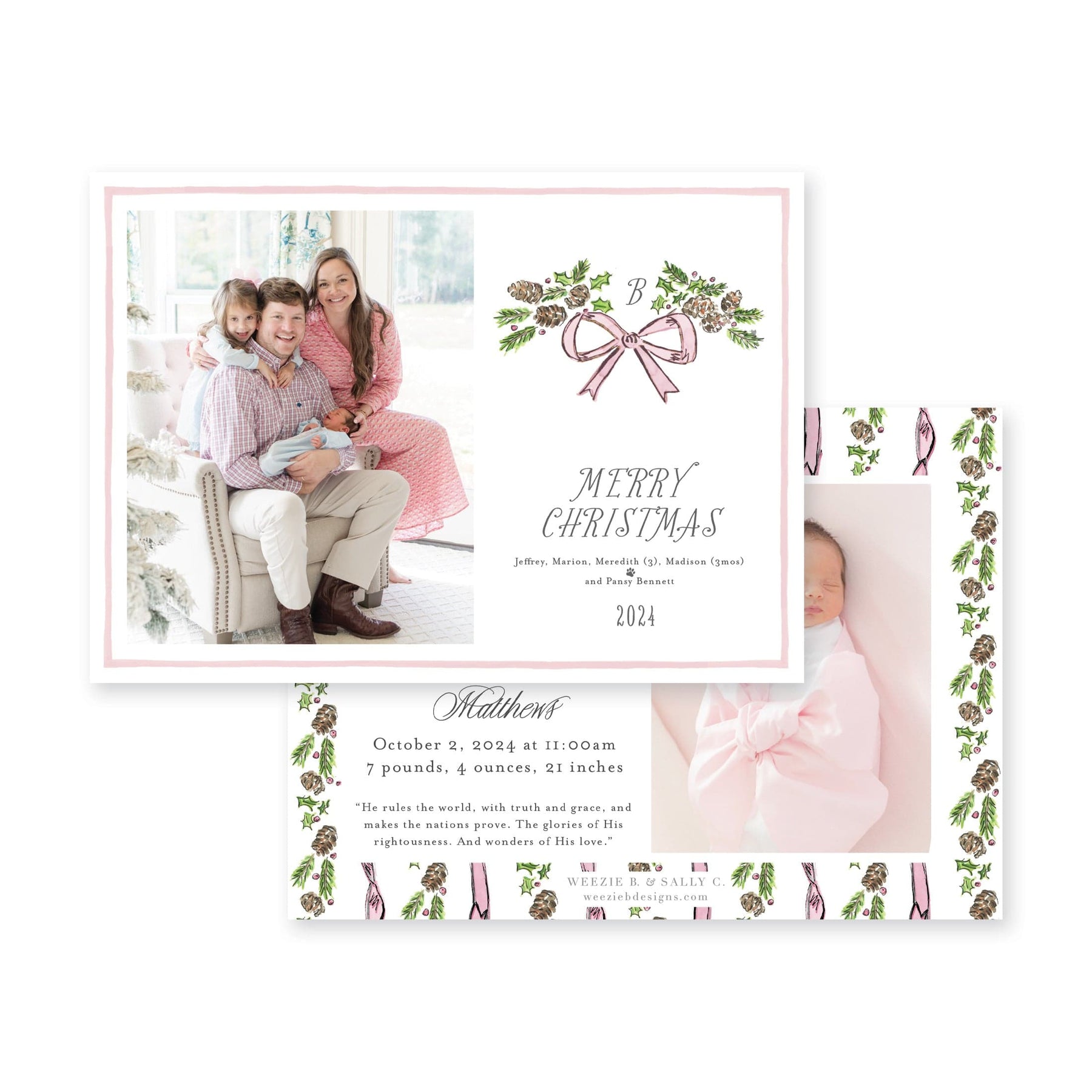 Our Pinecone Laurel Bow Announcement Christmas Card features your photo on the front framed in our watercolor bow with evergreen pine branches, pinecones and berries in blue, pink, green or red The back of this card can feature 0-4 images. Bible verse can be added, changed or switched to a phrase.