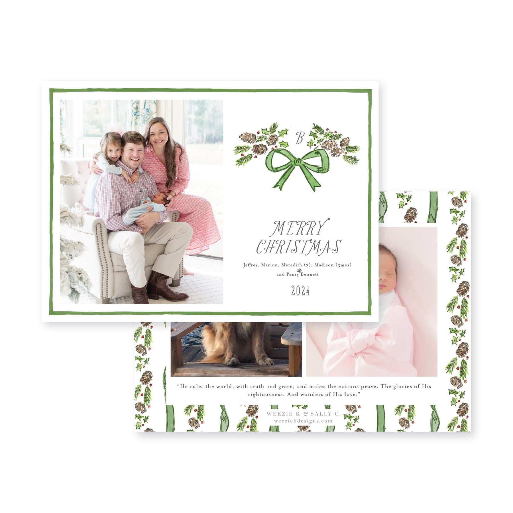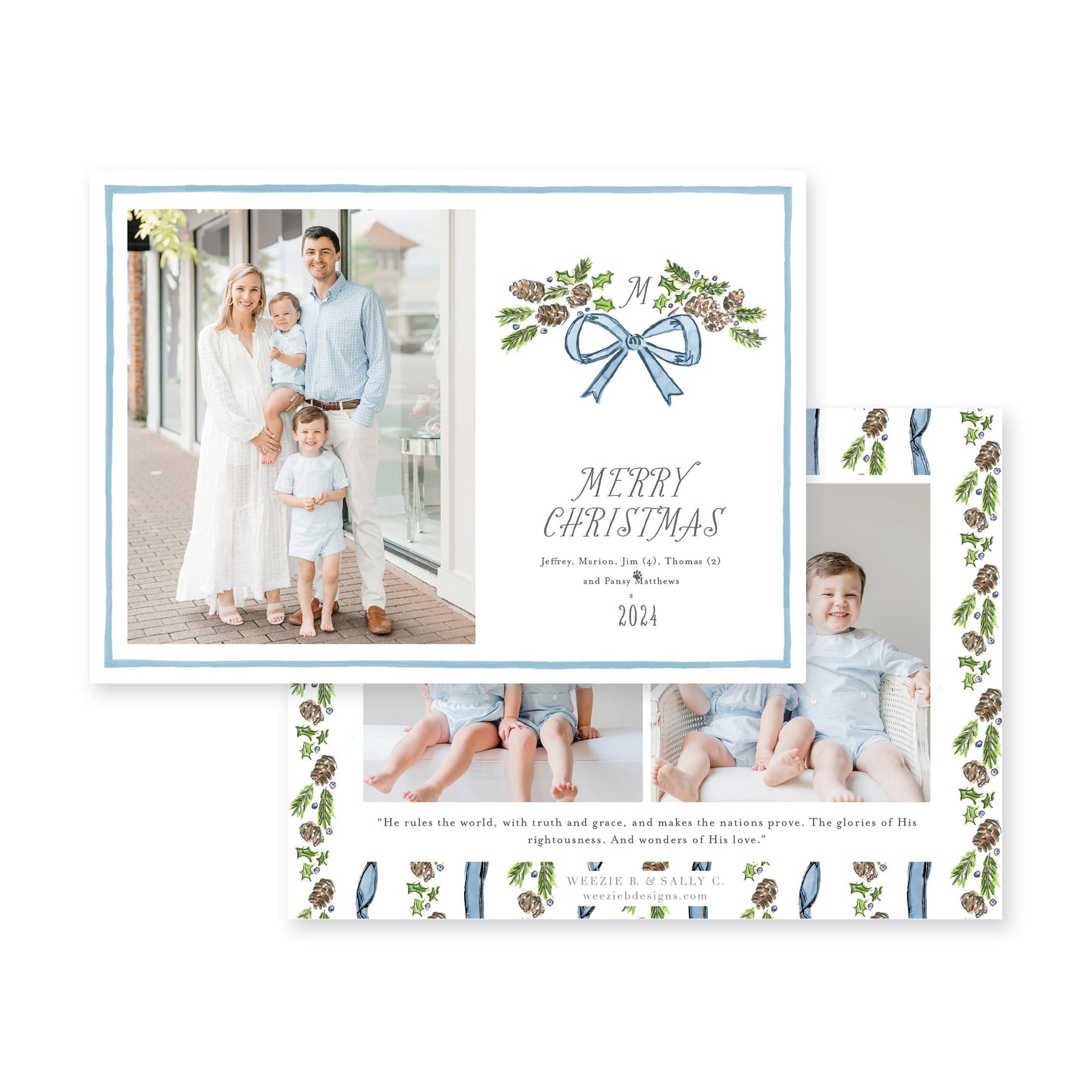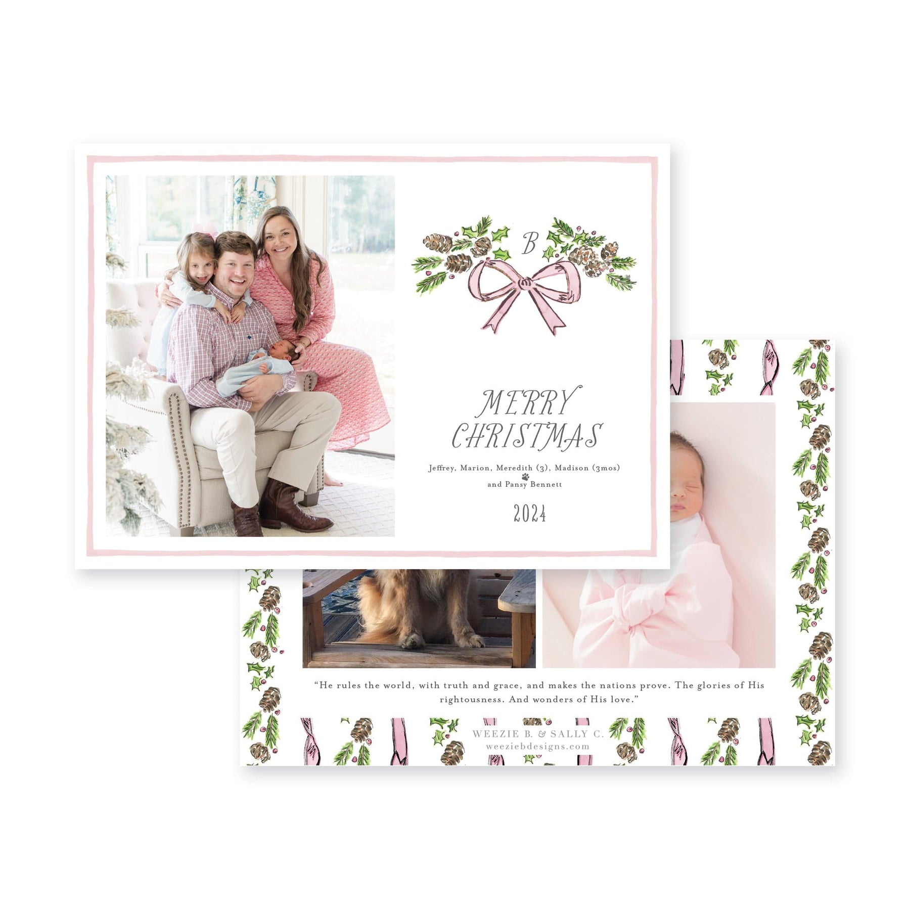 Our Pinecone Laurel Bow Christmas Card features your photo on the front framed in our watercolor ribbon and topped with evergreen, pine cones and berries with a blue, pink, or red bow. The back of this card can feature 0-4 images. Bible verse can be added, changed or switched to a phrase.