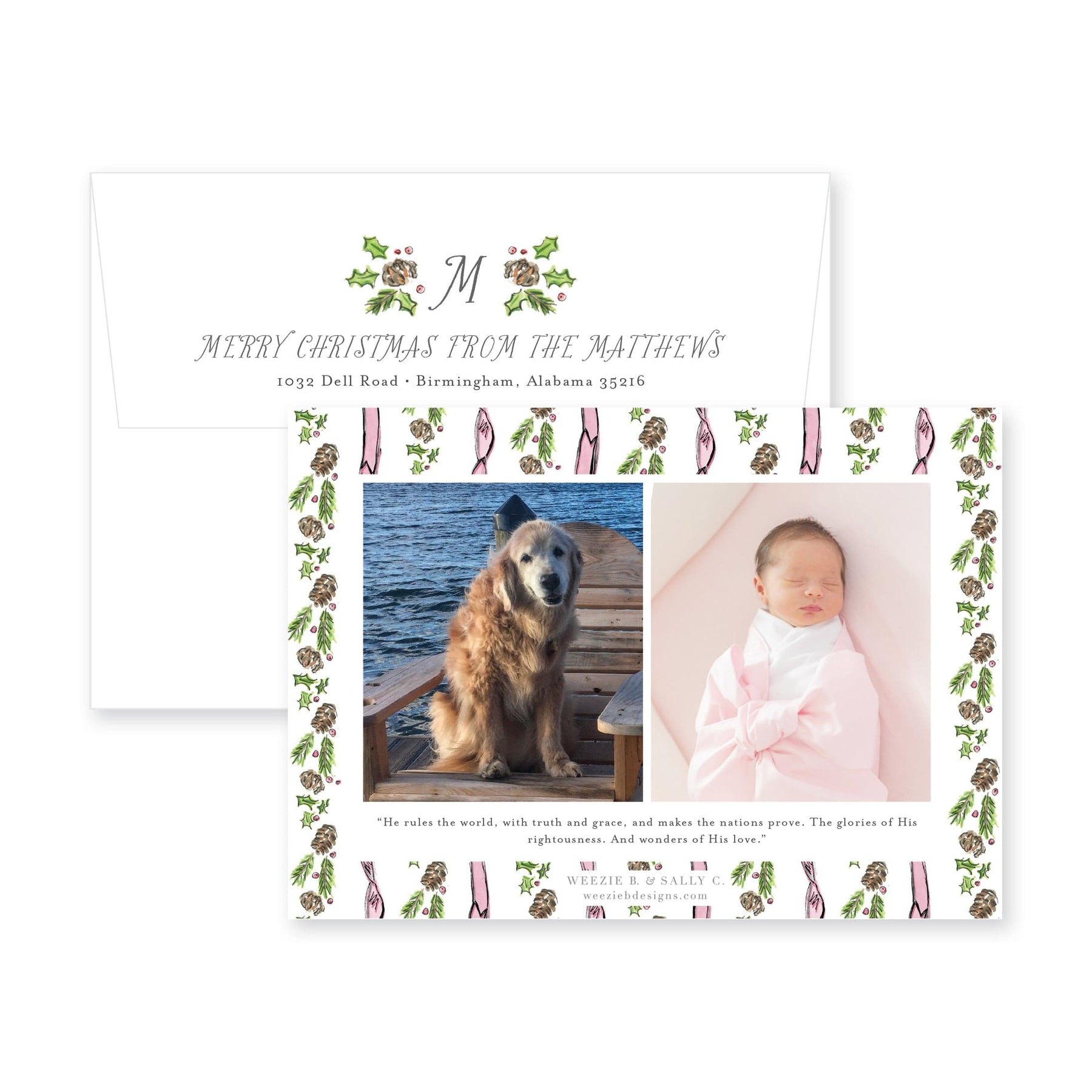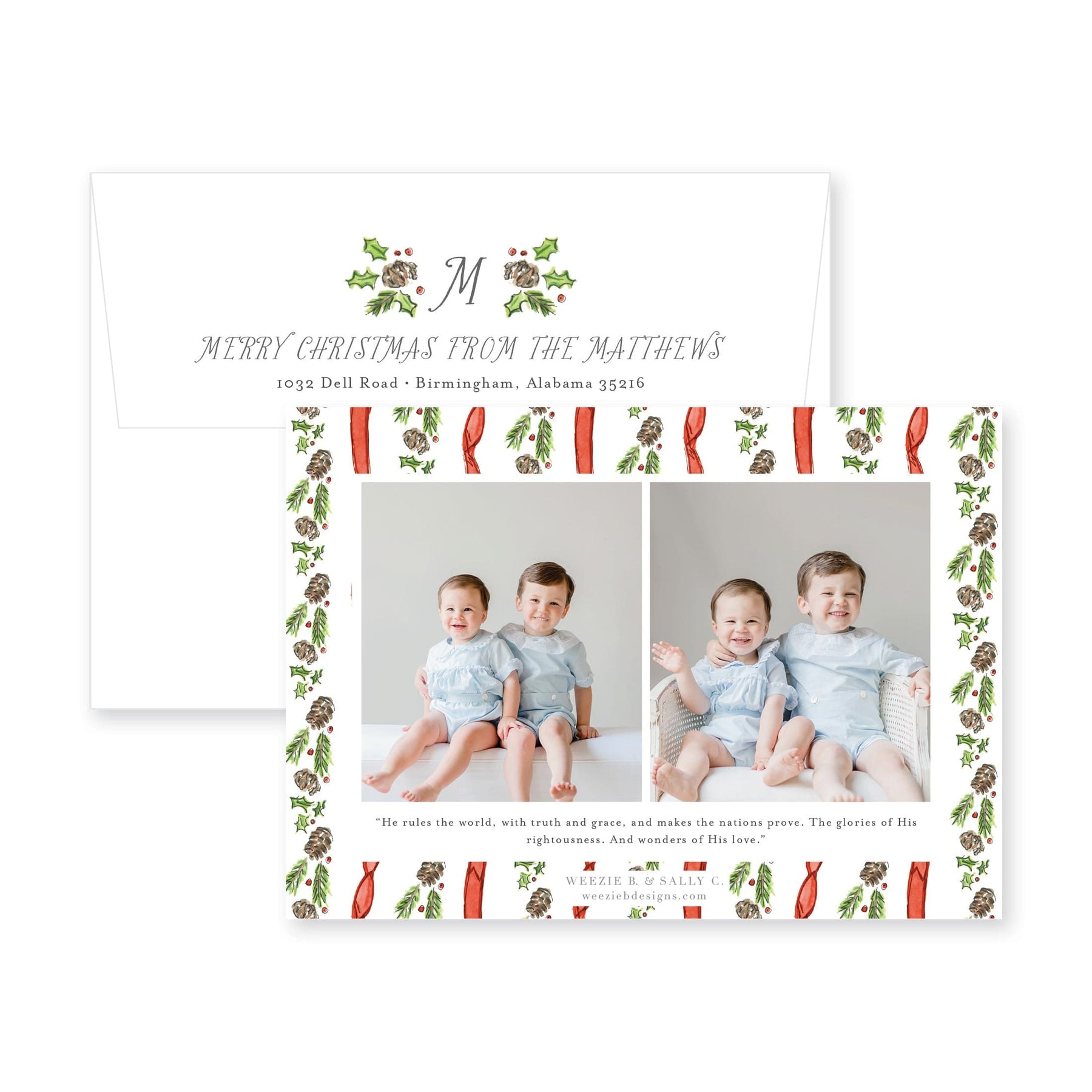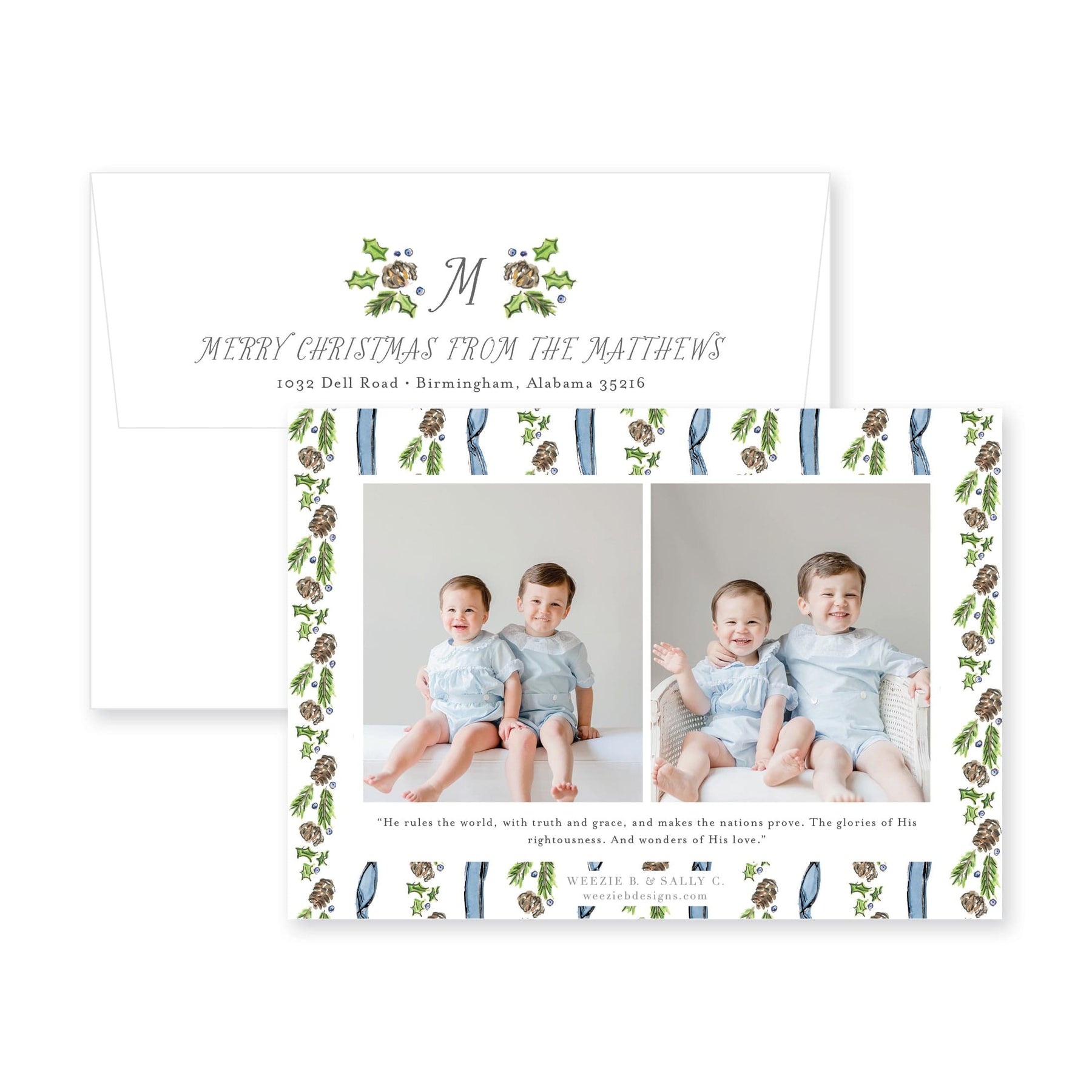 Our Pinecone Laurel Bow Christmas Card features your photo on the front framed in our watercolor ribbon and topped with evergreen, pine cones and berries with a blue, pink, or red bow. The back of this card can feature 0-4 images. Bible verse can be added, changed or switched to a phrase.