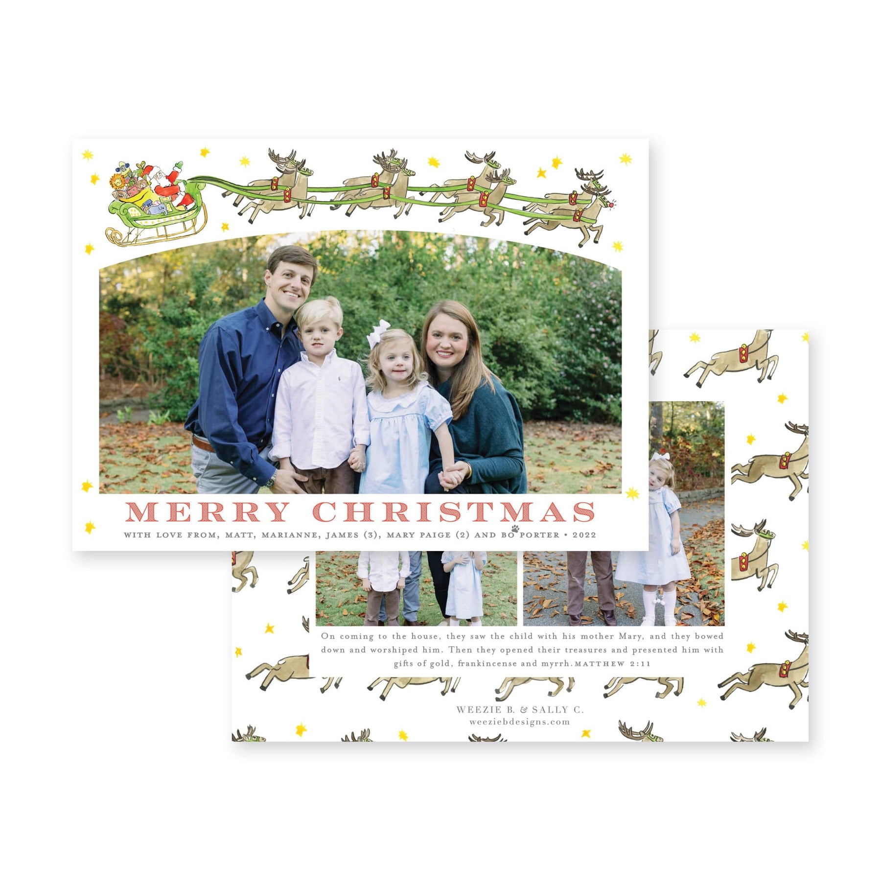 Our Santa's Sleigh Whimsical Vertical Christmas Card features our watercolor Santa in his sleigh with his reindeer and Rudolf leading the way. He has his sack full of toys and is surrounded by stars. This whimsical card is sure to be a treat for anyone who receives it!