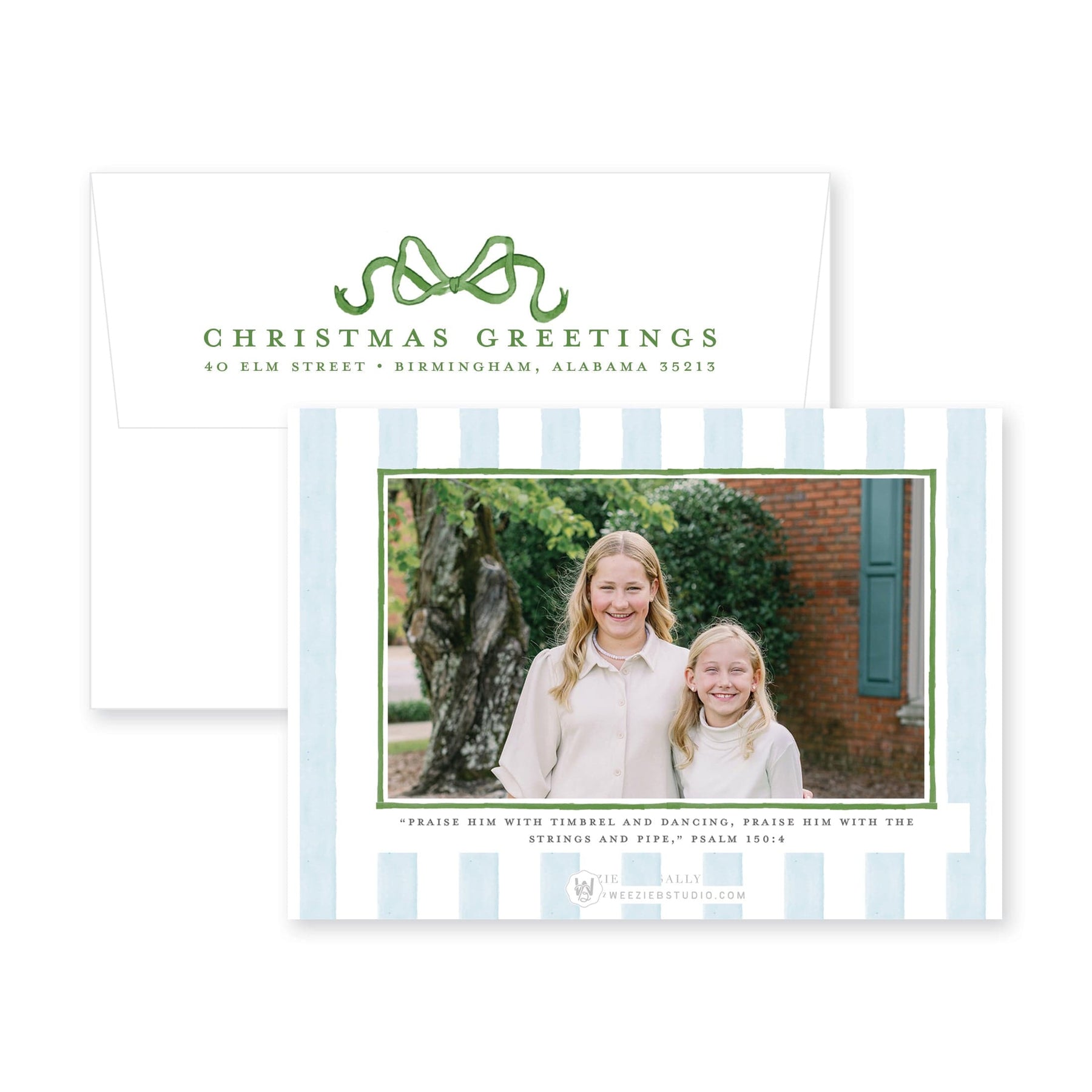 Our Striped Bow Frame Horizontal Christmas Card- Polished stripes and a bold green bow create festive charm. The back of this card can feature 0-4 images. Bible verse can be added, changed or switched to a phrase. Available in multiple color options