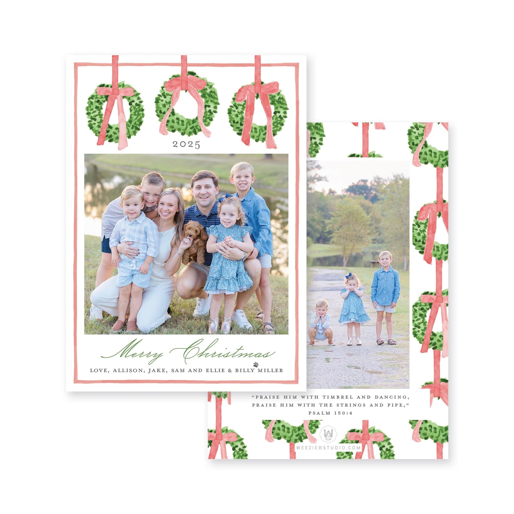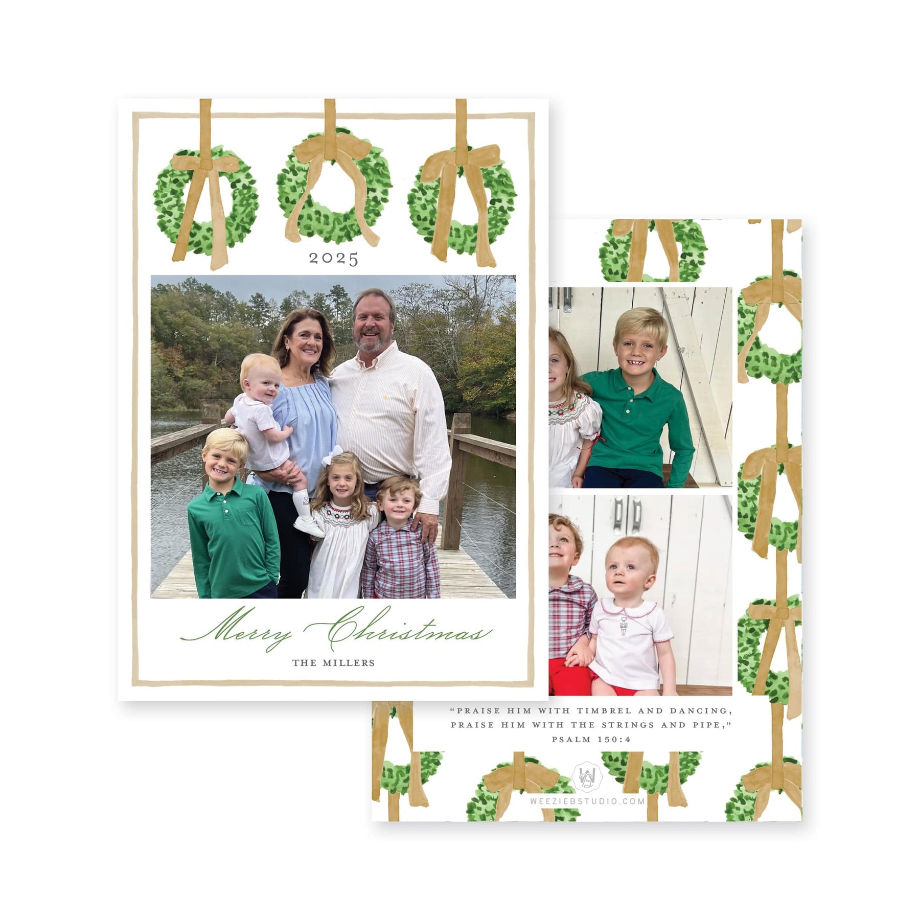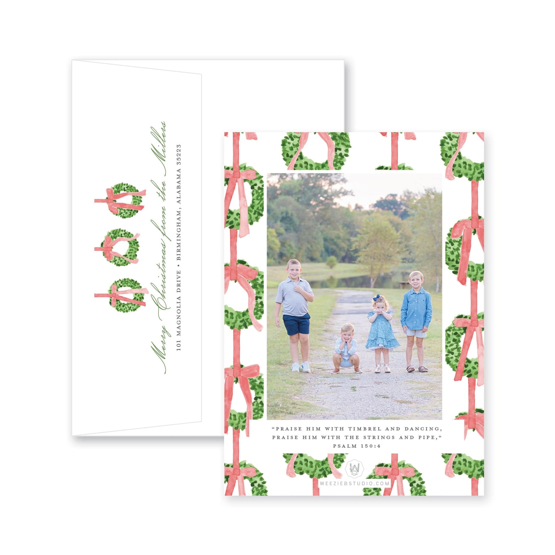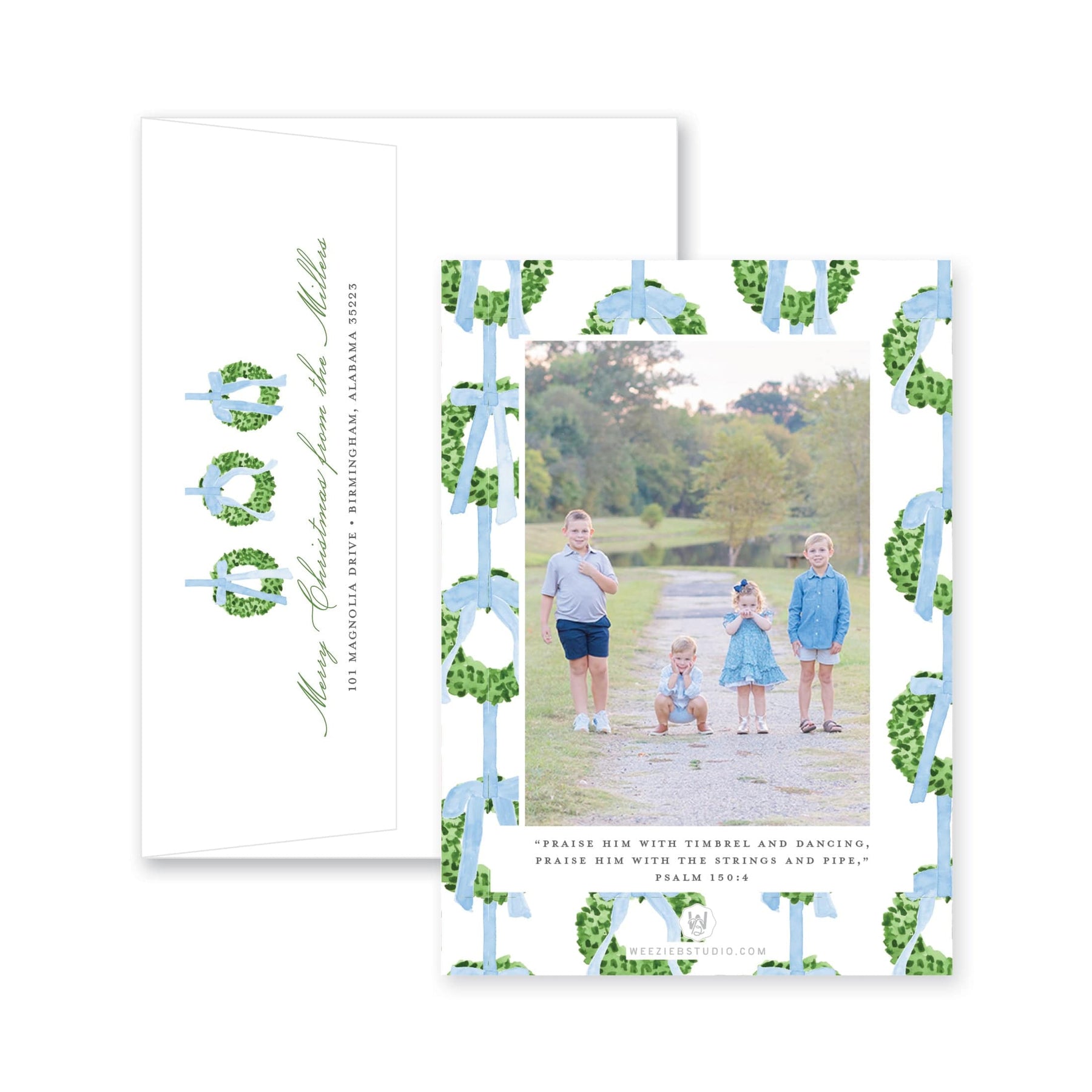 Our Trio of Wreaths Vertical Christmas Card- A trio of greenery wreaths tied with bows, polished and fresh. The back of this card can feature 0-4 images. Bible verse can be added, changed or switched to a phrase. Available in multiple color options