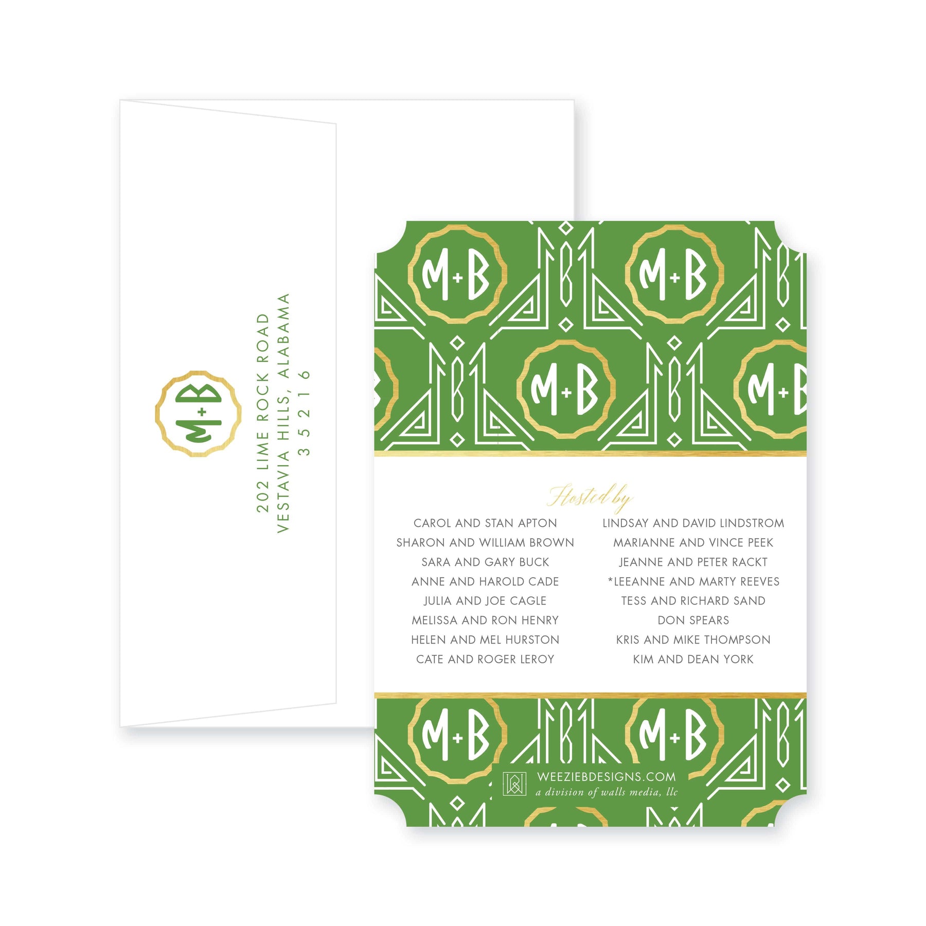 Our Gatsby in Green & Gold Engagement Party Invitation is Gatsbyesque, modern and elegant. This invitation will set the stage for an upscale party to celebrate the engaged couple!