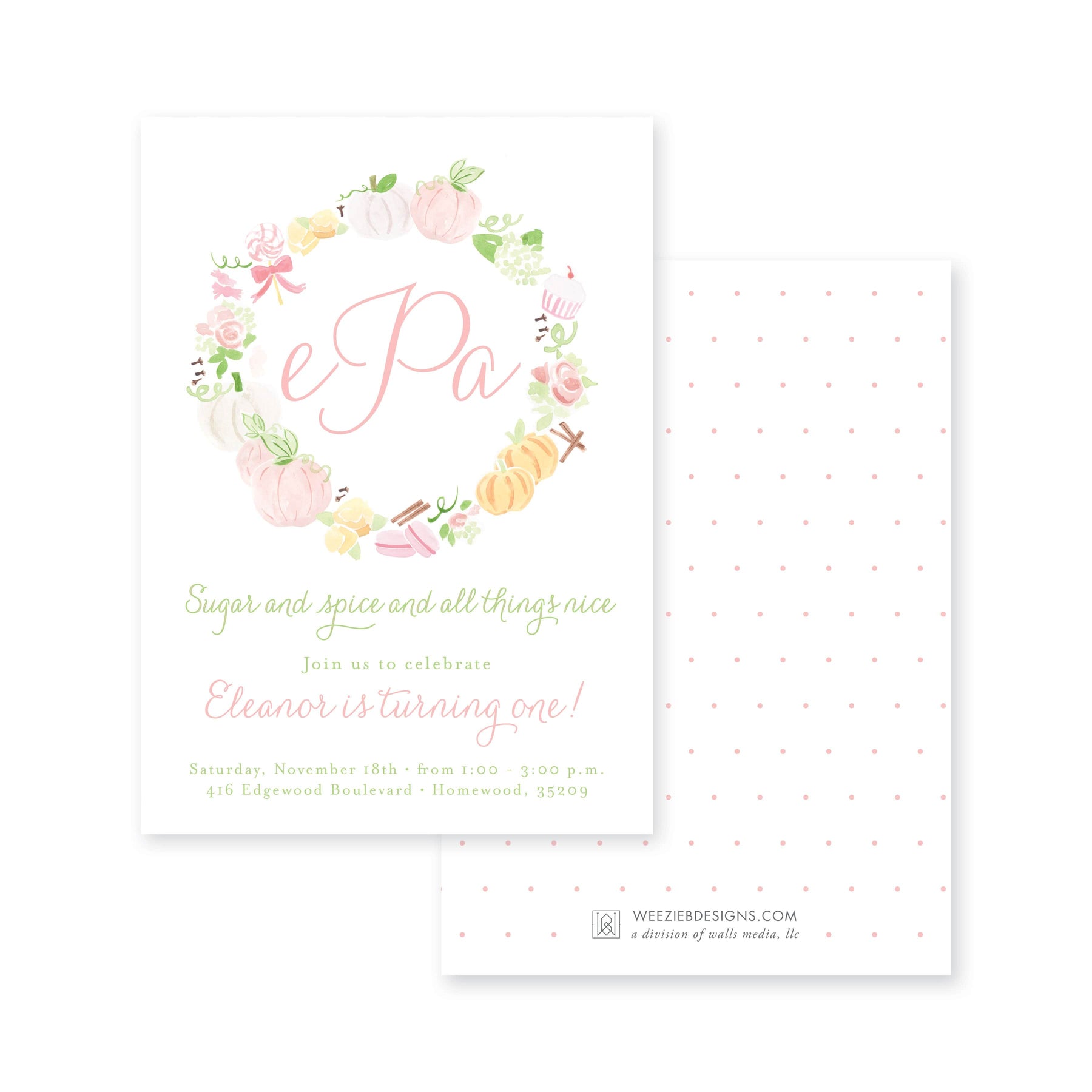 The perfect fall invitation design to celebrate your sweet little one turning one (or any other age)! Our watercolor pumpkin wreath gives this invitation such a fun and festive feel!