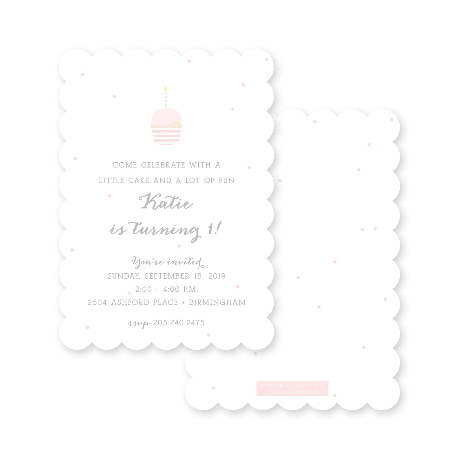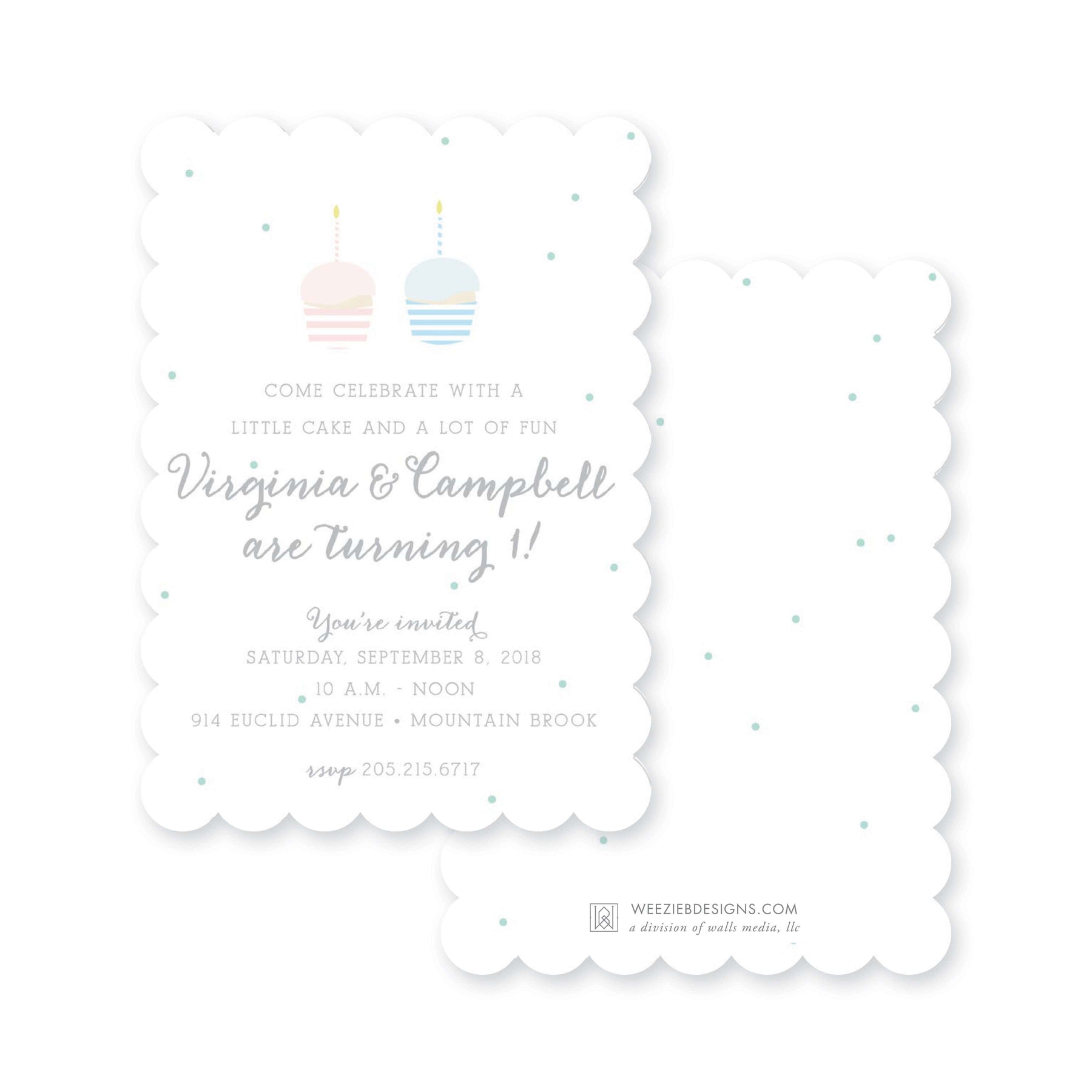 A simple way to celebrate your little ones birthday is with a Little Cupcake. You can celebrate multiples with this invitation- or make it for just one little cupcake! These sweet colors and fonts with simple dots make for a simple, but cute, birthday invitation. (If your little cupcake isn't turning one, we work in any age!)