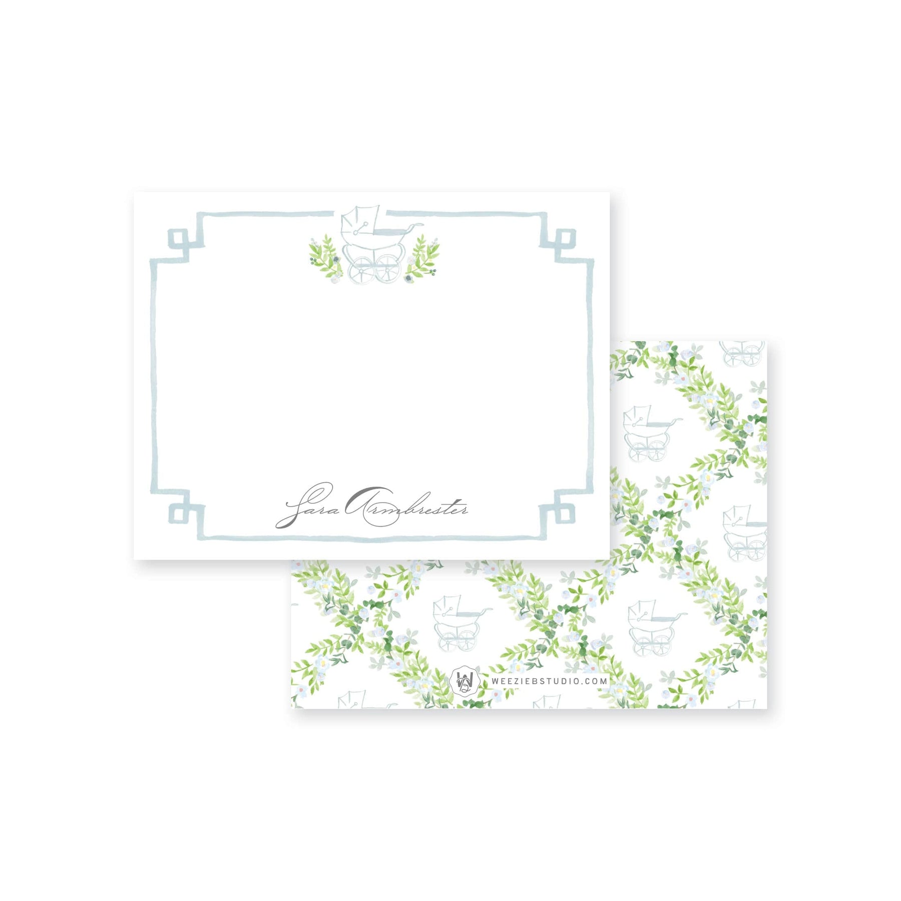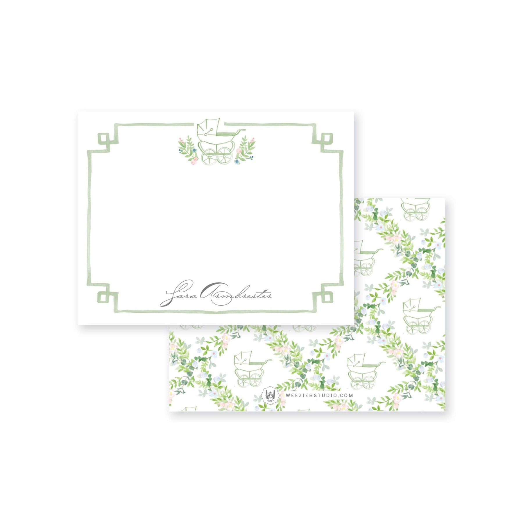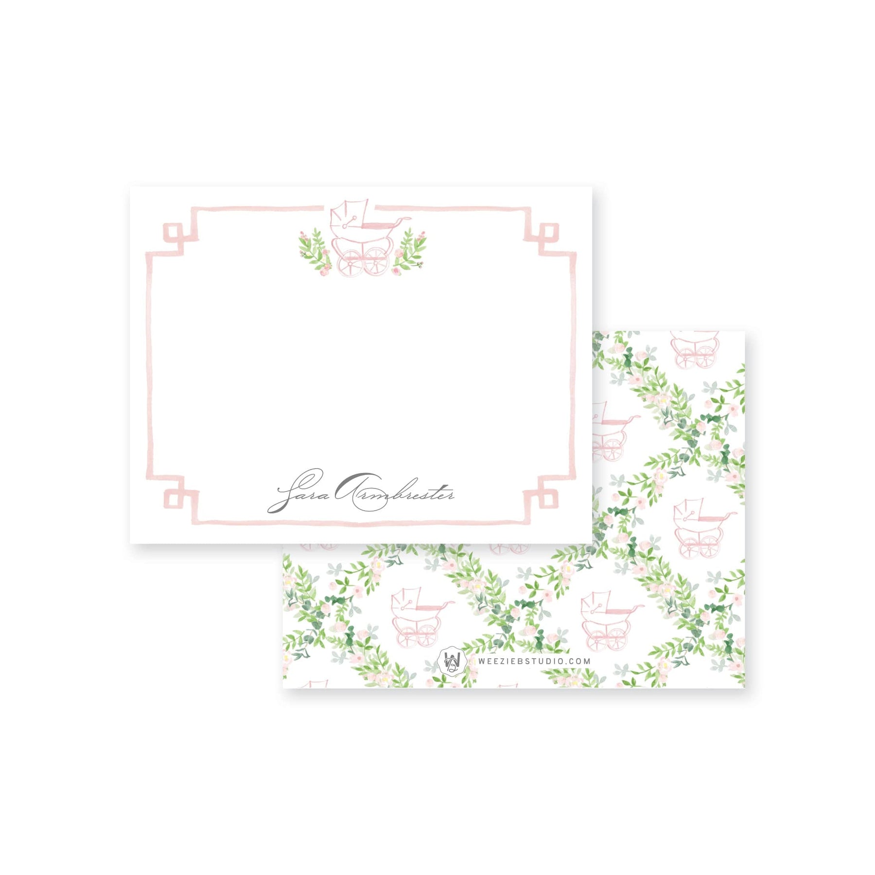 Our Prim Pram Floral Trellis Flat Note Cards features our watercolor florals surrounding a stroller (pram) with your name. They'll be pretty for thank you notes or any type of note!