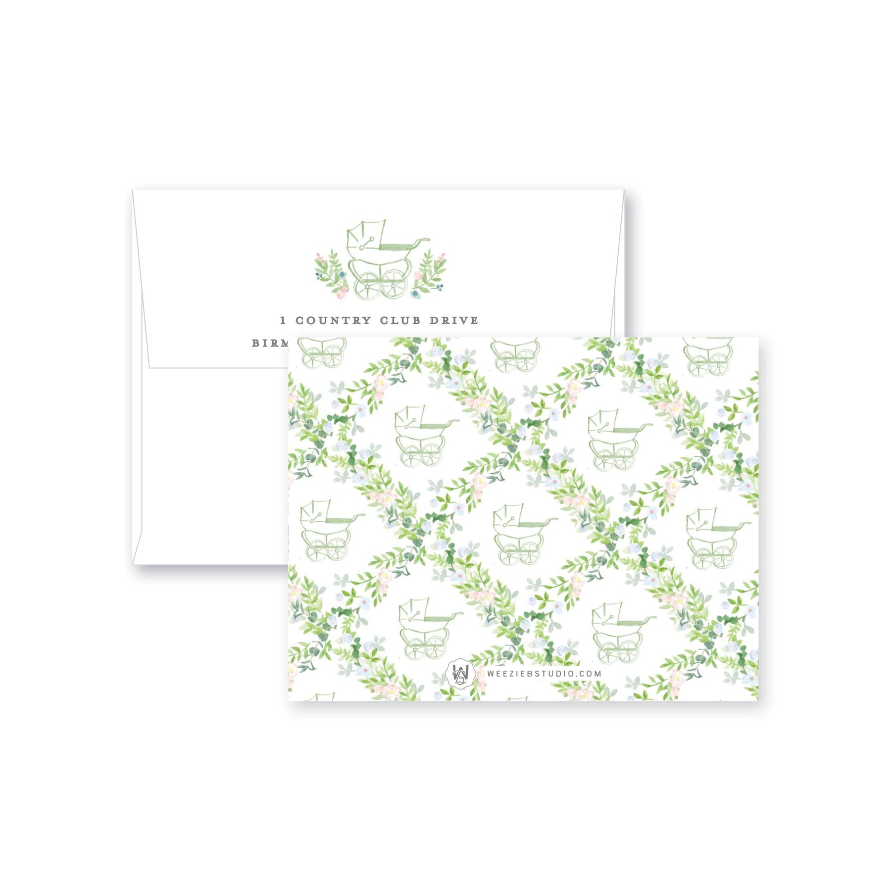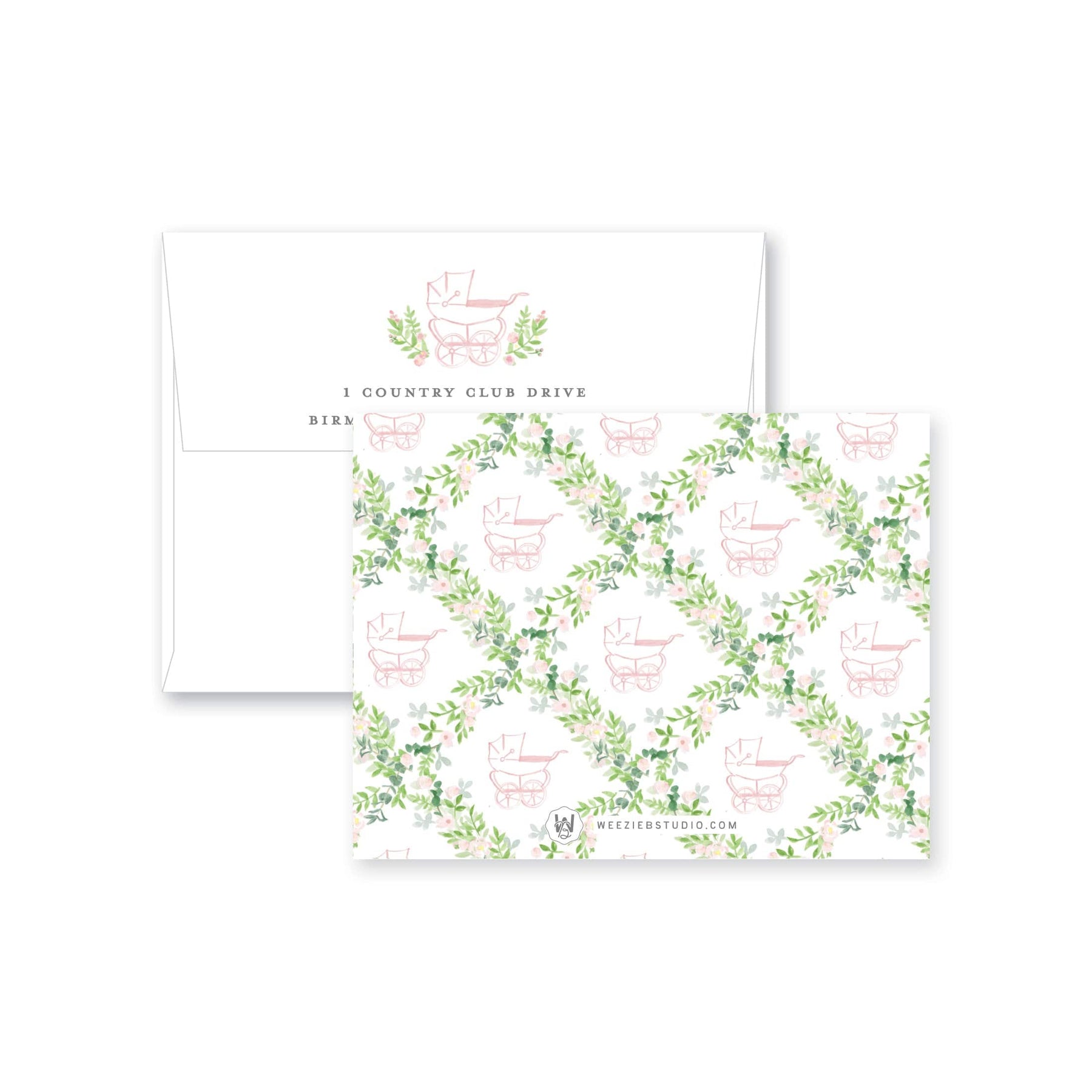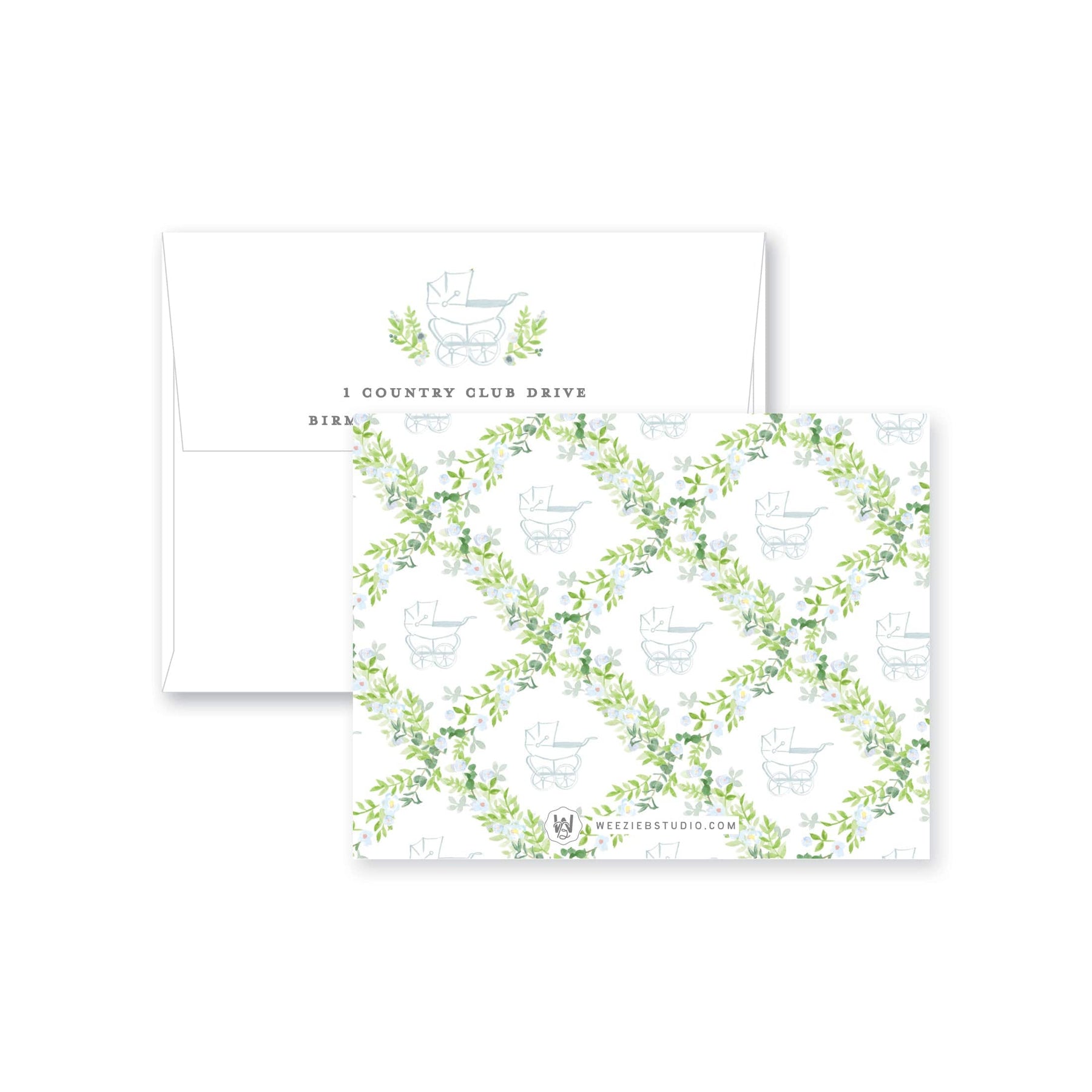 Our Prim Pram Floral Trellis Flat Note Cards features our watercolor florals surrounding a stroller (pram) with your name. They'll be pretty for thank you notes or any type of note!