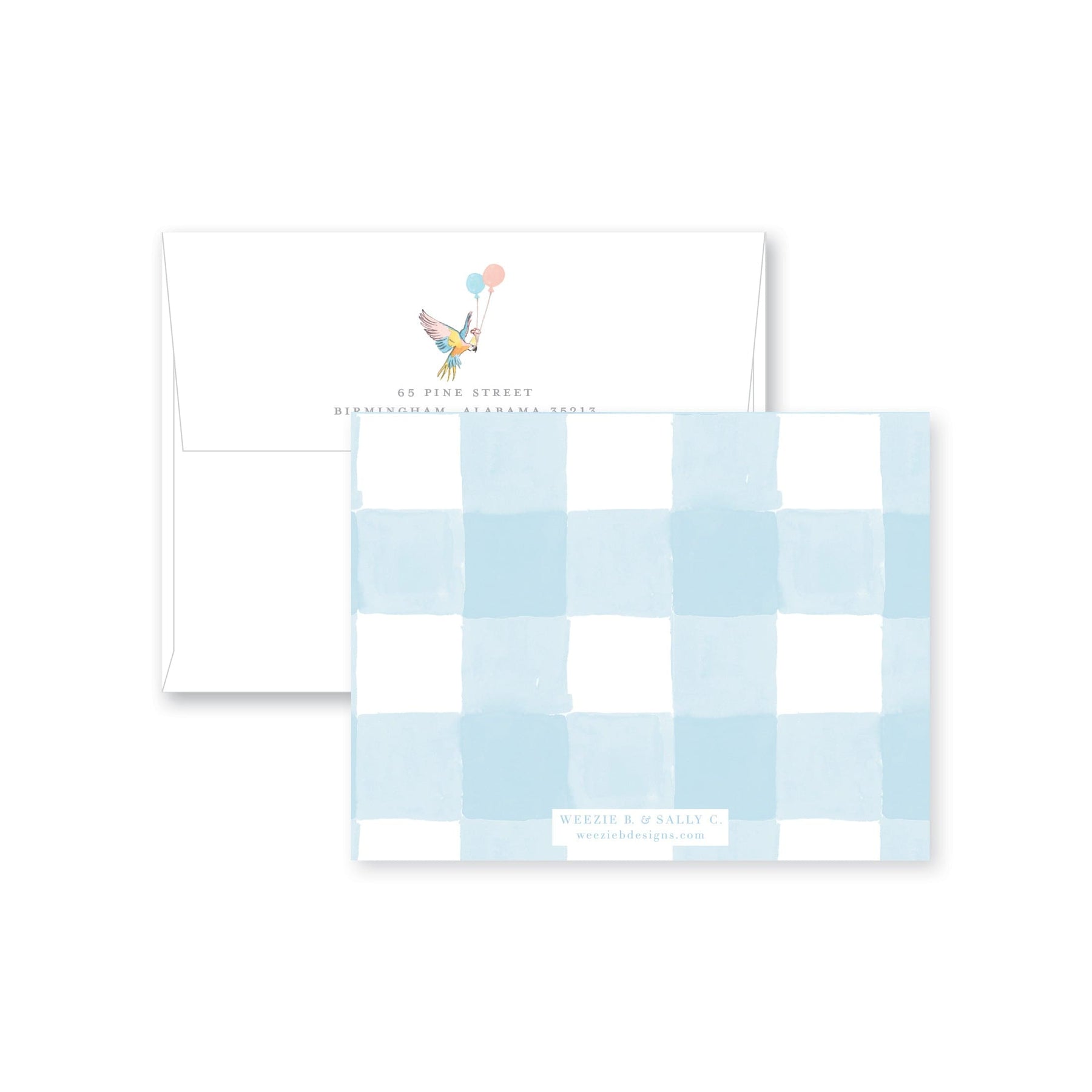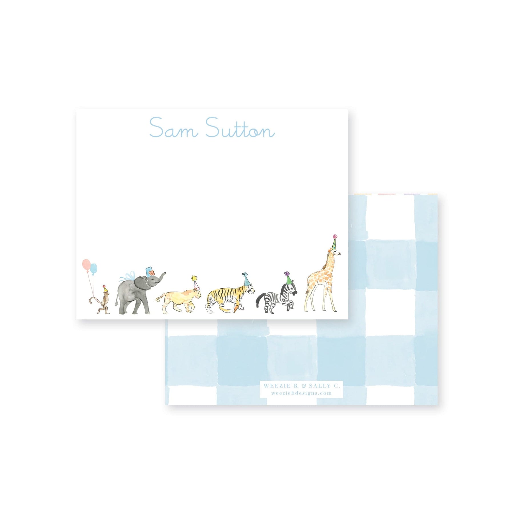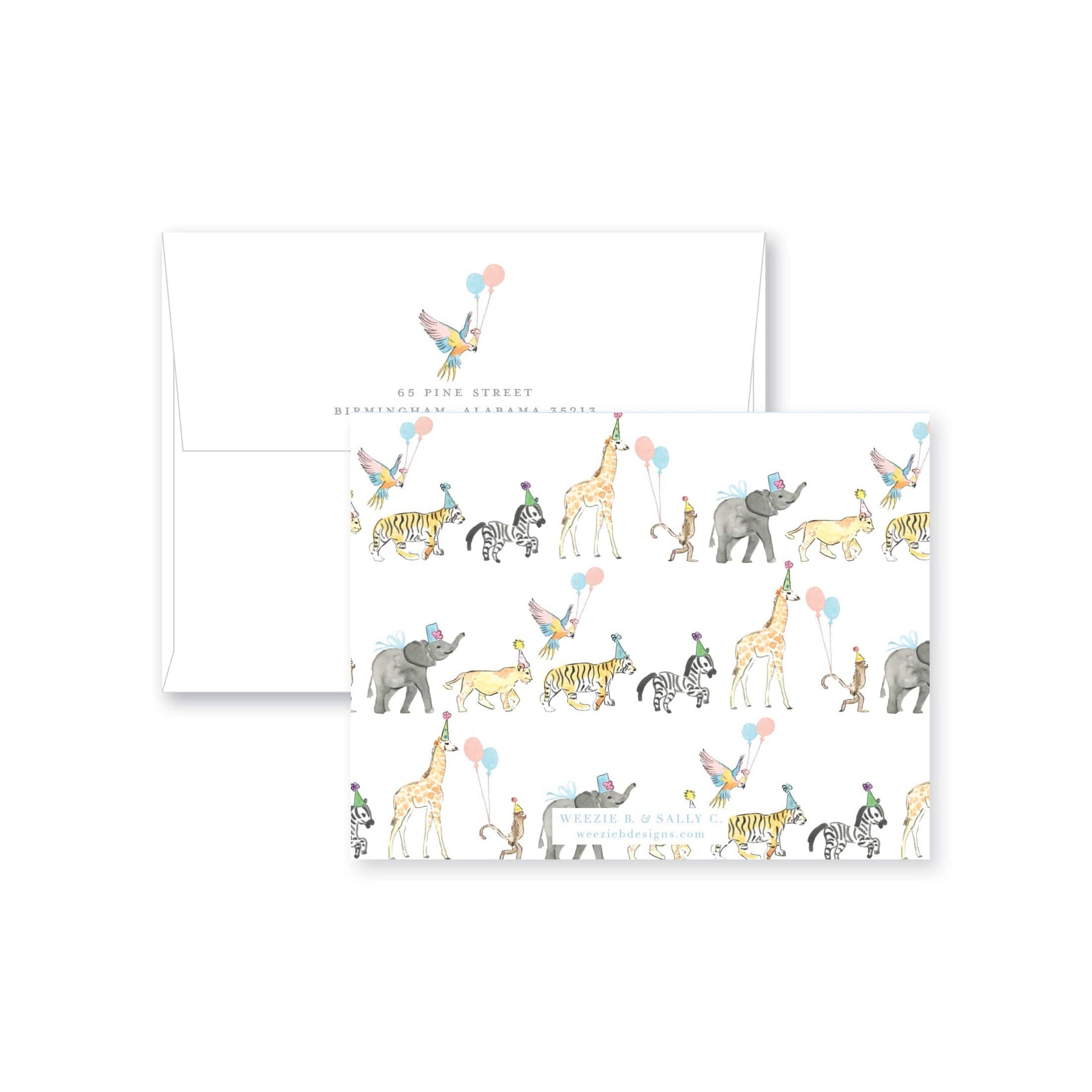 Wild About Zoo Flat Note Cards feature a parade of watercolor zoo animals with balloons and party hats and your name personalized. Festive and fun, you can use these for thank you notes or just a card for any type of note!