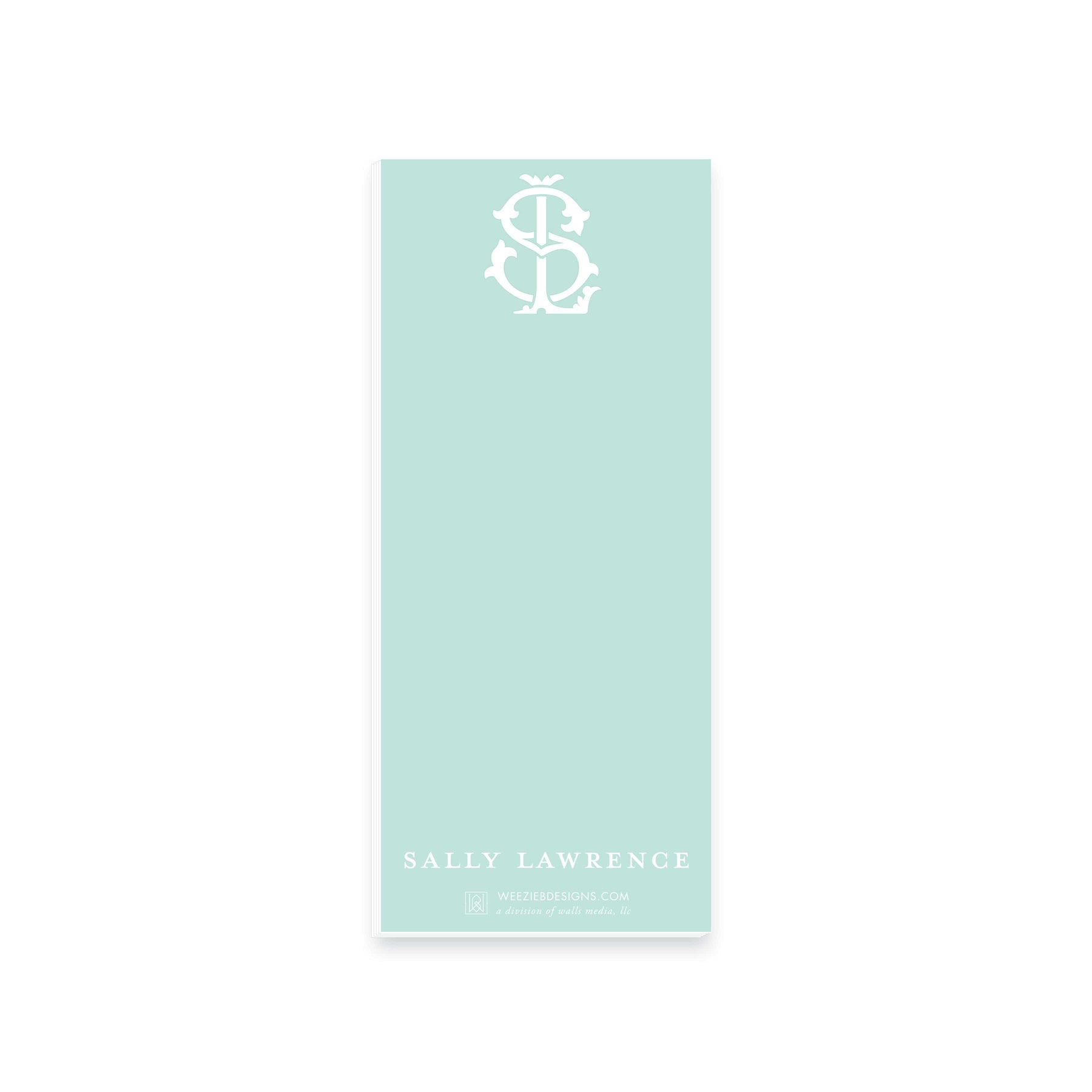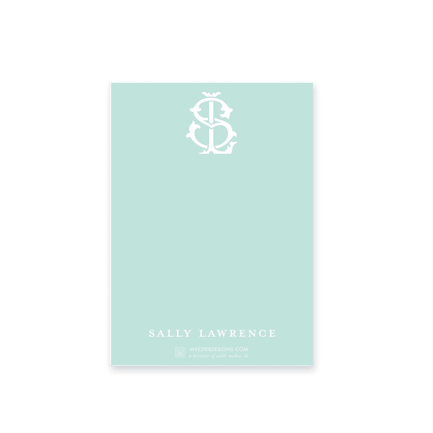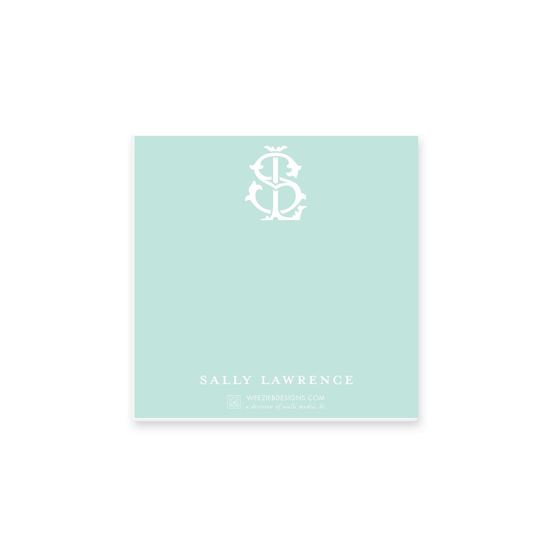 Weezie B. Designs Two-Letter Intertwine Notepad features a sea-foam background with our #19 Two-Intertwine monogram in white. This chic notepad will bring a little something special to your desk or counter!