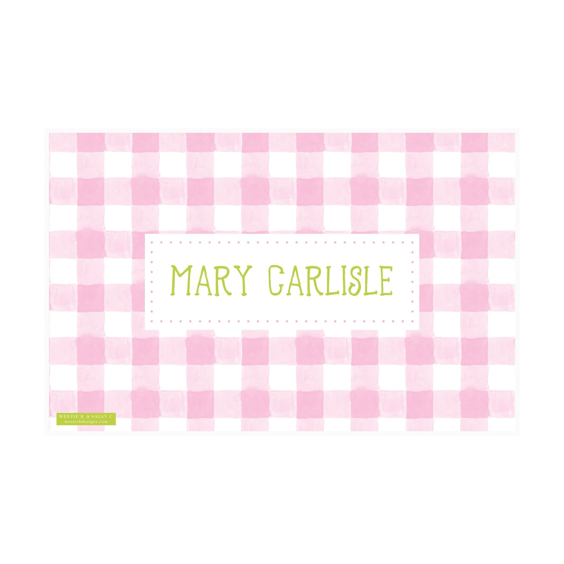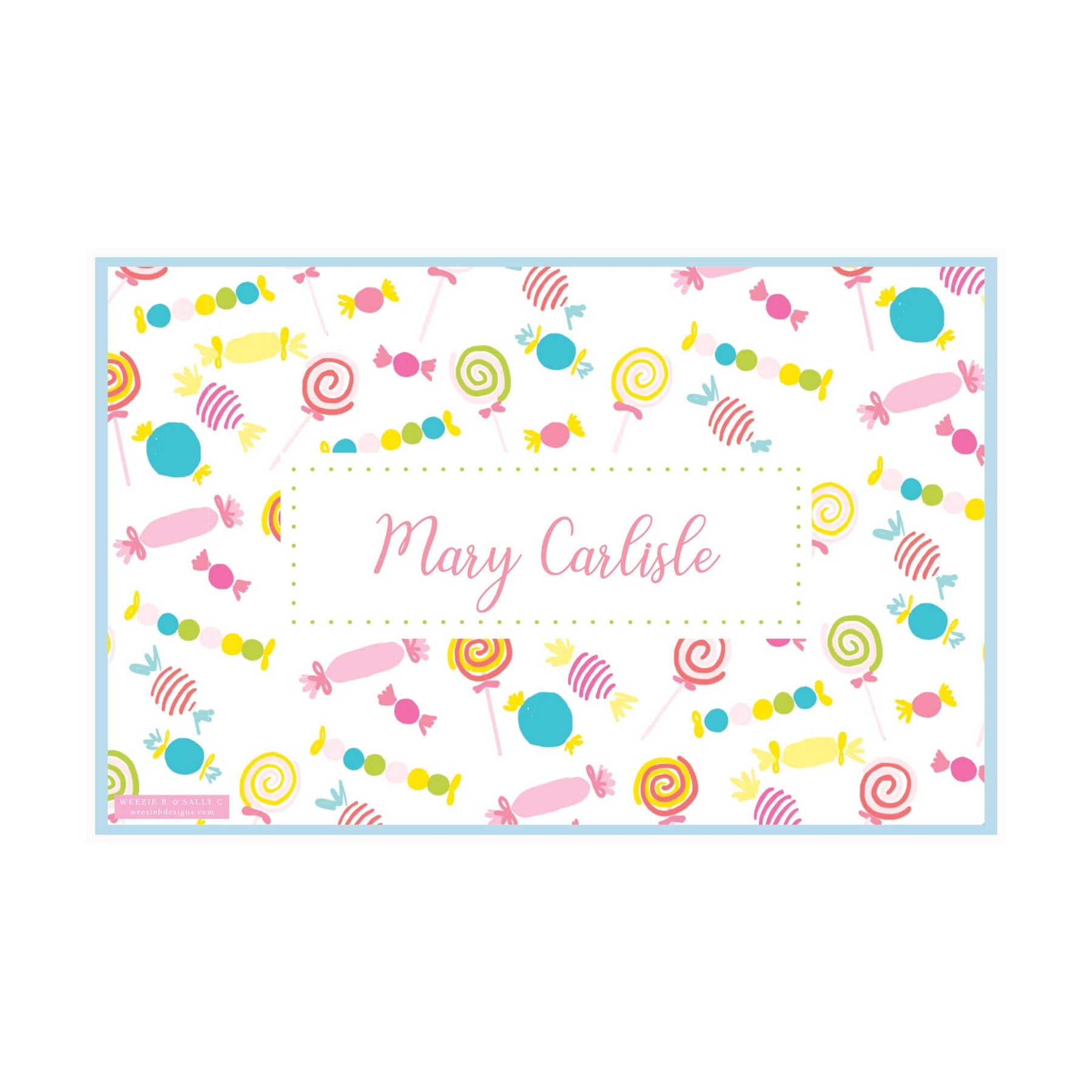 Our Candy Confetti Laminated Placemat makes a sweet addition to your table. Your little one will love the bright treat pattern and gingham on the back- and you'll be happy to keep your table a little less messy. The other side features watercolor gingham with your little ones name in a box in the middle. These Placemats are laminated so you can wipe and reuse. These personalized placemats make a great and usable gift for any occasion!