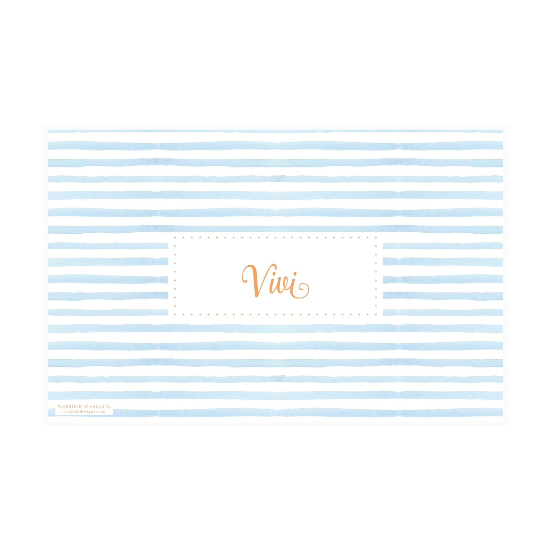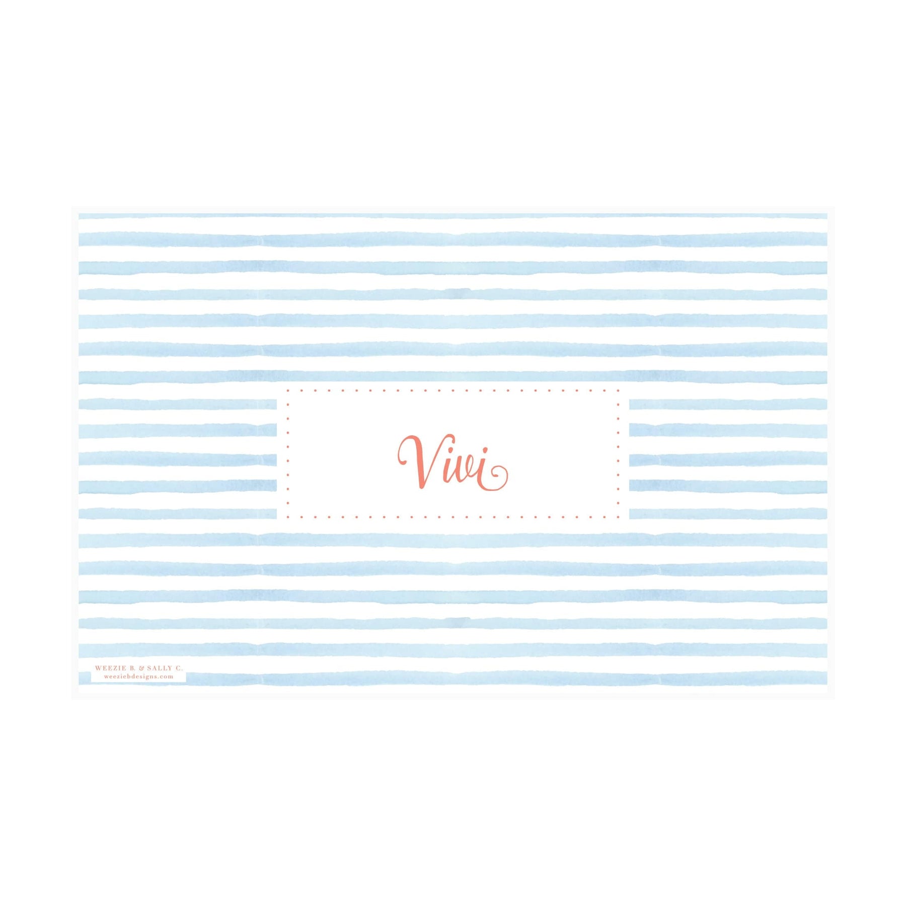 Our Cheer Watercolor - Stripes Laminated Place Mat makes a sweet addition to your table. Your little football/cheer fan will love their fun placemat- and you'll be happy to keep your table a little less messy. One side has our Watercolor cheerleaders with their name in the middle. The other side features a stripe pattern with your little ones name in a box in the middle. These Place Mats are laminated so you can wipe and reuse. These personalized place mats make a great and usable gift for any occasion!