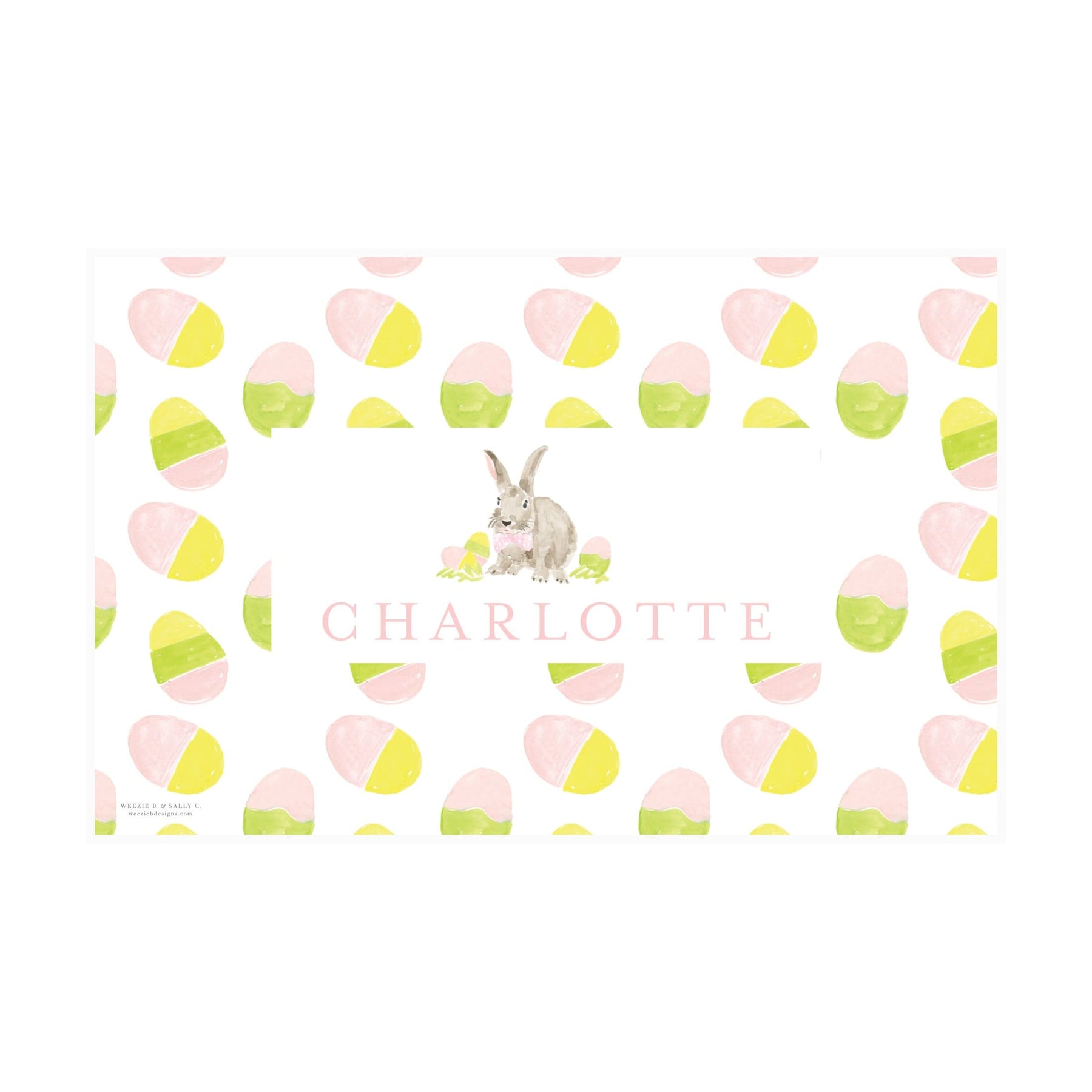 Our Dapper Easter Bunny - Stripes Laminated Place Mat makes a sweet addition to your table. Your bunny will love the striped side for any time of year and and the bunny and eggs watercolor pattern for Easter- and you'll be happy to keep your table a little less messy. These Place Mats are laminated so you can wipe and reuse. These personalized place mats make a great and usable gift for any occasion!