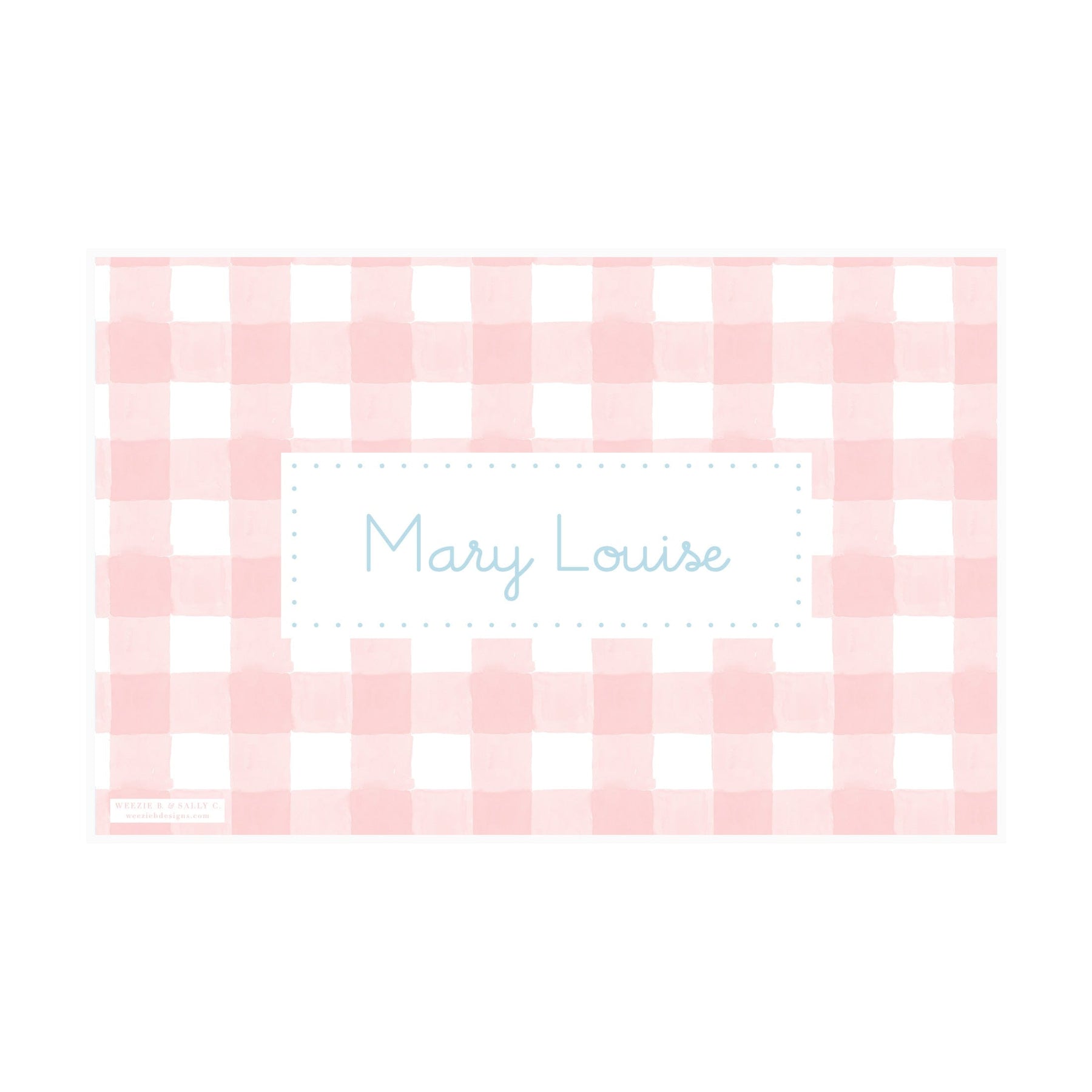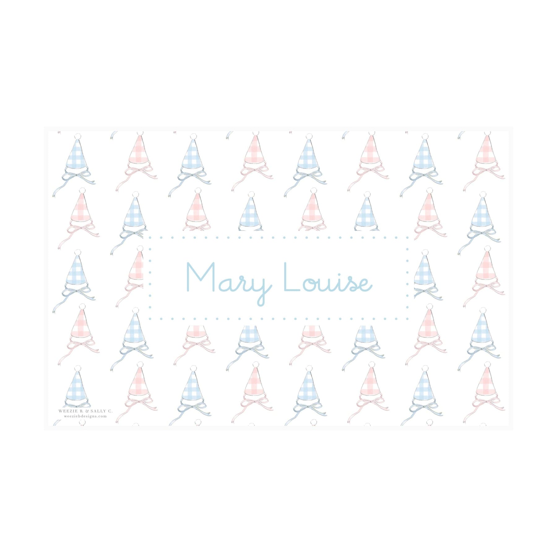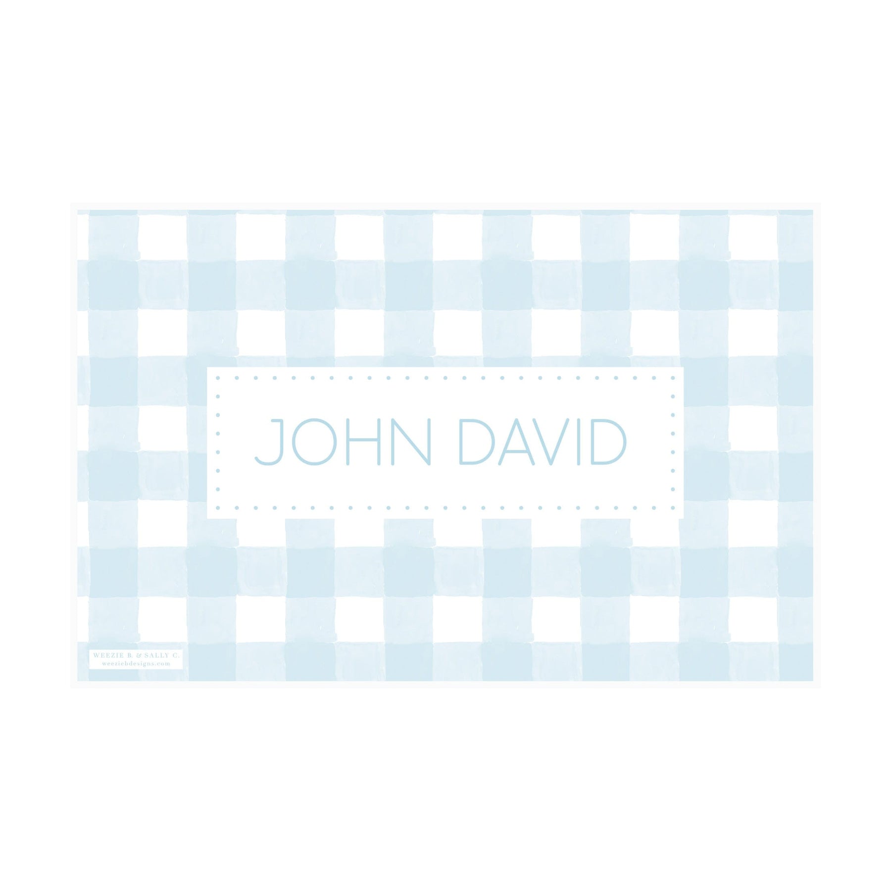 Our Gingham Party Hats Laminated Placemat makes a sweet addition to your table. Your little one will love the festive party hats pattern and gingham on the back- and you'll be happy to keep your table a little less messy. The other side features watercolor gingham with your little ones name in a box in the middle. These Placemats are laminated so you can wipe and reuse. These personalized placemats make a great and usable gift for any occasion!
