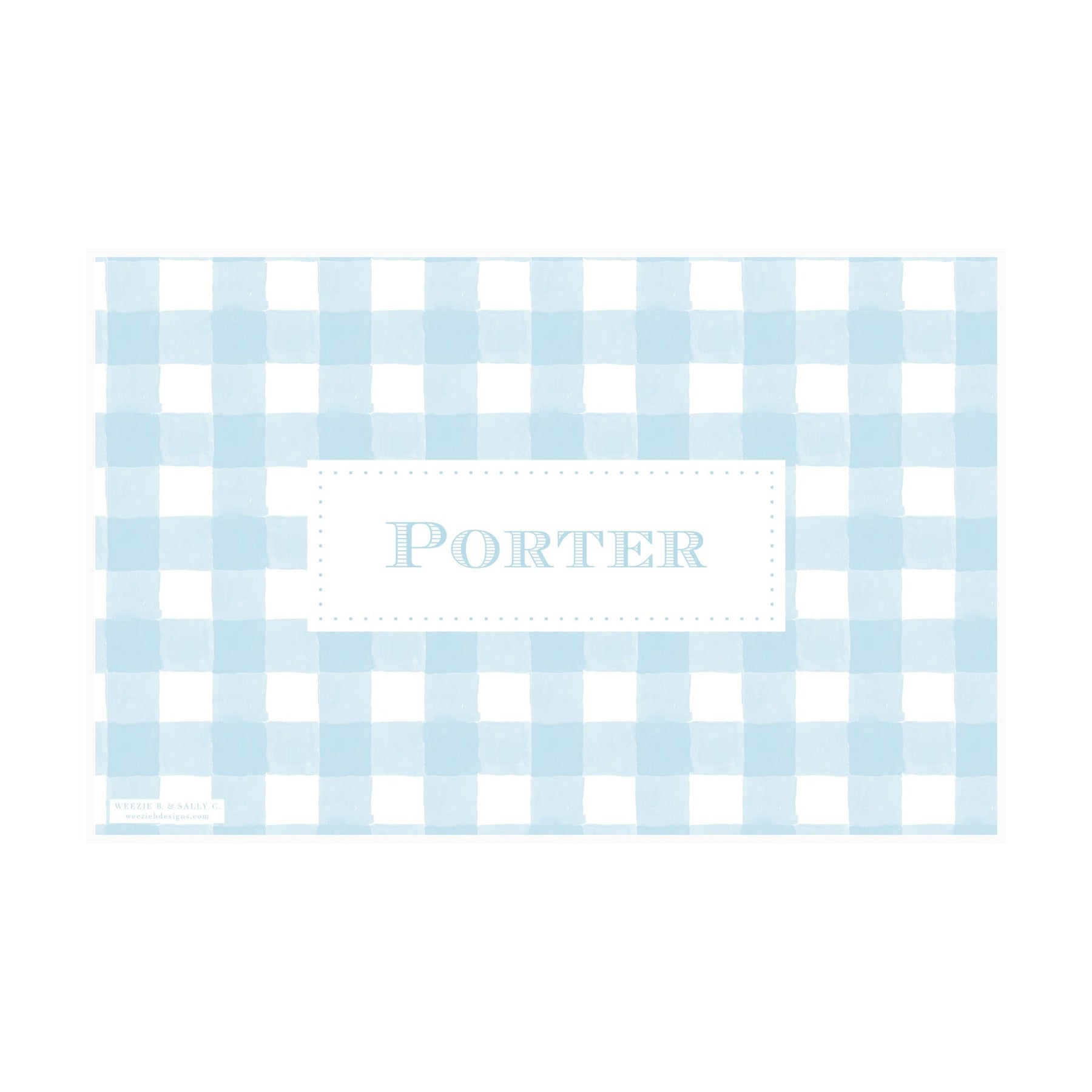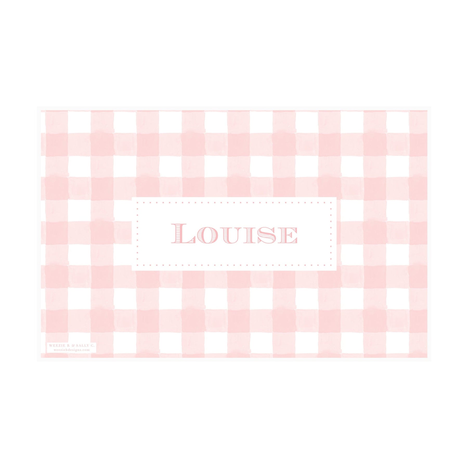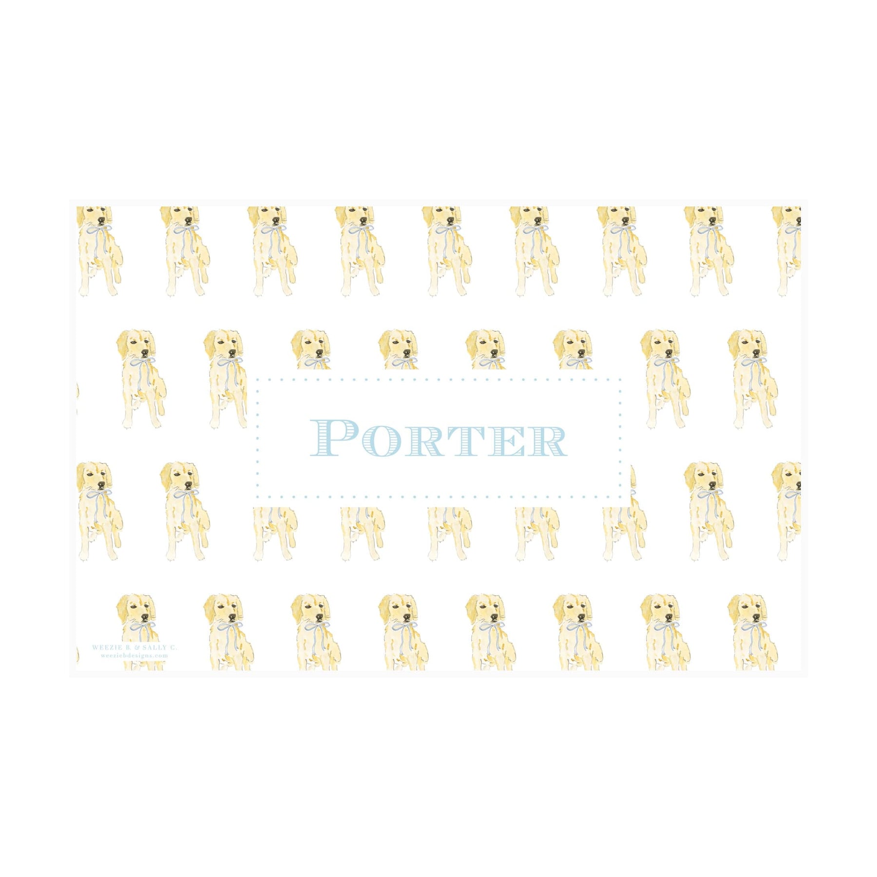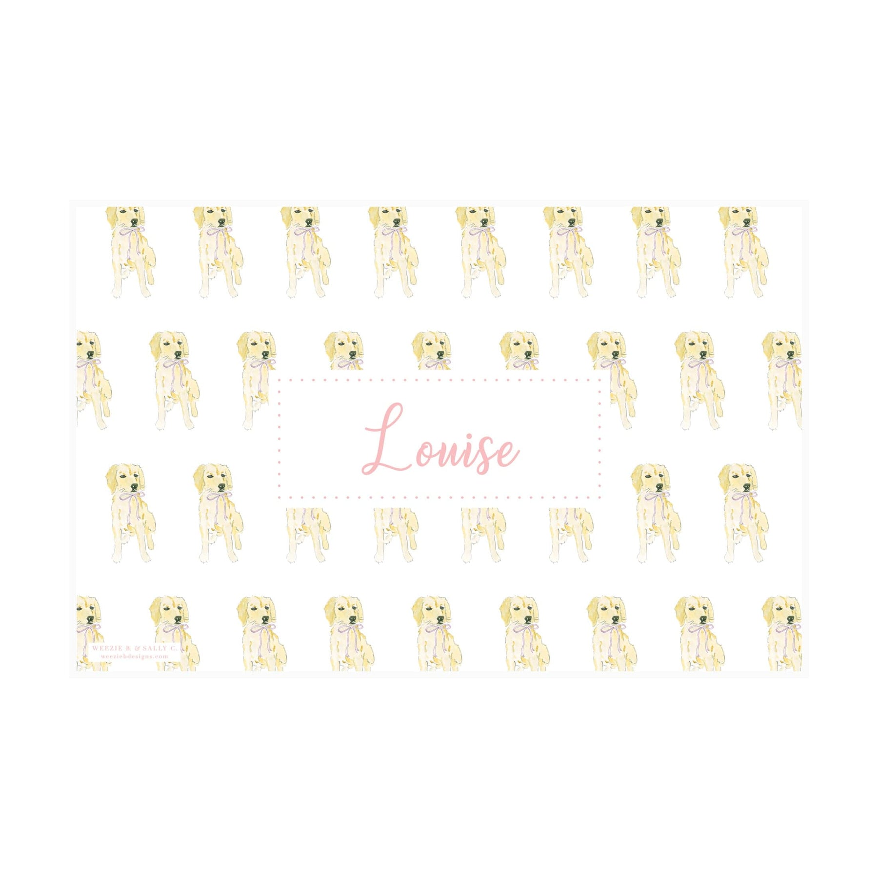 Our Golden in a Bow Laminated Place Mat makes a sweet addition to your table. Your little dog loving baby will love stripes and dog pattern- and you'll be happy to keep your table a little less messy. The other side features simple stripes with your little ones name in a box in the middle. These Place Mats are laminated so you can wipe and reuse. These personalized place mats make a great and usable gift for any occasion!