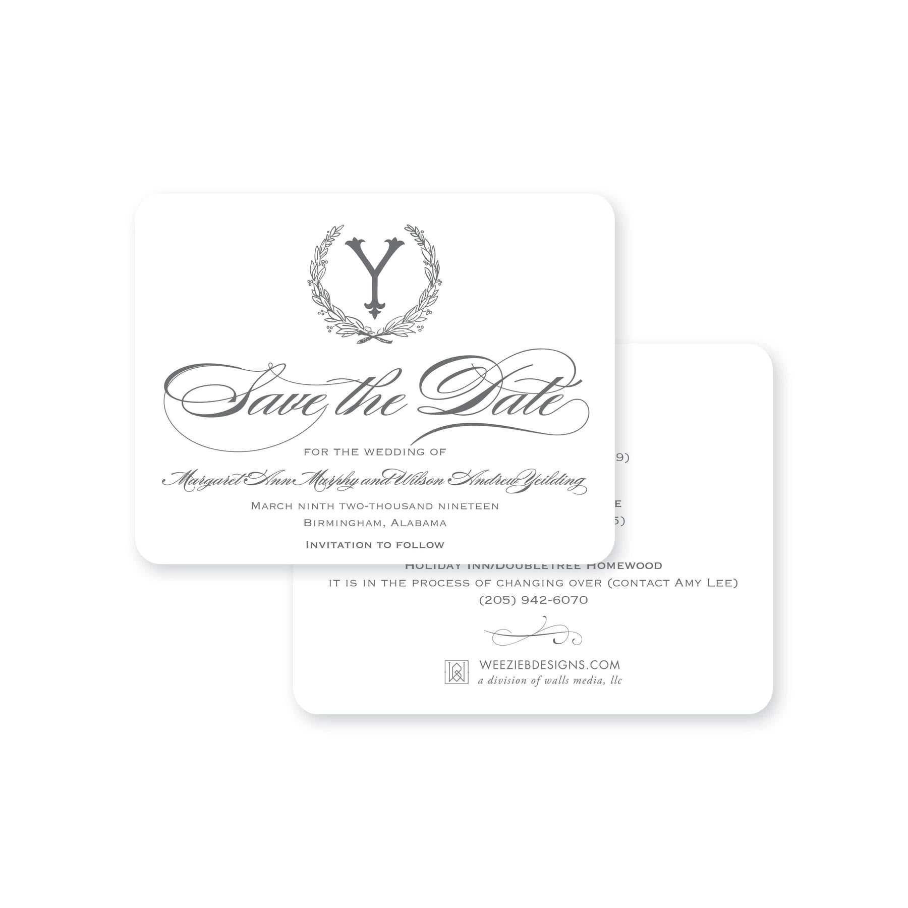 Save the Date in style with our Simple & Classic design. Our Laurel Wreath with your monogram in #28 Traditional and the words, Save the Date, and the bride and groom's name in our beautiful #13 Formal Script, is elegant and classic.