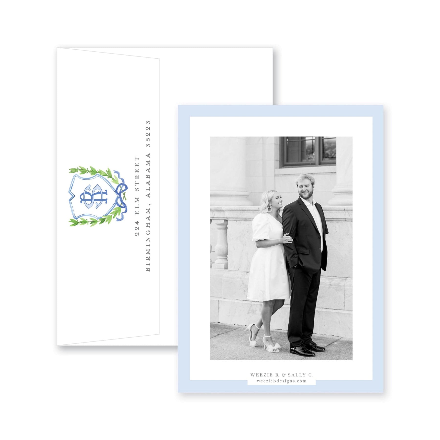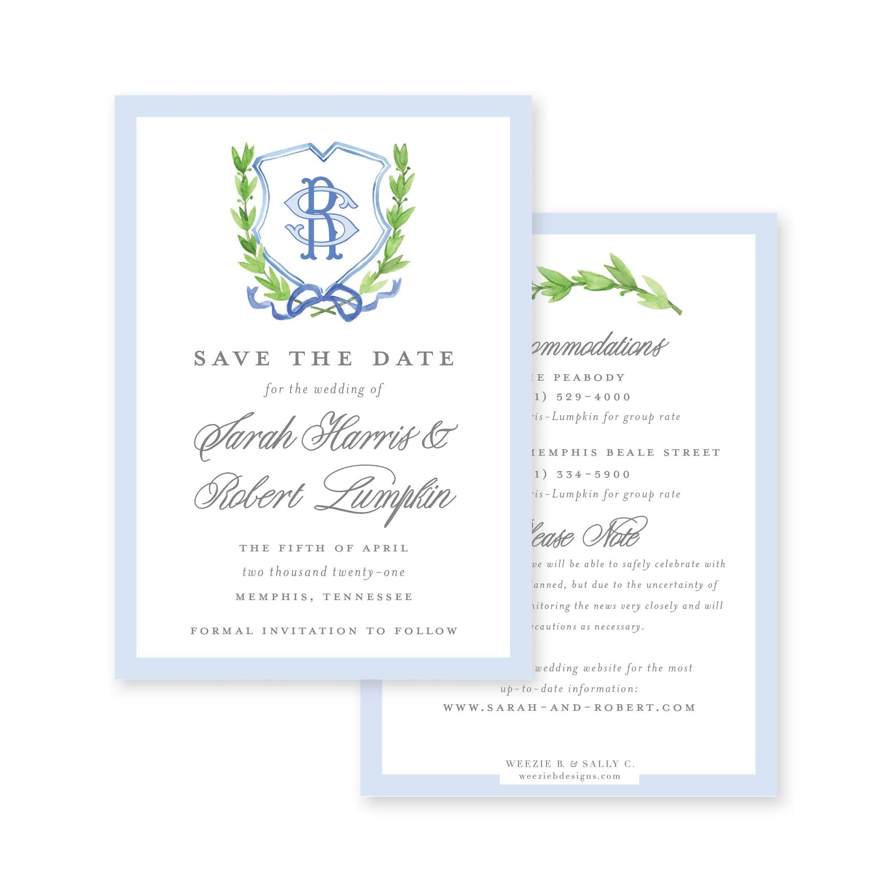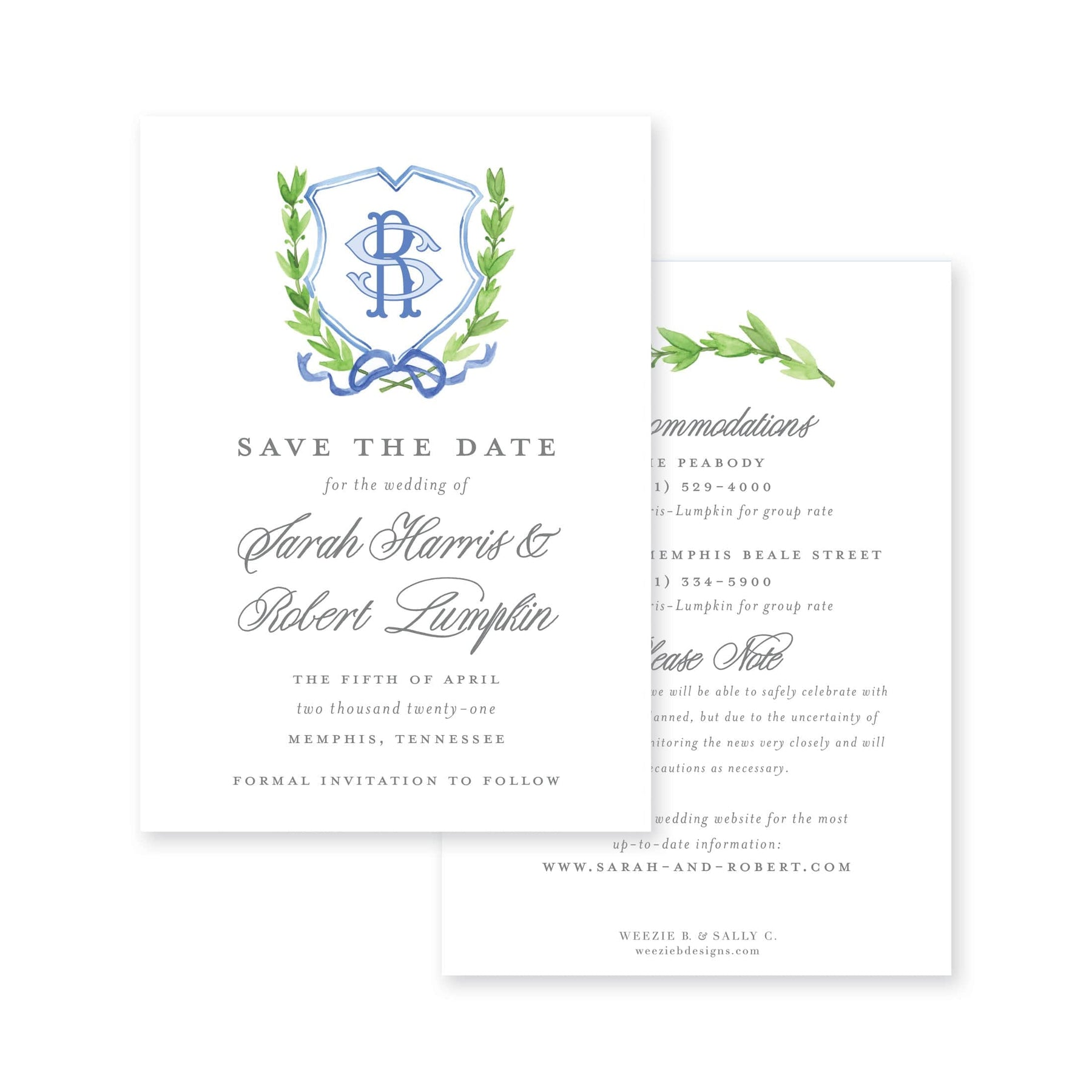 Crest 5 in Watercolor Save-the-date is elegant and timeless. Featuring a Watercolor Crest with our Two-Letter Intertwine Monogram. Perfect for any style wedding and will be a treasure to look at for years to come.