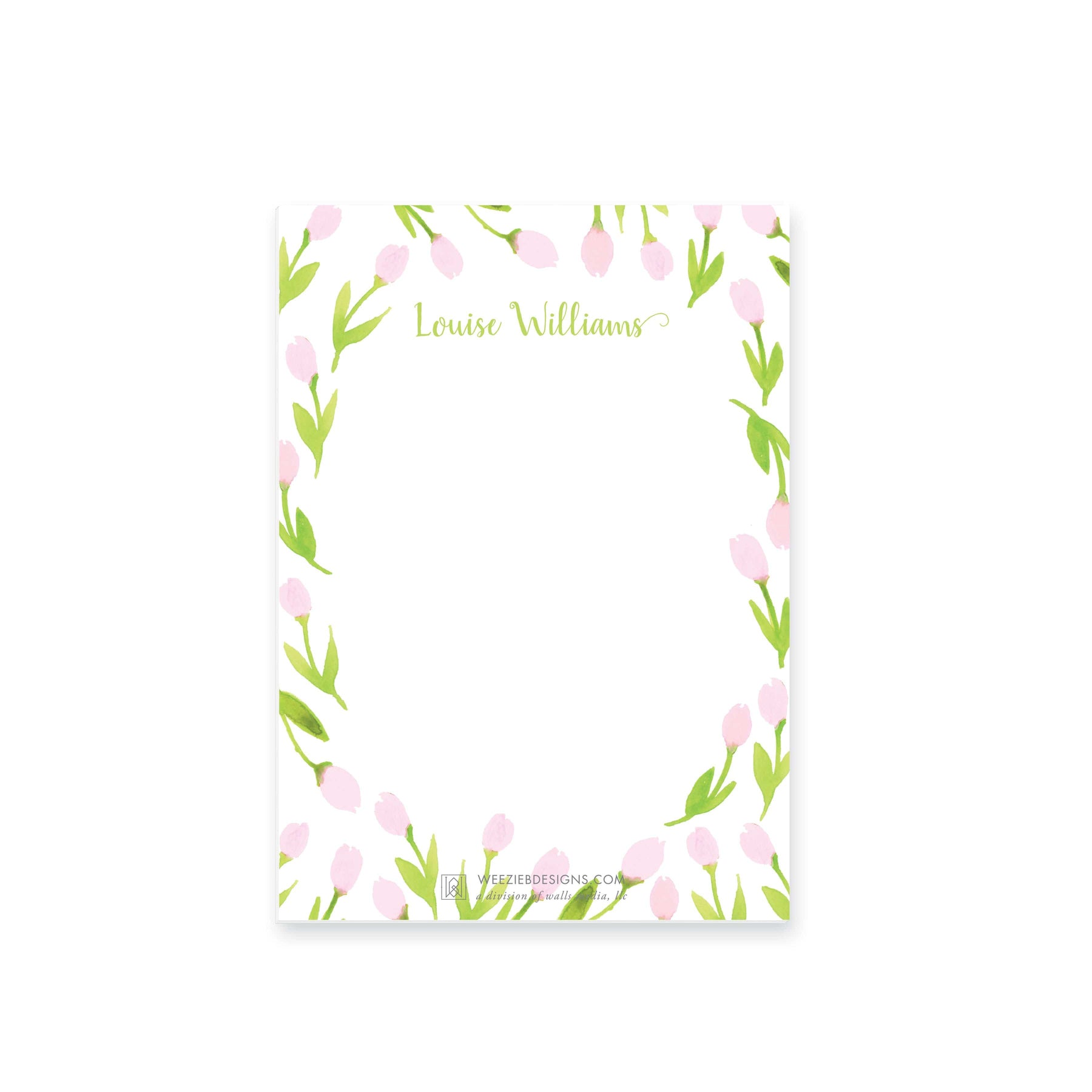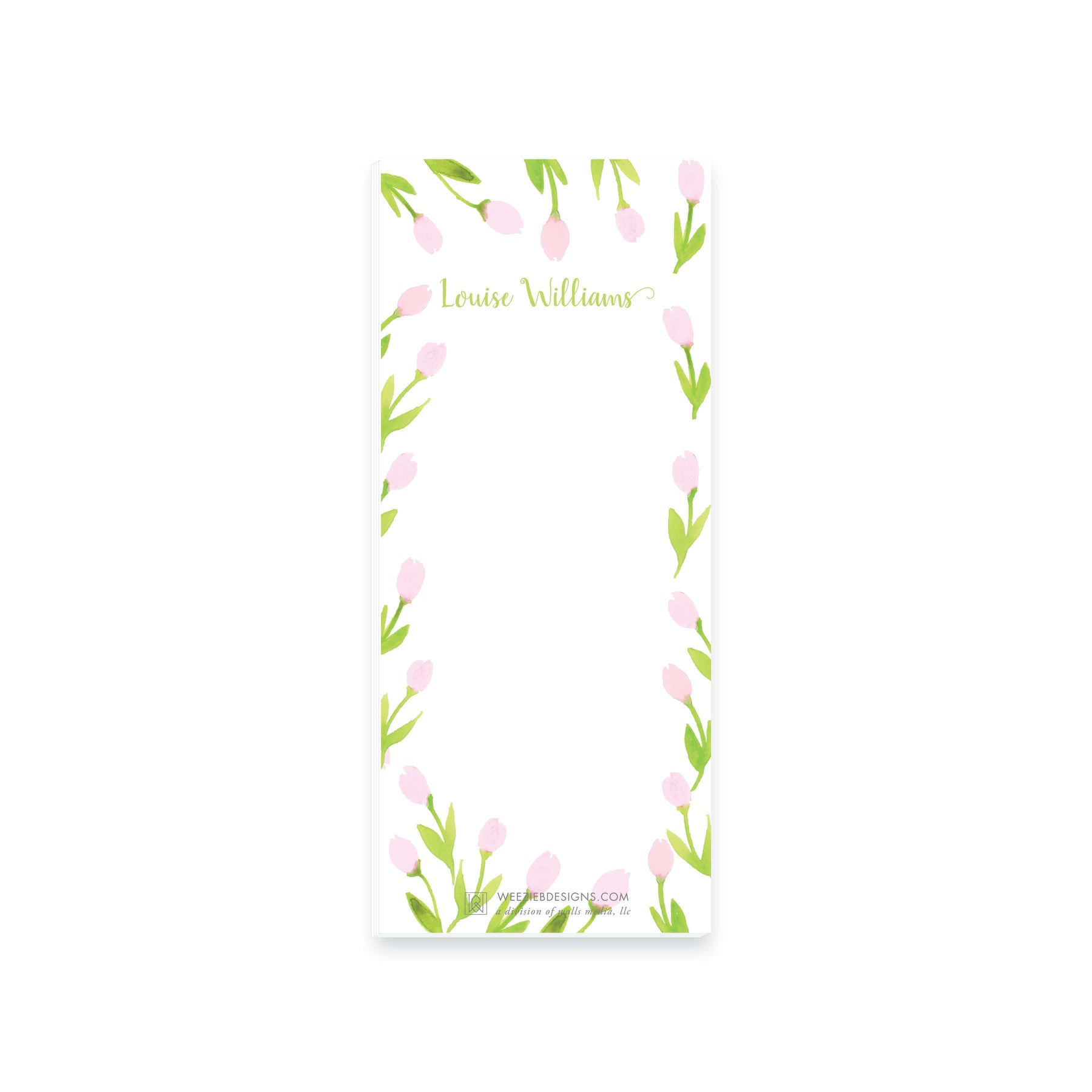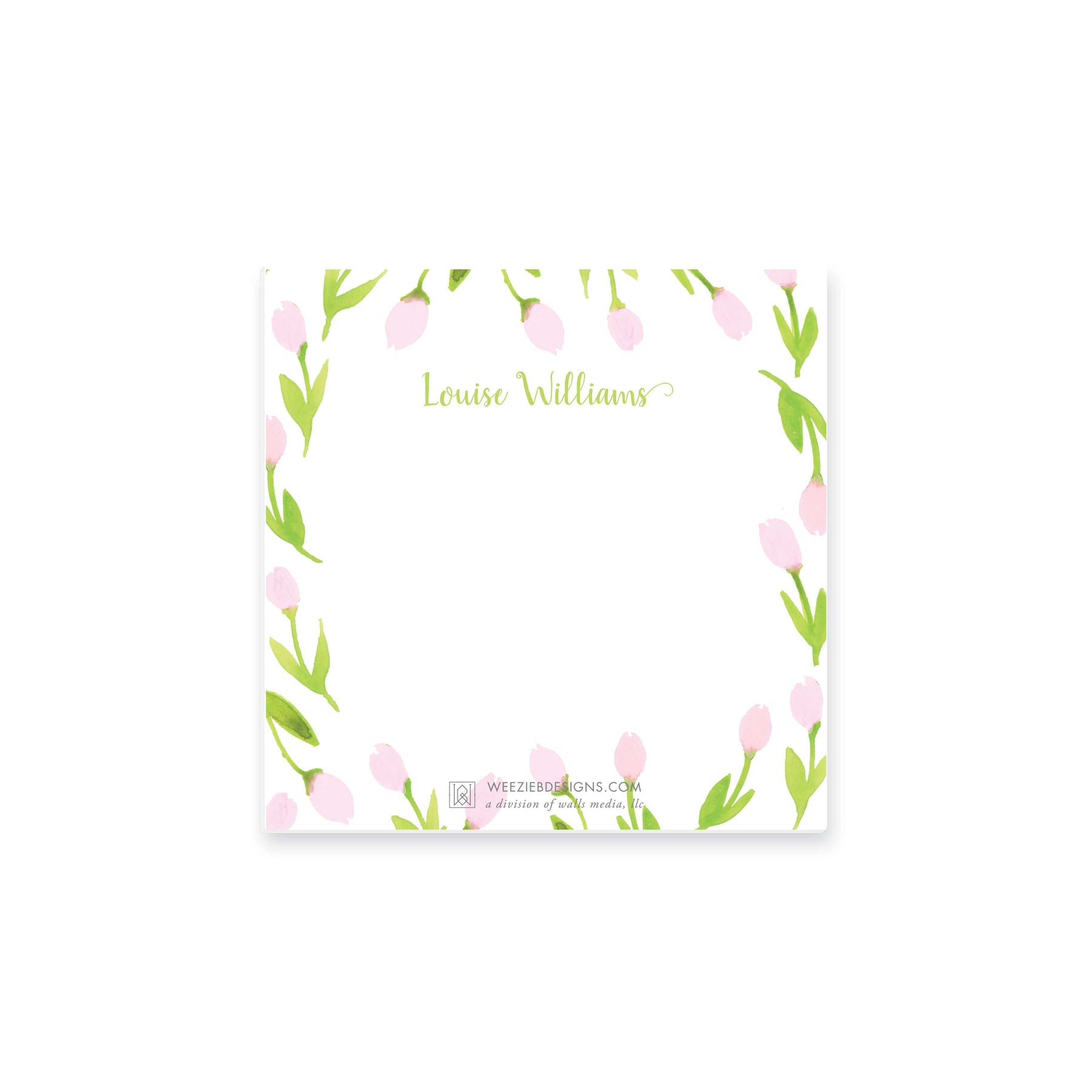 Our Garden of Tulips Personalized Notepad is a notepad surrounded by watercolor tulips. These watercolor pink tulips are a pretty pink and green way to write a note!