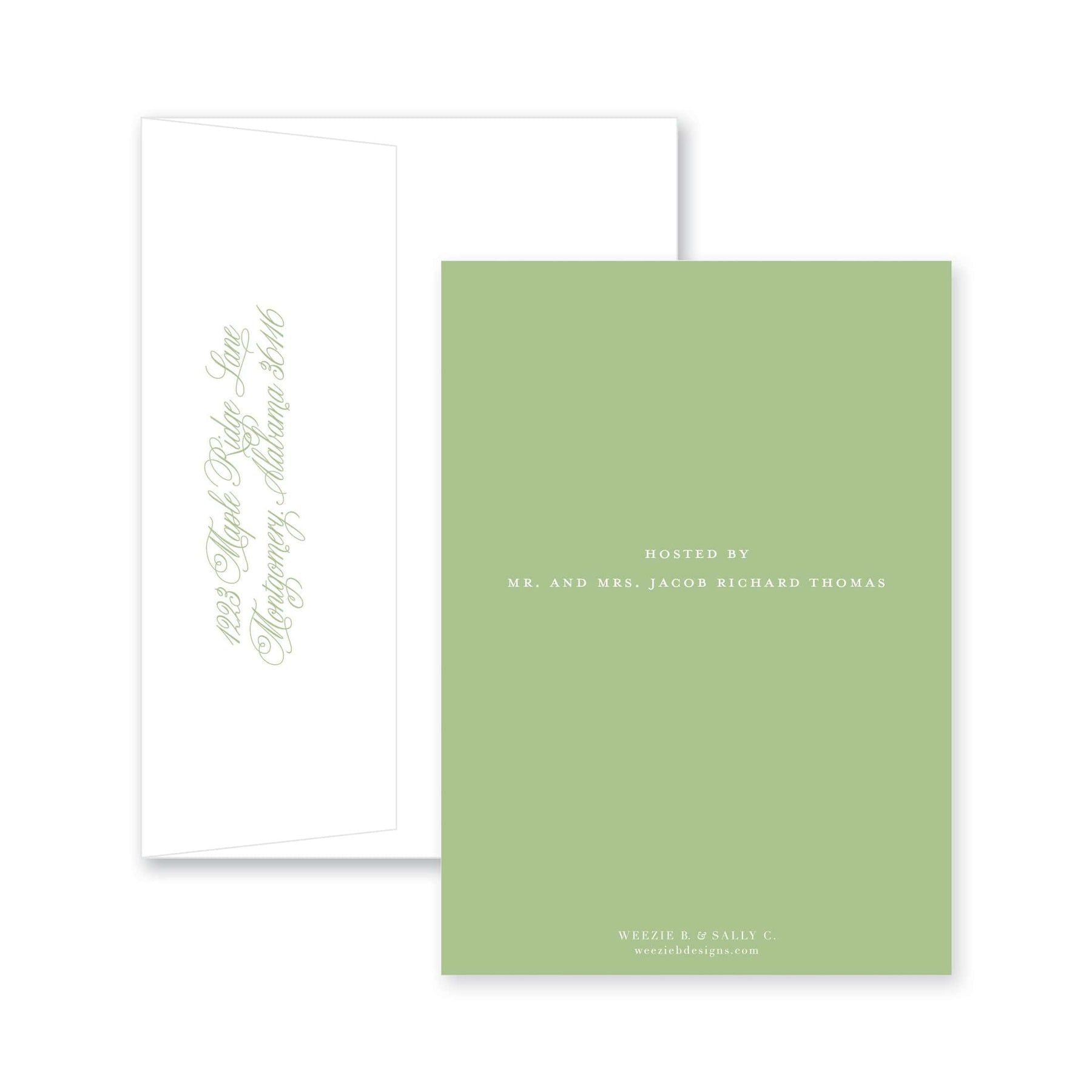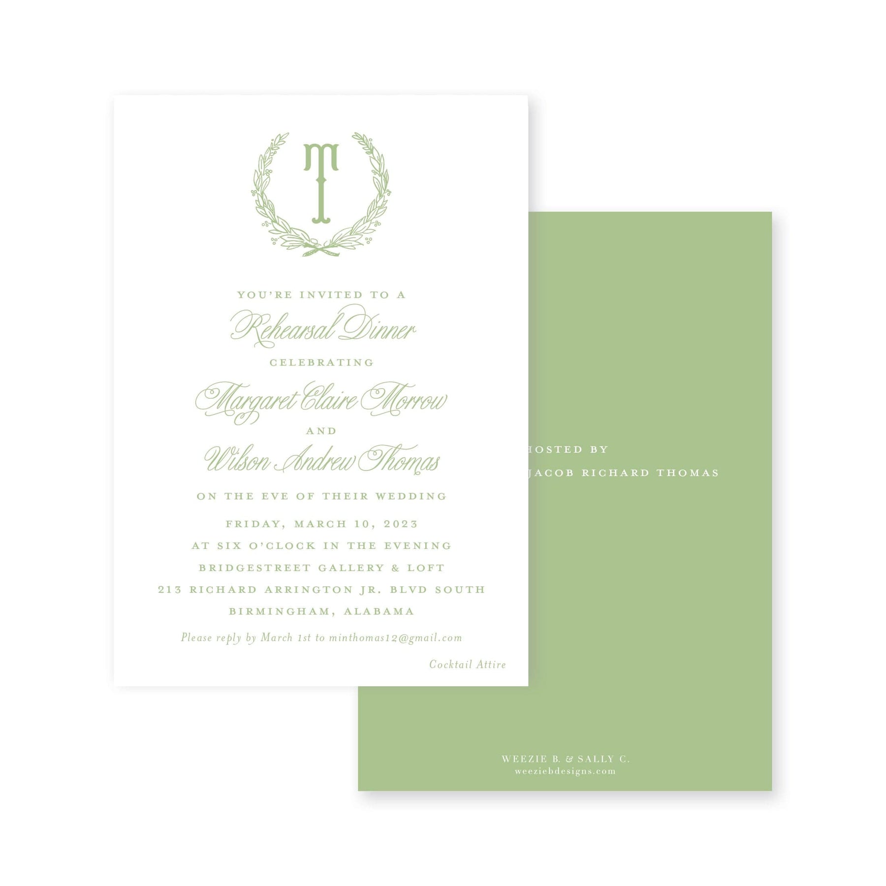 Our Fancy Laurel Rehearsal Dinner Invitation is topped with our Crest 1 with you monogram initial. You can choose the color your using for your celebration and use this classic layout and traditional typeface for an elegant pre-wedding invitation!